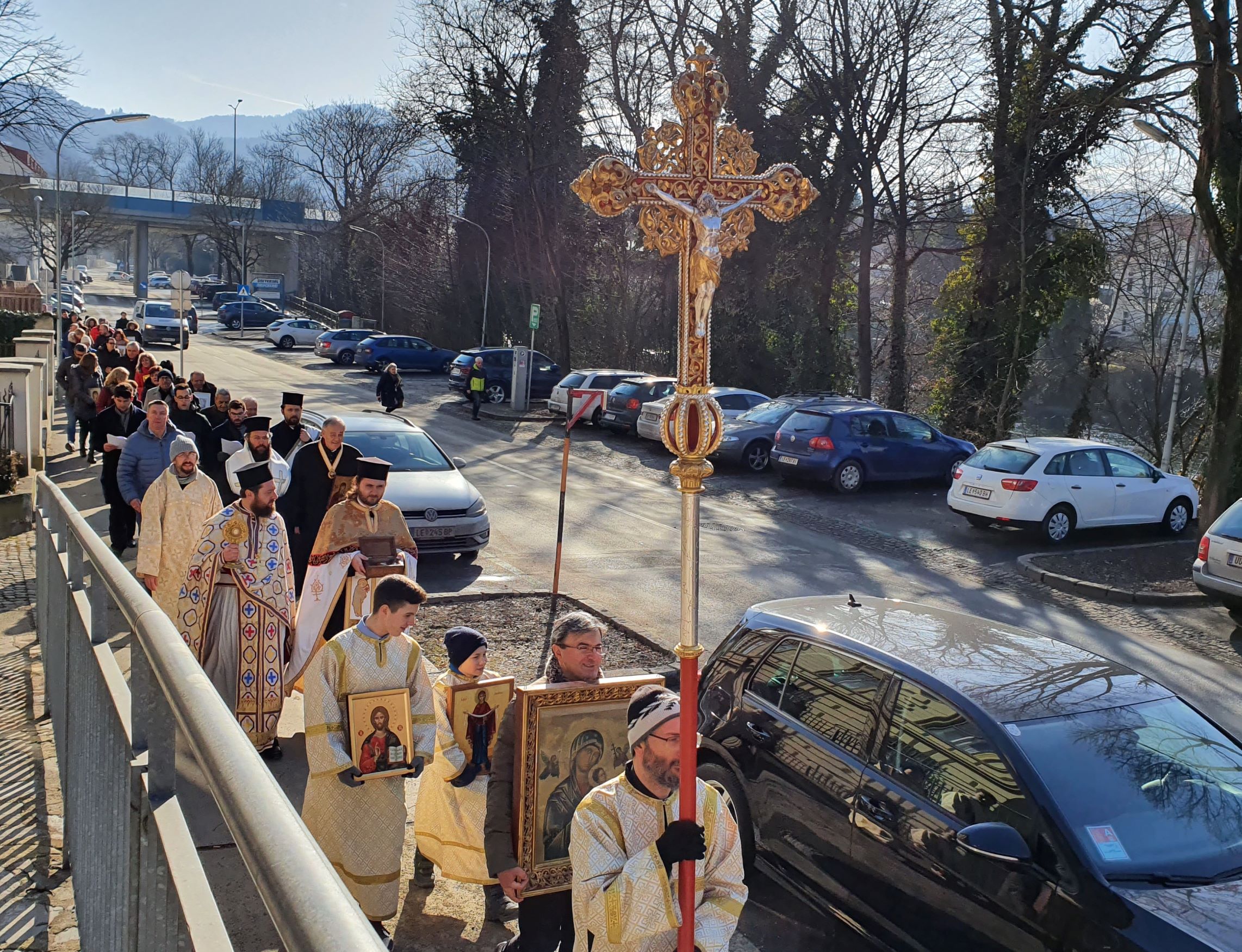 Im Anschluss an die Göttliche Liturgie folgte eine Prozession zur Waasenbrücke, wo auch heuer, wie schon in den letzten Jahren, die Wasserweihe an der Mur gefeiert wurde. Zahlreiche Mitglieder der Leobener Gemeinde, aber auch der Vizebürgermeister der Stadt Daniel Geiger sowie Vertreter des öffentlichen Lebens waren gekommen, um die Erscheinung Christi zu feiern. Metropolit Arsenios dankte ihnen für ihre Anwesenheit und zeigte sich erfreut darüber, dass die Tradition der Wasserweihe an der Mur bereits so viele Jahre besteht.