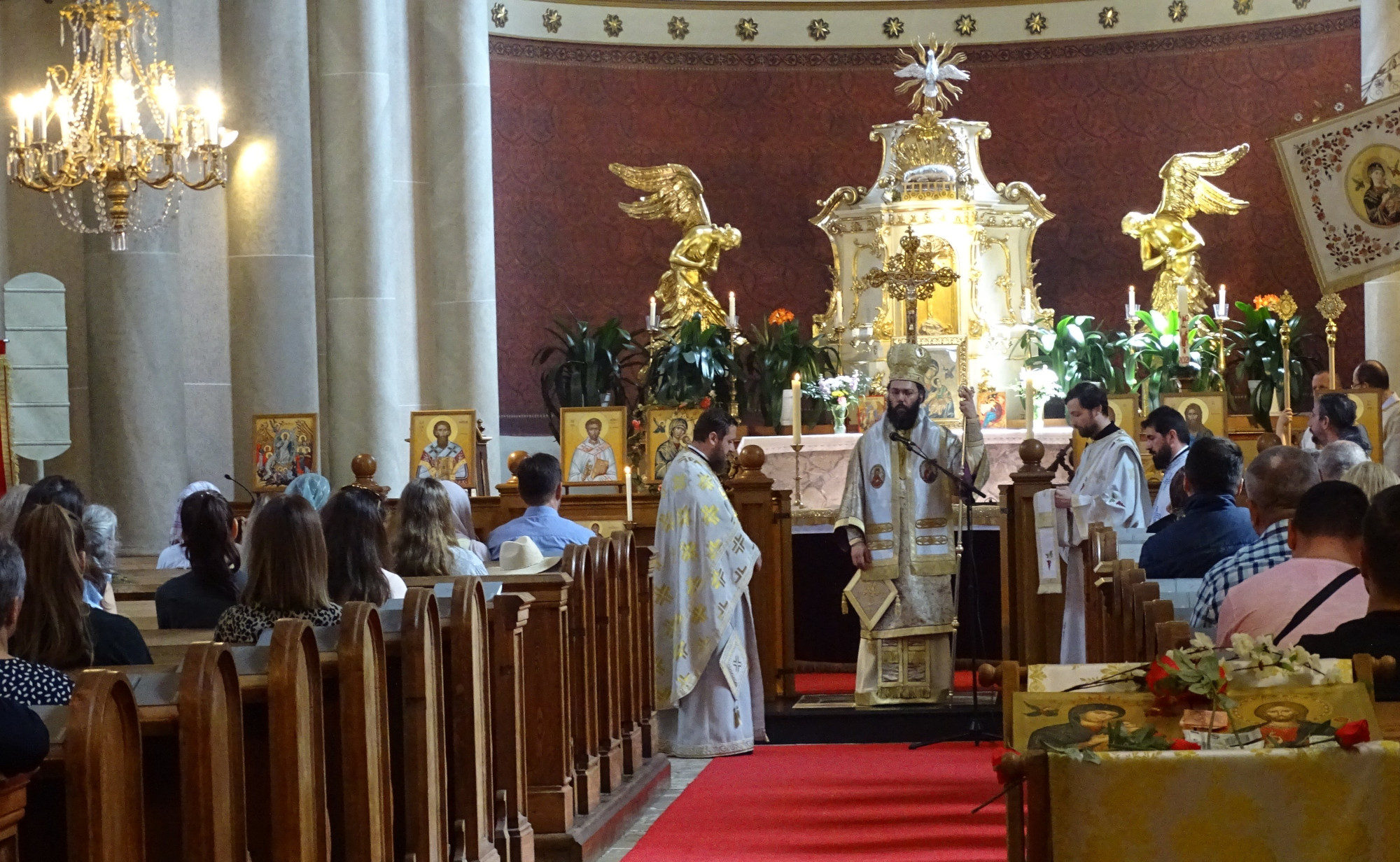 Am Ende der Liturgie dankte der Metropolit Erzpriester Sladjan Vasic für die großen Bemühungen um den Aufbau der Gemeinde und beglückwünschte ihn zu den Fortschritten. Er dankte auch dem Kustos der Gemeinde, Herrn Karl Mlinar und seinem Team aus motivierten freiwilligen Helfern, welche sich immer so fürsorglich um die Kirche und ihre Besucher bemühen. Schließlich begrüßte er Erzpriester Dimitrios Makris und die Gläubigen aus Graz, welche in brüderlicher und freundschaftlicher Verbundenheit gekommen waren, um mit der Leobener Gemeinde ihr Gemeindefest zu feiern.