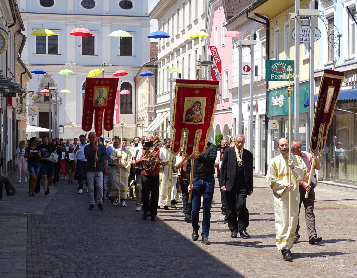 Nach der Liturgie wurde wie jedes Jahr die Ikone der Hl. Maria, Mutter von der immer-währenden Hilfe in feierlicher Prozession durch die Stadt getragen. Neben den Gesängen des Kirchenvolkes wurde die Prozession auch von der Bläsergruppe Rudolf Strauß begleitet. Vor der Pestsäule hielt die Prozession an und es wurde für die Stadt und ihre Bewohner und in diesem Jahr besonders um Schutz vor Krankheit und um Heilung gebetet.