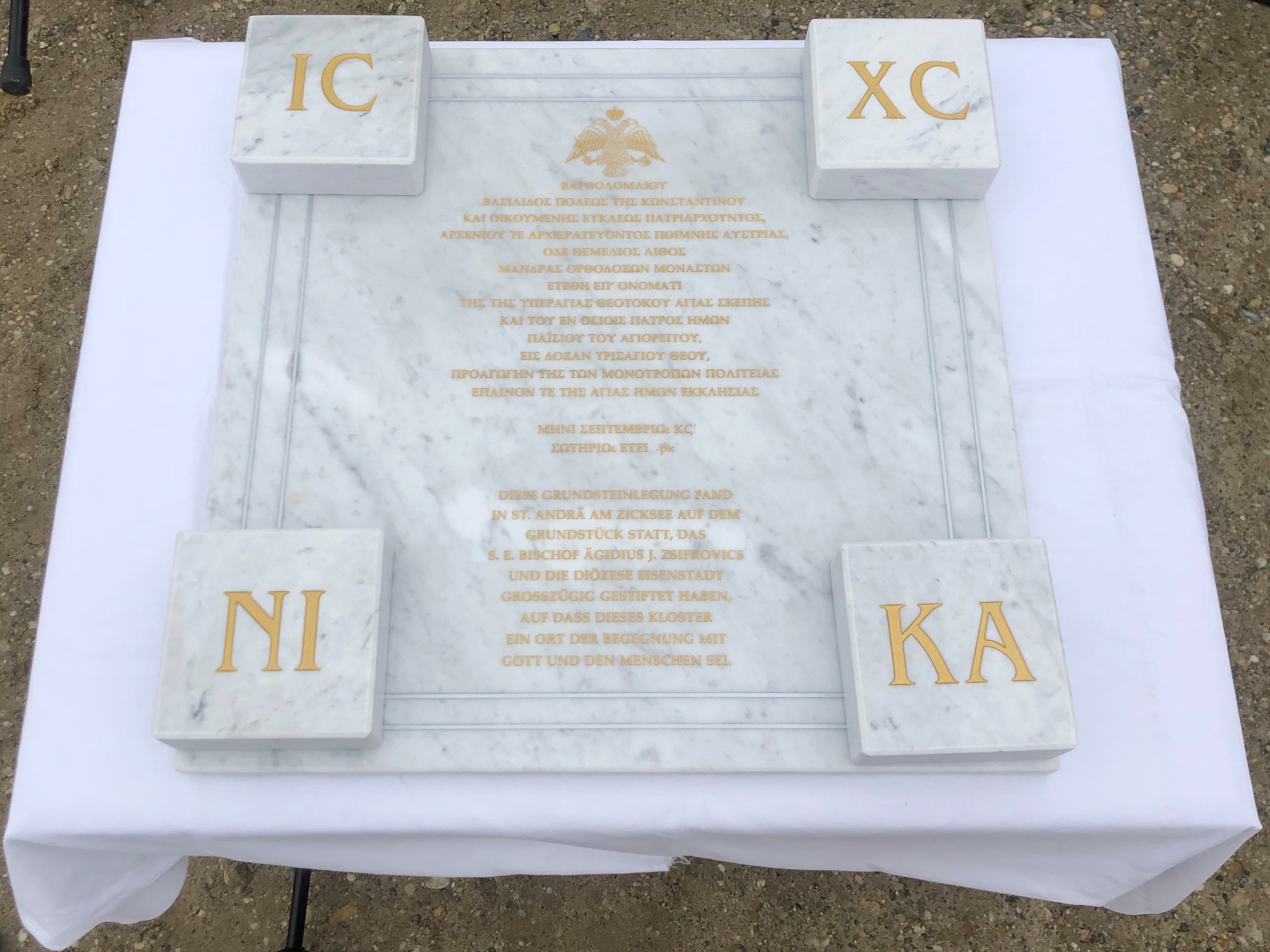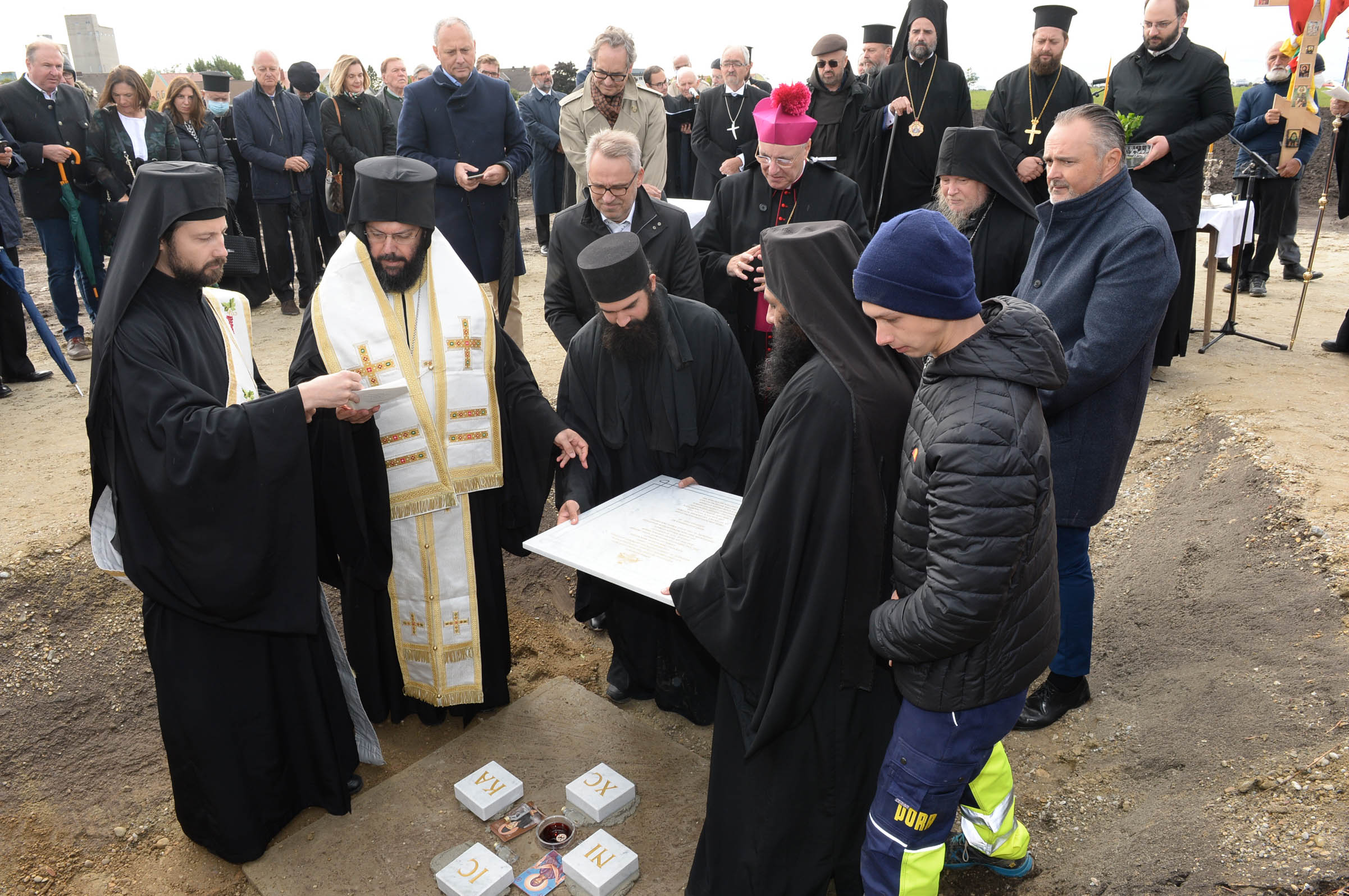 Der Grundstein wurde gelegt von Metropolit Arsenios, Landeshauptmann Hans Peter Doskozil, Bischof Ägidius Zsifkovics von Eisenstadt, dem Abt des Klosters Archimandrit Paisios und dem St. Andräer Bürgermeister Andreas Sattler.