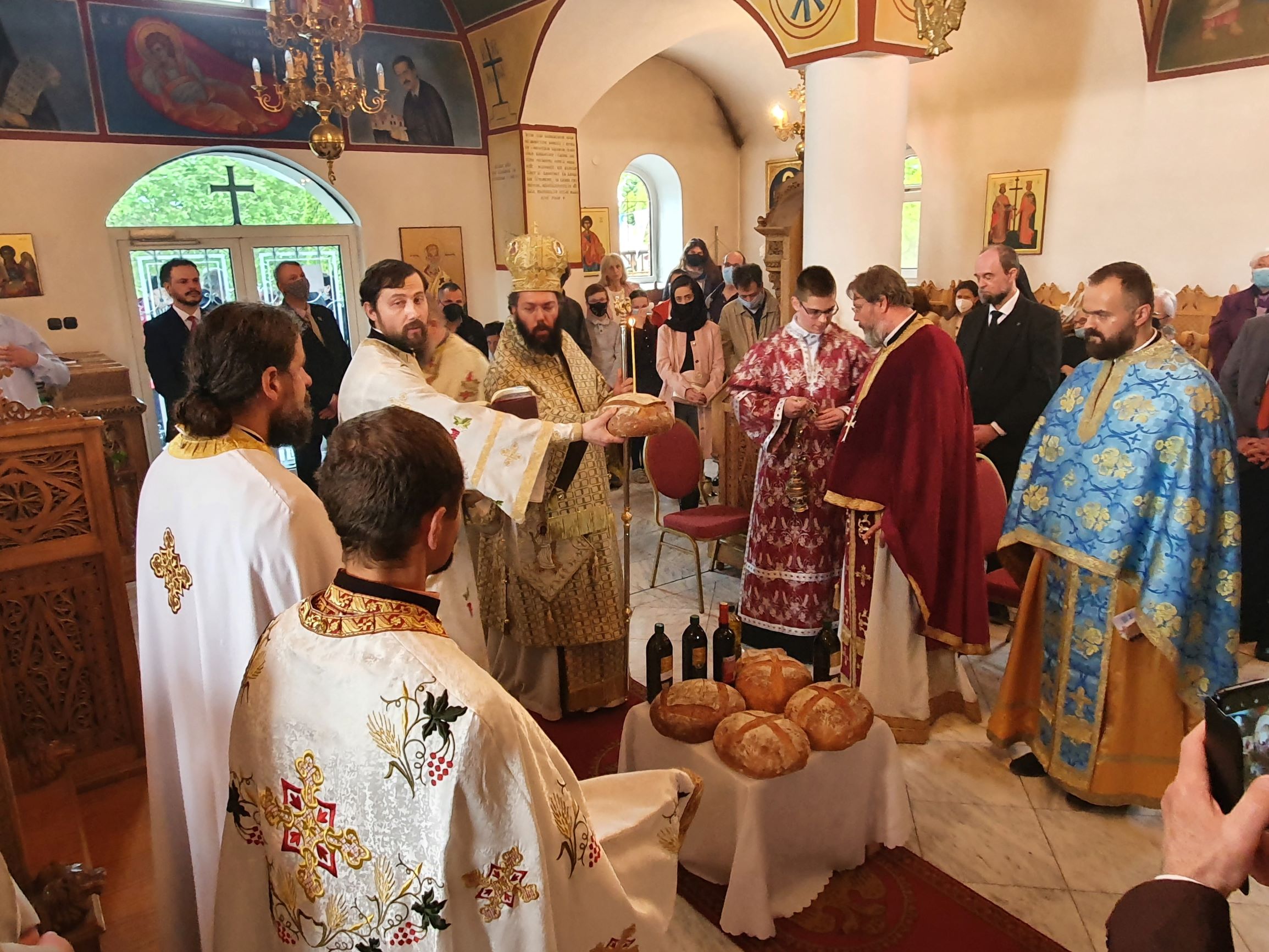 Am Ende der Göttlichen Liturgie wurde eine Artoklasie gefeiert sowie ein Trishagion für den im Jahr 2018 verstorbenen P. Josef Kalota und für die Verstorbenen der Gemeinde. Im Anschluss eröffnete Metropolit Arsenios einen überdachten Raum neben der Gemeindekirche, der künftig als Begegnungsraum und für den gemeinsamen Austausch dienen wird. Anlässlich des 25-jährigen Bestehens der Gemeinde zu den hll. Konstantin und Helena hatten einige Kinder aus der Gemeinde auch ein Programm vorbereitet, das großen Beifall fand. Metropolit Arsenios wünschte anlässlich des Jubiläums der Gemeinde in Belogiannisz auch in Zukunft „viele Jahre“ für ihren Einsatz für alle Menschen und P. Prodromos weiterhin viel Kraft und Gottes Segen für seinen Dienst im Exarchat von Ungarn und für die Kirche. Unter Einhaltung der geltenden Hygienemaßnahmen waren die Mitfeiernden anschließend zu einer Agape und gemeinsamem Austausch geladen.