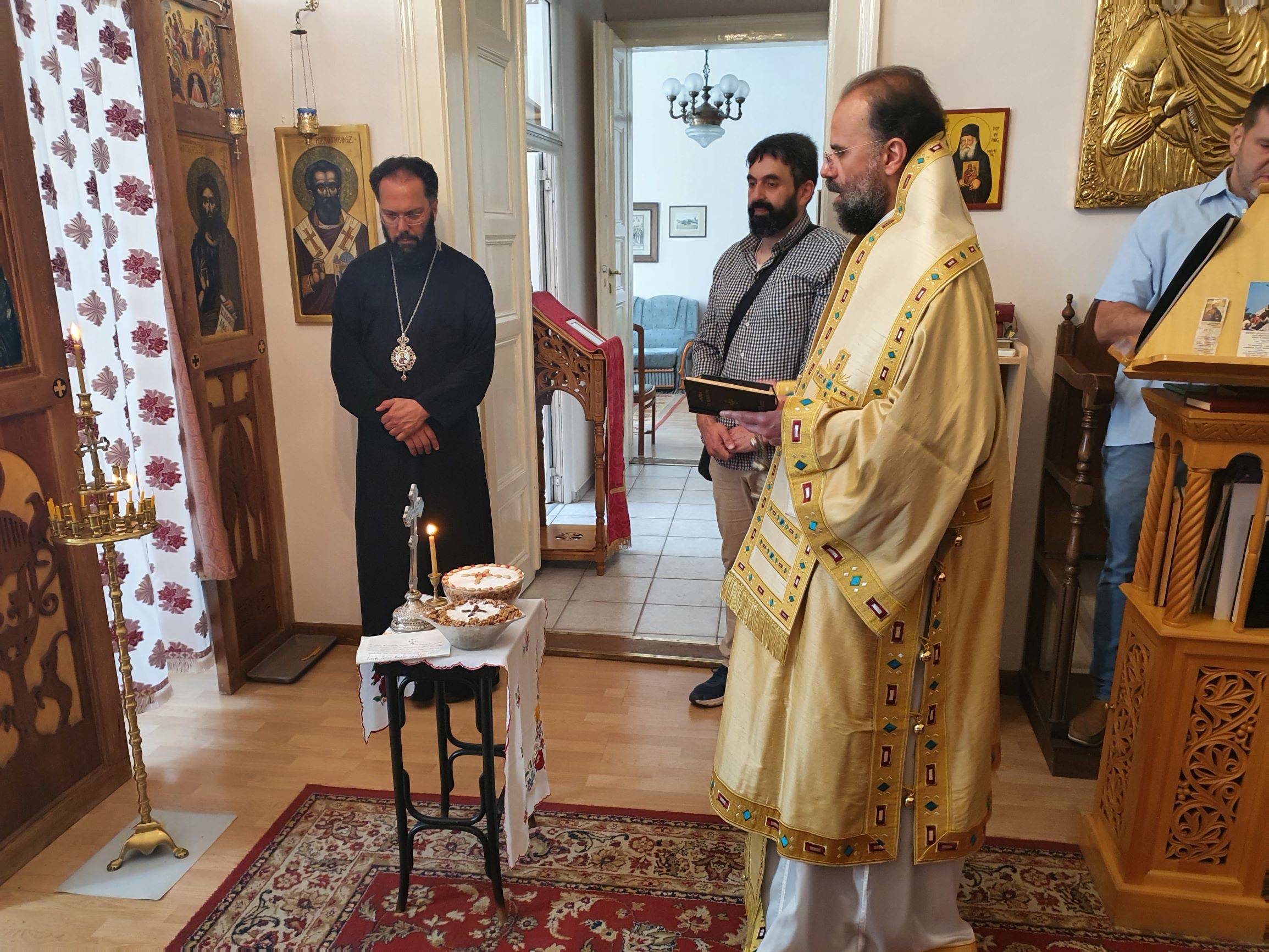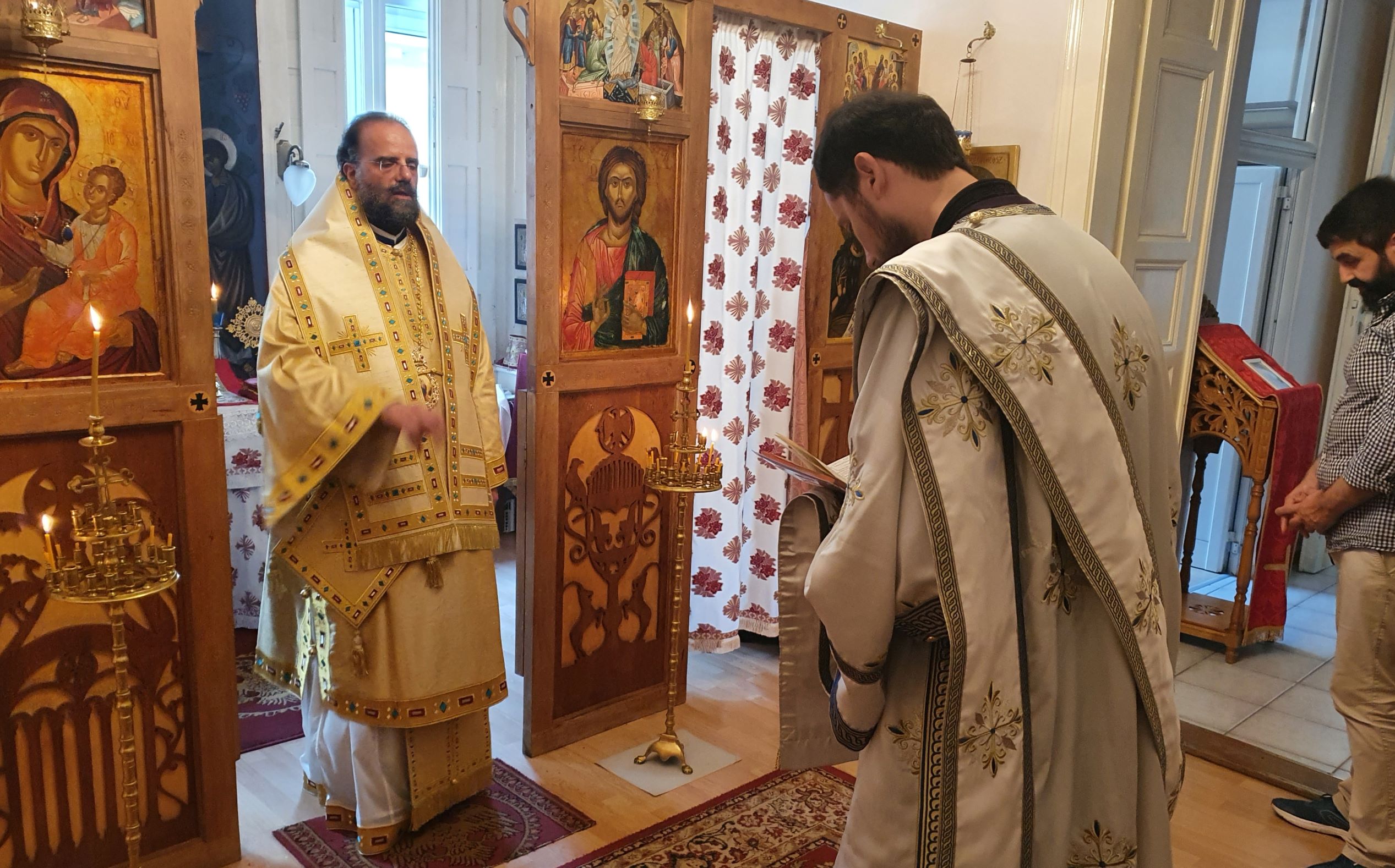 Am Samstag, den 19. Juni 2021, reiste Metropolit Arsenios von Austria nach Budapest. In der Kapelle zu den hll. Hierotheos und Stephan nahm er an der Göttlichen Liturgie teil, die Bischof Paisios von Apameia mit Erzdiakon Maximos Rugyko feierte. Neben Klerikern nahmen auch Gläubige des ungarischen Exarchats an der Liturgie teil und gratulierten Bischof Paisios zu seinem Namenstag.