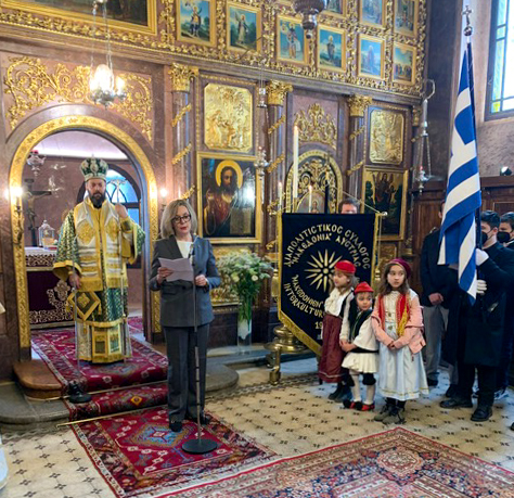 Die Botschafterin Griechenlands ging in ihrem Grußwort auf die überzeitliche Größe des Griechentums und den Kampf für die Freiheit ein. Auch heute tragen alle Griechinnen und Griechen Verantwortung für die Zukunft der Heimat und die Erhaltung der humanistischen Ideale in Europe und der ganzen Welt, so die Botschafterin.