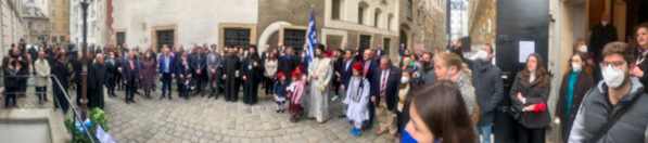 Im Anschluss folgte vor der Kirche zum hl. Georg ein Totengedenken für die Verstorbenen des griechischen Freiheitskampfes sowie die Niederlegung eines Kranzes am Grab von Rigas Feraios. Die Feier endete mit der griechischen Nationalhymne.