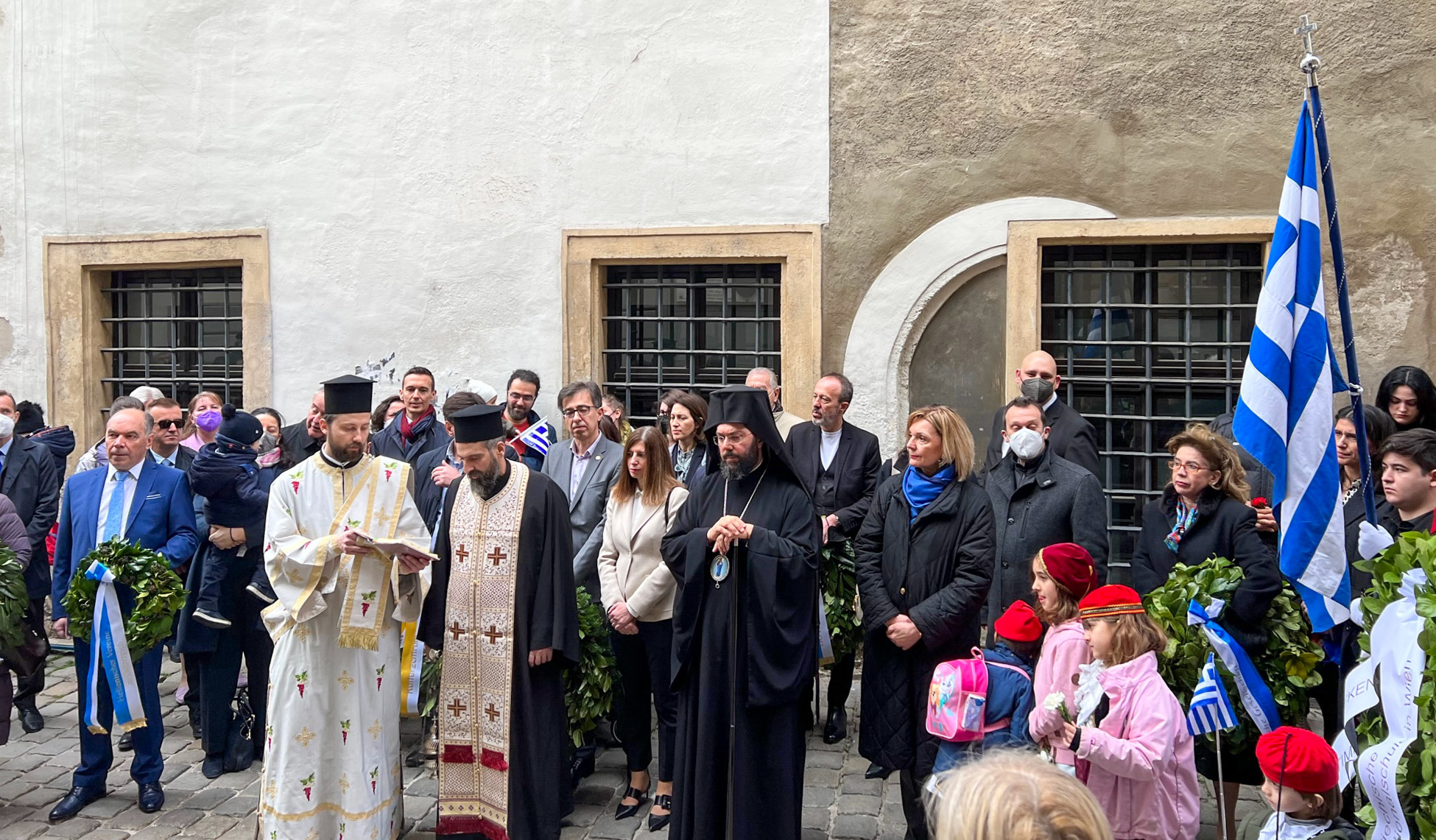 Außerdem beteten sie um ewige Ruhe der gefallenen Kämpfer der Griechischen Revolution, die vor 1821, vor 201 Jahren, ihren Anfang nahm. An der Doxologie anlässlich des Nationalfeiertags nahmen auch die Botschafterin Griechenlands, Catherine Koika, und die Botschafterin Zyperns, Elena Rapti, sowie weitere Vertreter des diplomatischen Korps teil, ebenso Schülerinnern und Schüler der Griechischen Nationalschule in Wien.