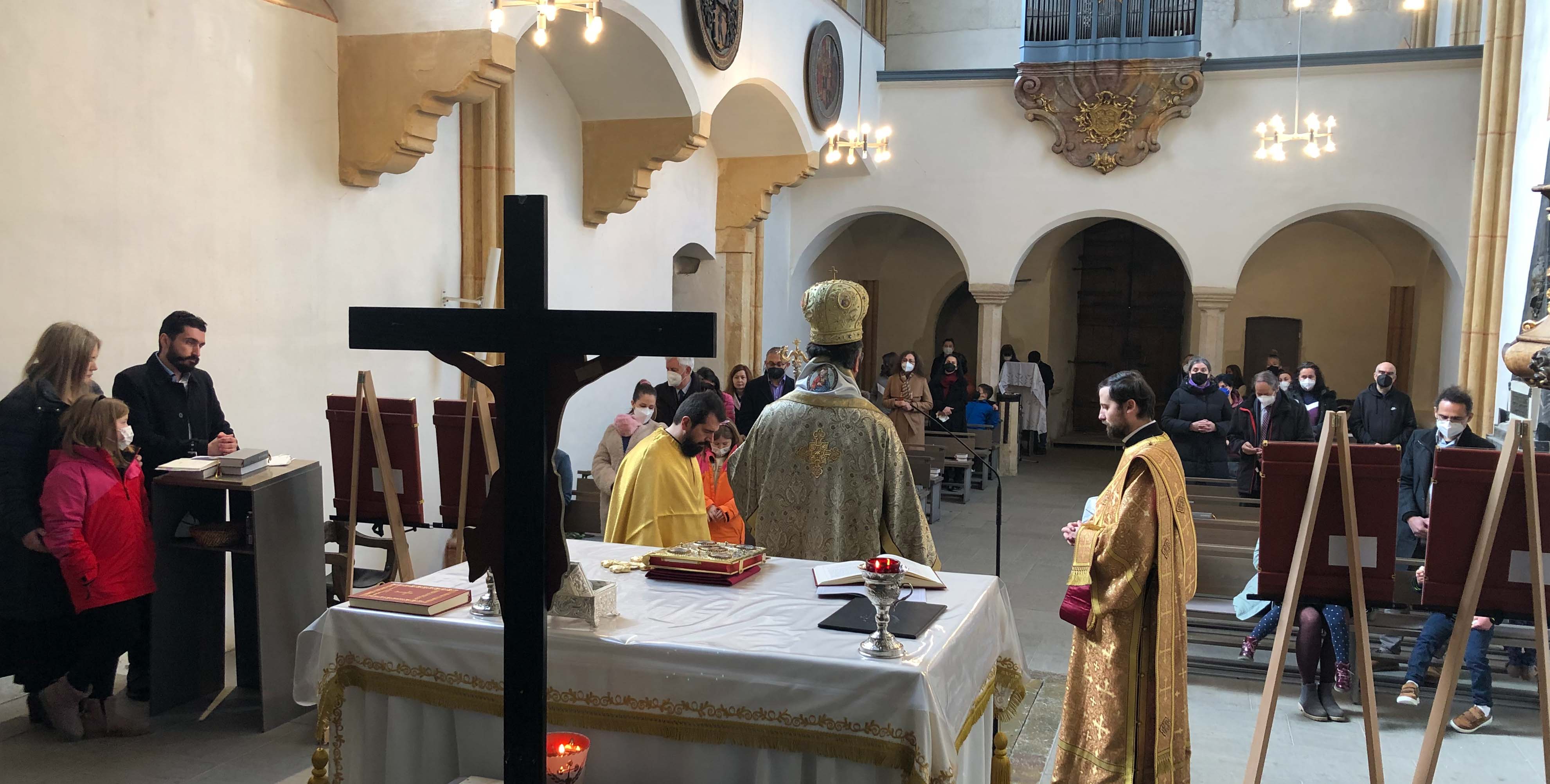 Metropolit Arsenios ging in seiner Predigt über das Sonntagsevangelium auch auf die hl. Maria von Ägypten ein, die von der Kirche am 5. Fastensonntag als besonderes Vorbild geehrt wird. Christus bereitet nicht nur Seine Jünger auf Sein Leiden, Seinen Tod und Seine Auferstehung vor, sondern auch uns, so der Metropolit. Dabei soll als Kriterium für die Nachfolge das gelten, was Christus den beiden Jüngern im Streit um die Rangfolge sagte: „Bei euch aber soll es nicht so sein, sondern wer bei euch groß sein will, der soll euer Diener sein, und wer bei euch der Erste sein will, soll der Sklave aller sein.“ Als Erben des Reiches Gottes dürfen wir uns also nicht mit Ehren dieser Welt auszeichnen, sondern müssen uns „unterscheiden“, mahnte der Metropolit. Es gehe nicht um Herrschaft und Macht, sondern um ein großmütiges Herz voller Liebe, das sich mit Hingabe und aufopfernd für die Schwestern und Brüder hingibt. Die heilige Maria von Ägypten ist dabei ein besonders eindrucksvolles Vorbild, führte Metropolit Arsenios aus. Sie kehrte ihrem sündigen Leben entschieden den Rücken zu, kehrte reumütig um und zog mit Gebet und Fasten in die Wüste, um allein Christus nachzufolgen und tugendhaft zu leben. Der Metropolit erinnerte eindrücklich daran, dass nach den Vätern der Kirche die Selbsterkenntnis der eigenen Sündhaftigkeit der Beginn der Umkehr ist. Als Gläubige sind wir eingeladen, zu Kindern des Lichts der Auferstehung zu werden, wenn wir in wenigen Tagen das Osterfest begehen, dessen Name „Pascha“ eigentlich „Übergang“ meint, den Übergang vom sündhaften Leben hin zum Leben in Christus.