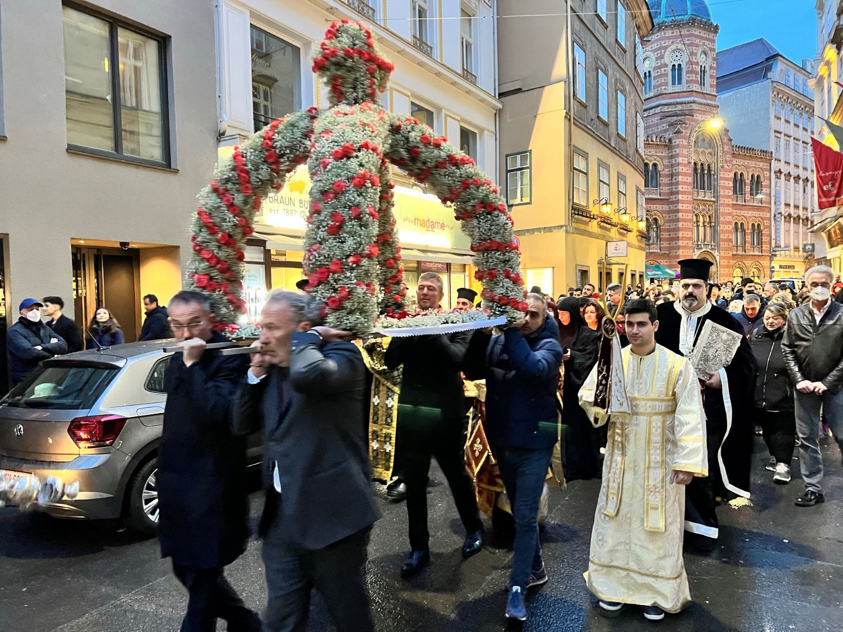 Die weiteren Gottesdienste der Karwoche in Wien fanden in der Kathedrale zur Heiligen Dreifaltigkeit statt. So wurde am Freitagvormittag nach der Lesung der großen Stunden die Kreuzabnahme Christi gefeiert und am Abend das Grab Christi in feierlicher Prozession durch die Straßen Wiens getragen. Dieser Gottesdienst wurde in diesem Jahr auch vom ORFIII live übertragen und konnte so von zahlreichen interessierten Zuschauern verfolgt werden. Am Vormittag des Karsamstags folgte die Feier der sog. „kleinen Auferstehung“ in der Vesper und der Liturgie des Hl. Basilius des Großen. In der Osternacht schließlich wurden in der Kathedrale zur Hl. Dreifaltigkeit die feierlichen Gottesdienste zur Auferstehung Christi zelebriert, gemeinsam mit der Kerzenprozession um die Kerze und den Gesängen des „Christus ist auferstanden!“