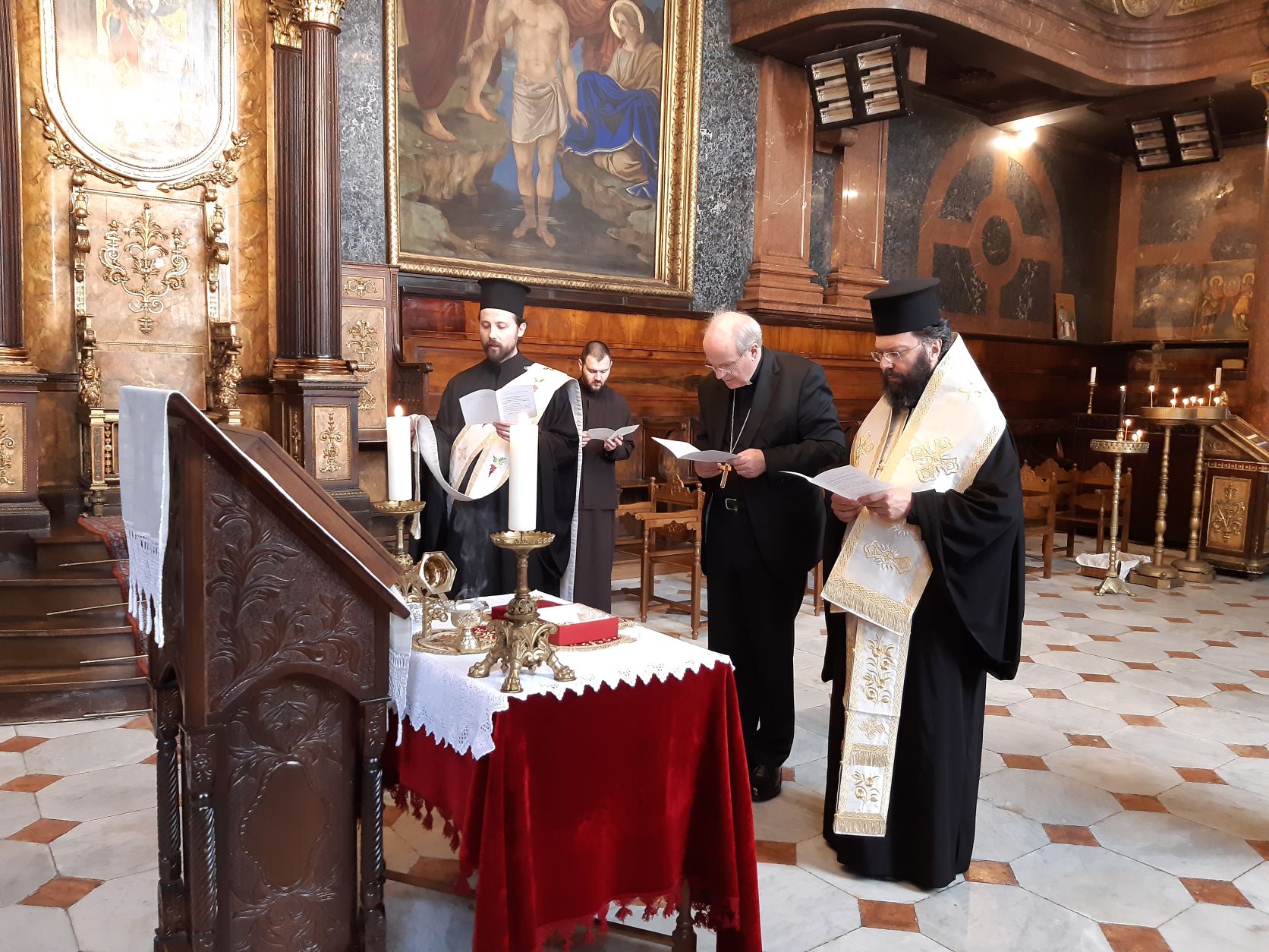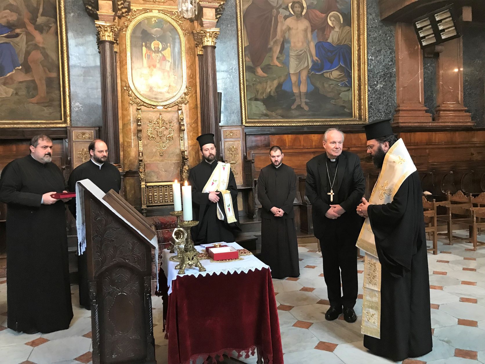 Am Dienstag, 10. Mai, wurde Kardinal Christoph Schönborn von Metropolit Arsenios von Austria feierlich in der griechisch-orthodoxen Kathedrale zur Heiligen Dreifaltigkeit empfangen. Anlass war die Schenkung von Reliquien des Heiligen Kirchenvaters Gregors des Theologen seitens des Kardinals für die Metropolis von Austria und für das Kloster Maria Schutz im Burgenland. Die Überreichung der verehrungswürdigen Reliquien im Beisein mehrerer Kleriker der Metropolis von Austria wurde von einem gemeinsamen Gebet und deren Verehrung umrahmt. Metropolit Arsenios zeigte sich durch dieses nächstenliebende Geschenk der katholischen Schwesterkirche gerührt und gleichermaßen hoch erfreut. Aufrichtig dankte er Kardinal Christoph Schönborn für dieses Zeichen der Liebe in Christus und der gelebten Ökumene in Österreich. Nach der Überreichung hatten Metropolit Arsenios und Kardinal Schönborn die Gelegenheit, weitere kirchliche und pastorale Themen im Zuge eines gemeinsamen Mittagessens zu erörtern.