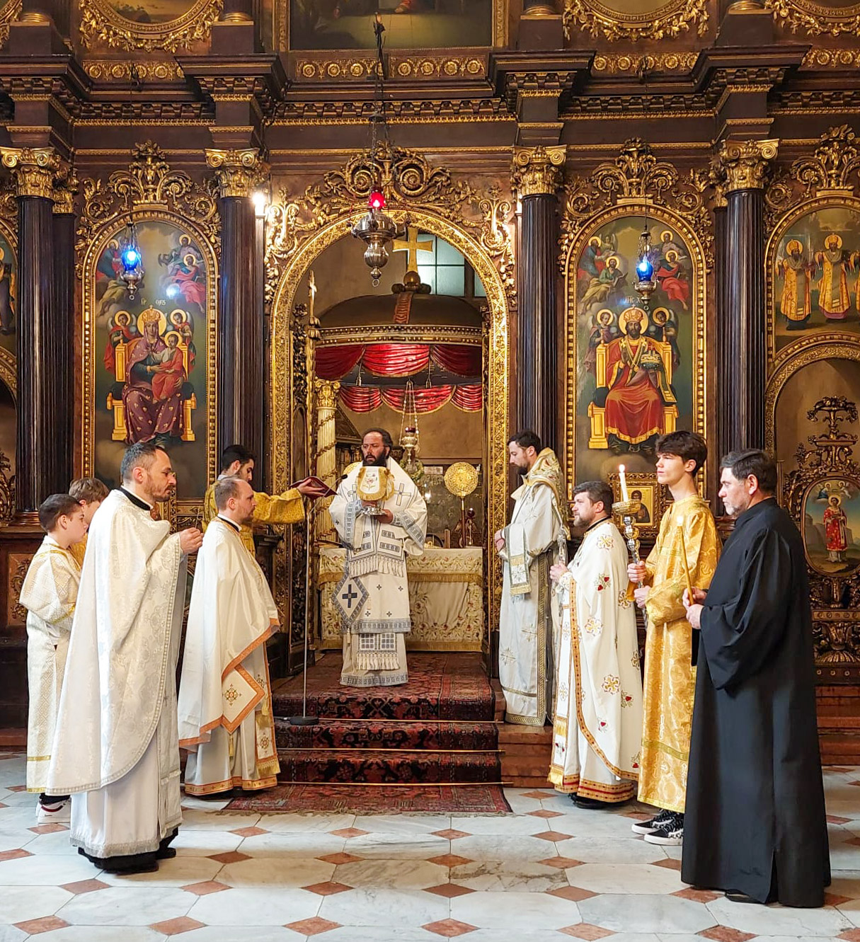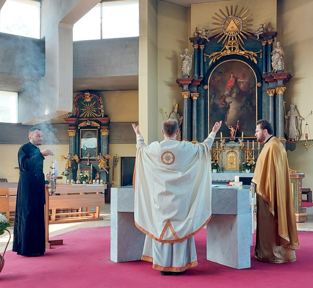 Am Sonntag, den 15. Mai 2022, feierte Seine Eminenz Metropolit Arsenios in der Kathedrale zur Heiligen Dreifaltigkeit in Wien gemeinsam mit der ukrainischen Gemeinde die Göttliche Liturgie. Mit ihm zelebrierten Priester-Ökonom Yuriy Strugov, Priester-Ökonom Mykola Lesiuk, dem neuen Priester Kornelii Khrushch sowie Erzdiakon Maximos Rugyko. Metropolit Arsenios überbrachte der ukrainischen Gemeinde österliche Grüße und betete um ihre geistige Stärkung und Trost, besonders jener, die von dem Krieg in der Ukraine betroffen sind. Für alle Menschen, die im Krieg gestorben sind, beteten sie um ewige Ruhe.