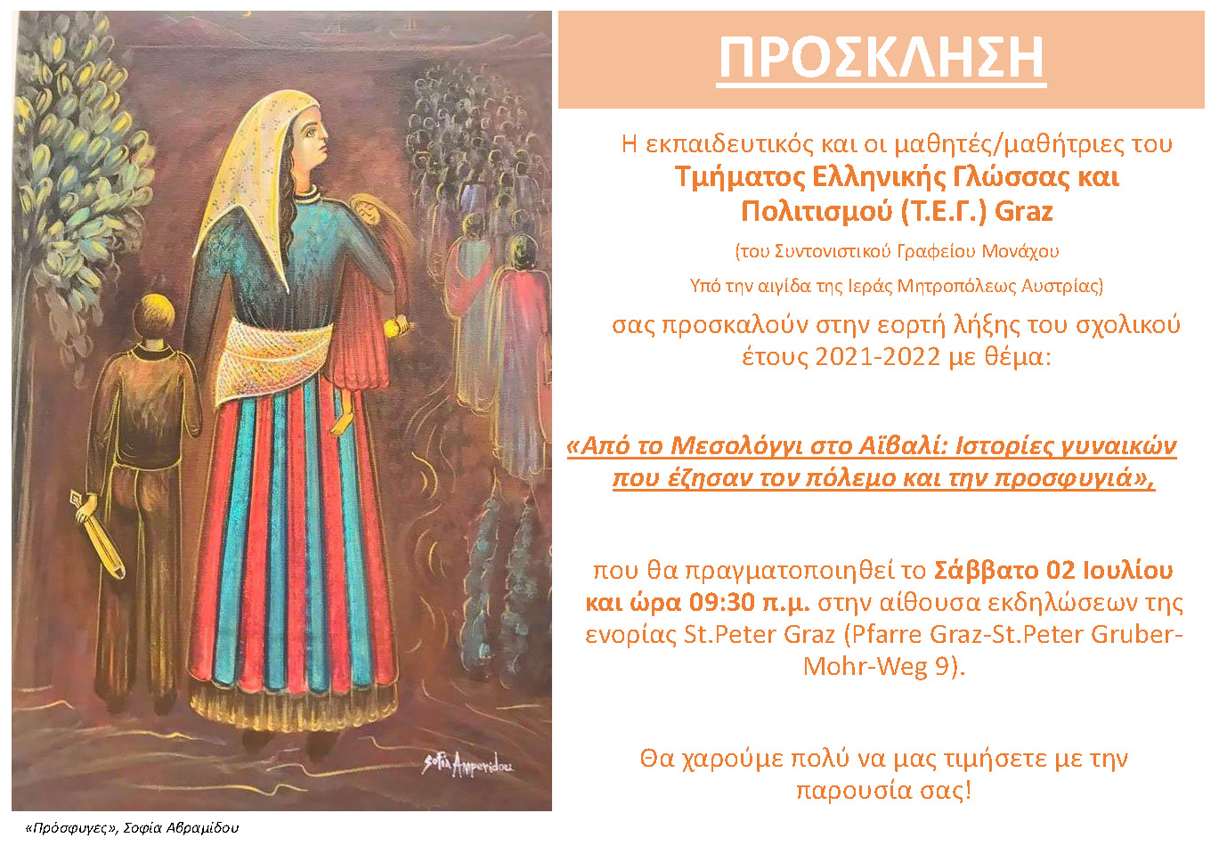 Am Samstag, den 2. Juli 2022, wurde in der Grazer Griechischen Schule feierlich der Schulschluss begangen. Die Festveranstaltung stand unter dem Titel “Von Mesologni nach Aivali: Geschichten von Frauen, die Krieg und Flucht erlebten”. Nach zwei Jahren Pandemie, in der sich viele wie “Freie Gefangene” fühlten, und in einer Zeit, in der sich die Welt mit einem Krieg an den Grenzen Europas auseinandersetzuen muss, haben sich die Schülerinnen und Schüler der Griechischen Schule in Graz aus literarischer Sicht mit Frauen und ihren Geschichten in Krieg und Flucht beschäftigt. Ein Video der Veranstaltung finden Sie auf dem YouTube-Kanal der Metropolis von Austria.