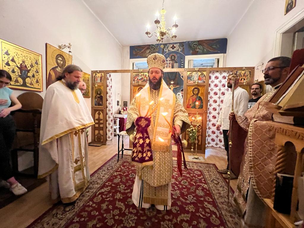 Am darauffolgenden Tag zelebrierte der Metropolit in der Kapelle der Heiligen Patrone Ungarns – des Königs Stephan und des Bischofs Hierotheos – gemeinsam mit Erzpriester Grigorios Nácsinák, Priester Josef Ötvös und Erzdiakon Maximos Rugyko, sowie dem gläubigen Volk des Exarchats die Göttliche Liturgie, in welcher insbesondere des ungarischen Landes und Volkes und derer, die es regieren und beschützen gedacht wurde.