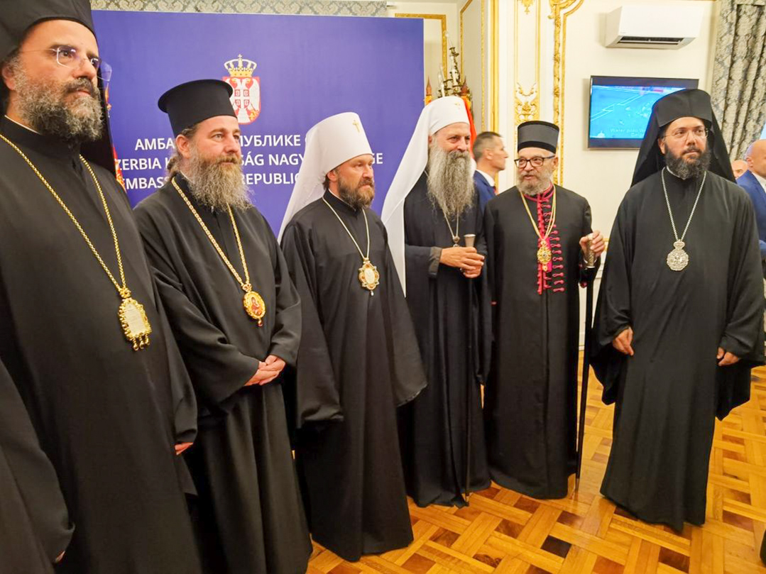 Seine Eminenz Metropolit Arsenios von Austria und Exarch von Ungarn traf am Samstag, den 3. September, gemeinsam mit Seiner Exzellenz Bischof Paisios von Apameia mit dem serbischen Patriarchen zusammen und feierten mit diesem eine Doxologie in der serbischen Kirche zum hl. Georg in Budapest. Anschließend nahmen sie am offiziellen Empfang des Patriarchen in der serbischen Botschaft in Ungarn teil, zu dem sie vom Botschafter, Ivan Todorov, eingeladen worden waren. Metropolit Arsenios überbrachte dem Patriarchen die brüderlichen Grüße und Segenswünsche Seiner Allheiligkeit des Ökumenischen Patriarchen sowie Glückwünsche des Klerus und der Gläubigen des Exarchats von Ungarn. In einem Gespräch mit dem Patriarchen und dem Metropoliten von Bačka, Irinej (Bulovic), erörterte Metropolit Arsenios aktuelle Fragen der Orthodoxen Kirche. Am Empfang nahmen neben Hierarchen der Orthodoxen Kirche in Ungarn sowie Vertreter des politischen und diplomatischen Dienstes sowie Gläubige teil. Metropolit Arsenios dankte Bischof Lukijan für die Einladung und gratulierte diesen zu den beiden Jubiläen.