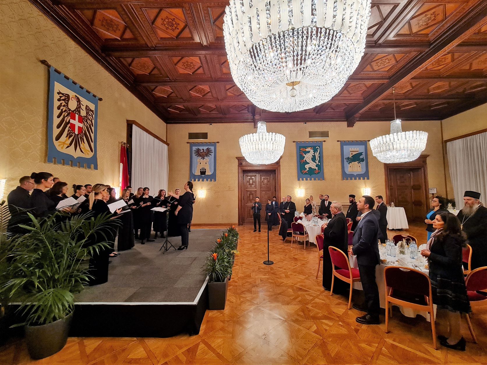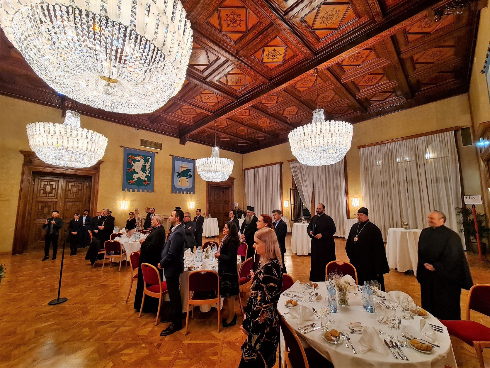 Der Empfang begann mit einem gemeinsamen orthodoxen Gebet, das vom Chor der serbisch-orthodoxen Kirche in Wien begleitet wurde. Darin wurde für die Stadt Wien, das Land Österreich und den Frieden auf der Welt gebetet. Im Anschluss daran richtete Dr. Markus Wölbitsch-Milan Grußworte an die Anwesenden. Er brachte seine Freude zum Ausdruck über diesen in der Geschichte des Rathauses wohl so noch nie erfolgten Empfang und betonte die gute Zusammenarbeit der ÖVP mit den Kirchen und insbesondere auch der Orthodoxie in der Vergangenheit und Gegenwart. Die Synergie sei auch in Zukunft ein wichtiger Aspekt für die Entfaltung der österreichischen Gesellschaft.