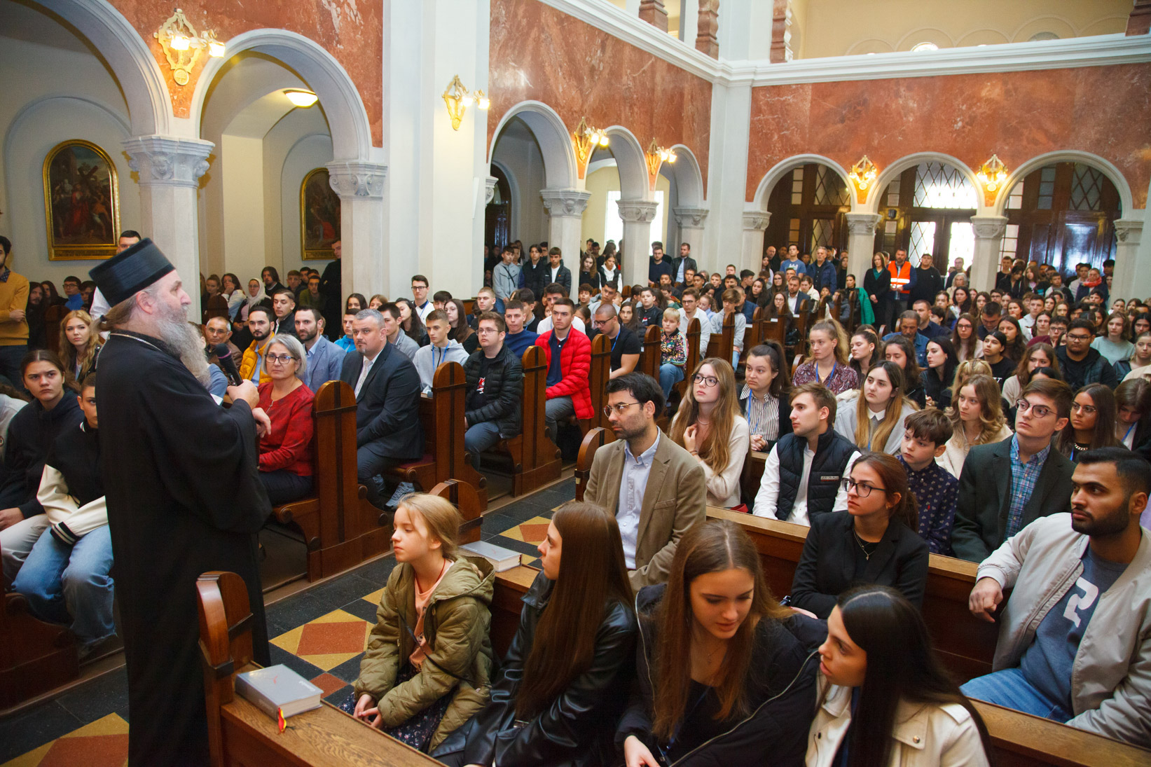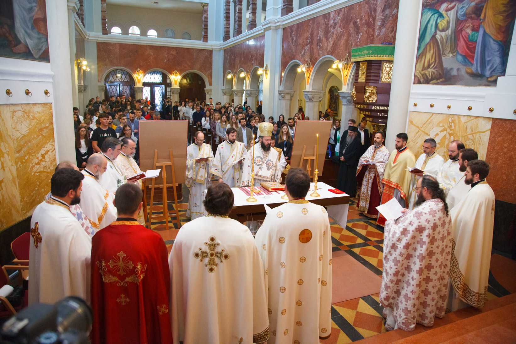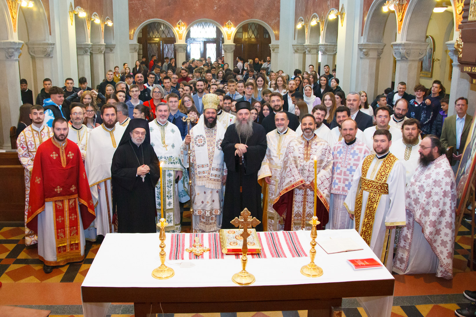 Am Morgen des 8. Oktober strömten viele Hundert Kinder und Jugendliche, zahlreiche Lehrerinnen und Lehrer sowie viele Eltern und Erziehungsberechtigte aus allen Regionen Österreichs in die Kirche „Unserer Lieben Frau vom Erlöser“ (Mater Salvatoris) im siebten Wiener Gemeindebezirk, um an der Göttlichen Liturgie teilzunehmen, der Seine Eminenz Metropolit Arsenios von Austria und Exarch von Ungarn vorstand und in der fünfzehn Priester und drei Diakone aus den verschiedenen orthodoxen Gemeinden Österreichs konzelebrierten. Mehrere Kleriker und S. Ex. Bischof Andrej des Patriarchats von Serbien nahmen an der Göttlichen Liturgie teil. In seiner Ansprache an die Jugendlichen betonte er die geistlichen Bande, die durch das gemeinsame sakramentale Leben in Christus entstehen und die Grenzen und Trennungen der nationalen Identität eines jeden Gläubigen überwinden. Er rief die jungen Menschen dazu auf, mit der heiligen Kirche verbunden zu bleiben und im Leben in der Welt voranzuschreiten, indem sie das Evangelium Christi bewahren und bereits die Auferstehung und die Vereinigung mit Ihm leben. Ein Chor unter der Leitung von Ammar Sayegh sang in byzantinischem Stil Kirchenhymnen in deutscher Sprache. Nach dem Ende der Göttlichen Liturgie dankte Seine Eminenz Metropolit Arsenios von Austria dem Bischof, dem Klerus, dem Chor und den Jugendlichen für ihre Mitfeier, sowie der Vertreterin der gastgebenden Kirchenstiftung, Schwester Judith, für die großzügige Gastfreundschaft. Priester Emanuel Nutu brachte, als Vertreter des Organisationskomitees, seine Freude über die Fortsetzung des Panorthodoxen Jugendtreffens in Österreich zum Ausdruck und dankte Seiner Eminenz dem Metropoliten von Austria für seine Unterstützung als Vorsitzender der Orthodoxen Bischofskonferenz in Österreich. Er dankte auch allen Teilnehmern, von denen viele eine weite Anreise auf sich genommen hatten.
