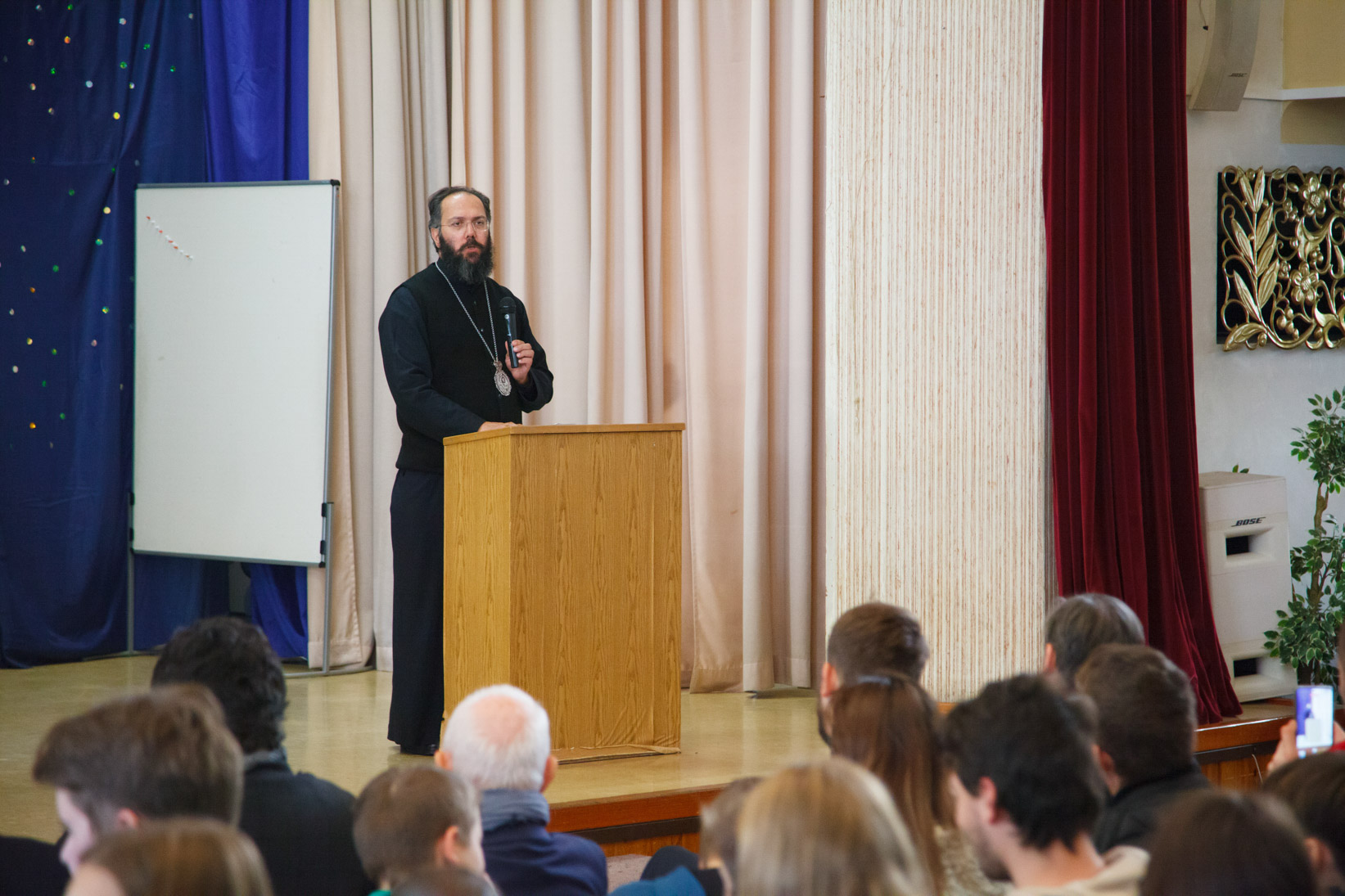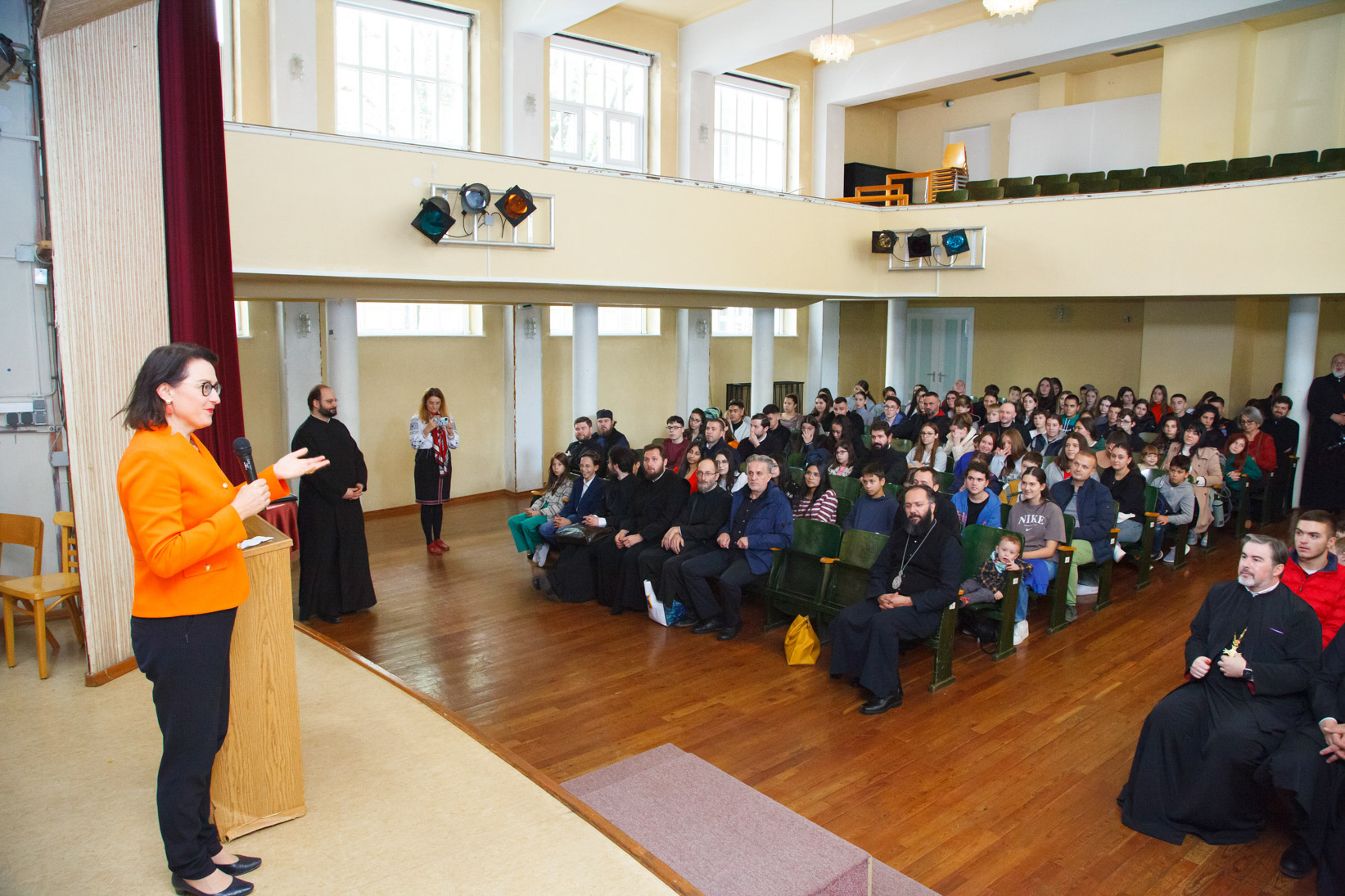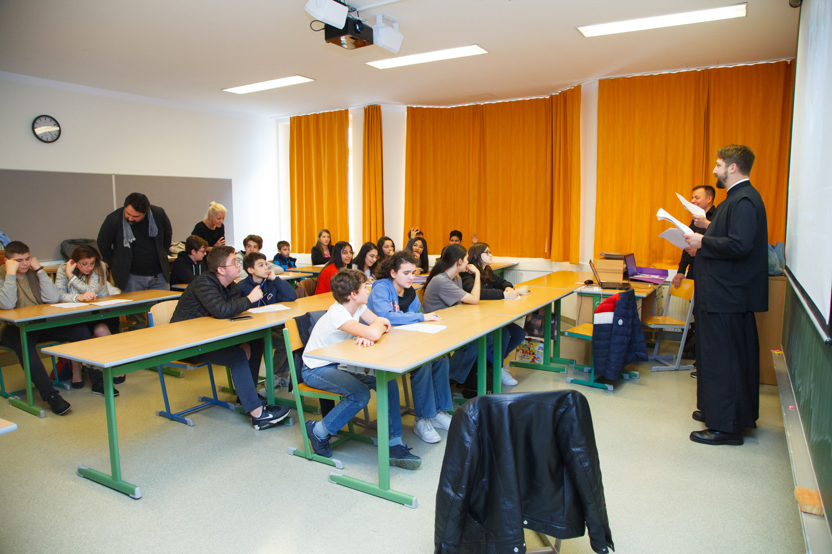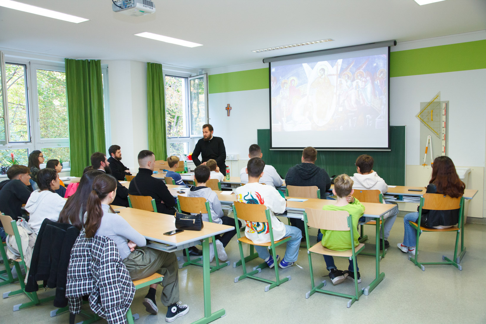 Nach dem gemeinsamen Mittagessen in der Schule, versammelten sich die Jugendlichen in der großen Halle, wo sie von Frau Dr. Gudrun Kugler, Abgeordnete zum österreichischen Nationalrat, mit herzlichen Worten begrüßt wurden. Danach ergriff Seine Eminenz Metropolit Arsenios von Austria das Wort, der seine Freude darüber zum Ausdruck brachte, dass die orthodoxen Jugendlichen zum ersten Mal nach zwei Jahren Pause wieder zusammenkamen, um über ihren Glauben und ihre Beziehung zu Christus zu diskutieren. Er unterstrich die entscheidende Bedeutung des Themas des Lebens und der Aufhebung des Todes durch die Auferstehung und erinnerte daran, dass unser Herr Jesus Christus vom wahren und vollen Leben sprach, das er den Menschen geben wollte. Seine Eminenz lud alle ein, ihr Denken im Wort des Evangeliums zu vertiefen und sich von den Lehren der Heiligen Väter erleuchten zu lassen. Er erinnerte daran, dass Christus selbst gesagt hat: „Ich bin das Leben“ und auch „Ich bin die Tür“. Er empfahl uns, uns an Ihm zu orientieren und uns zu fragen, bevor wir eine Entscheidung treffen, ob Christus „dasselbe tun würde“, um festzustellen, ob wir auf dem richtigen Weg sind. „Dies ist der Weg, der uns zum ewigen Leben führt. Diejenigen, die uns begegnen, sollen in allem, was wir sagen, denken und tun, spüren, dass Gott mit uns ist und dass wir an seinem göttlichen und ewigen Leben teilhaben“, sagte Metropolit Arsenios von Austria abschließend und wünschte Gottes Segen für die Arbeit in den Workshops.