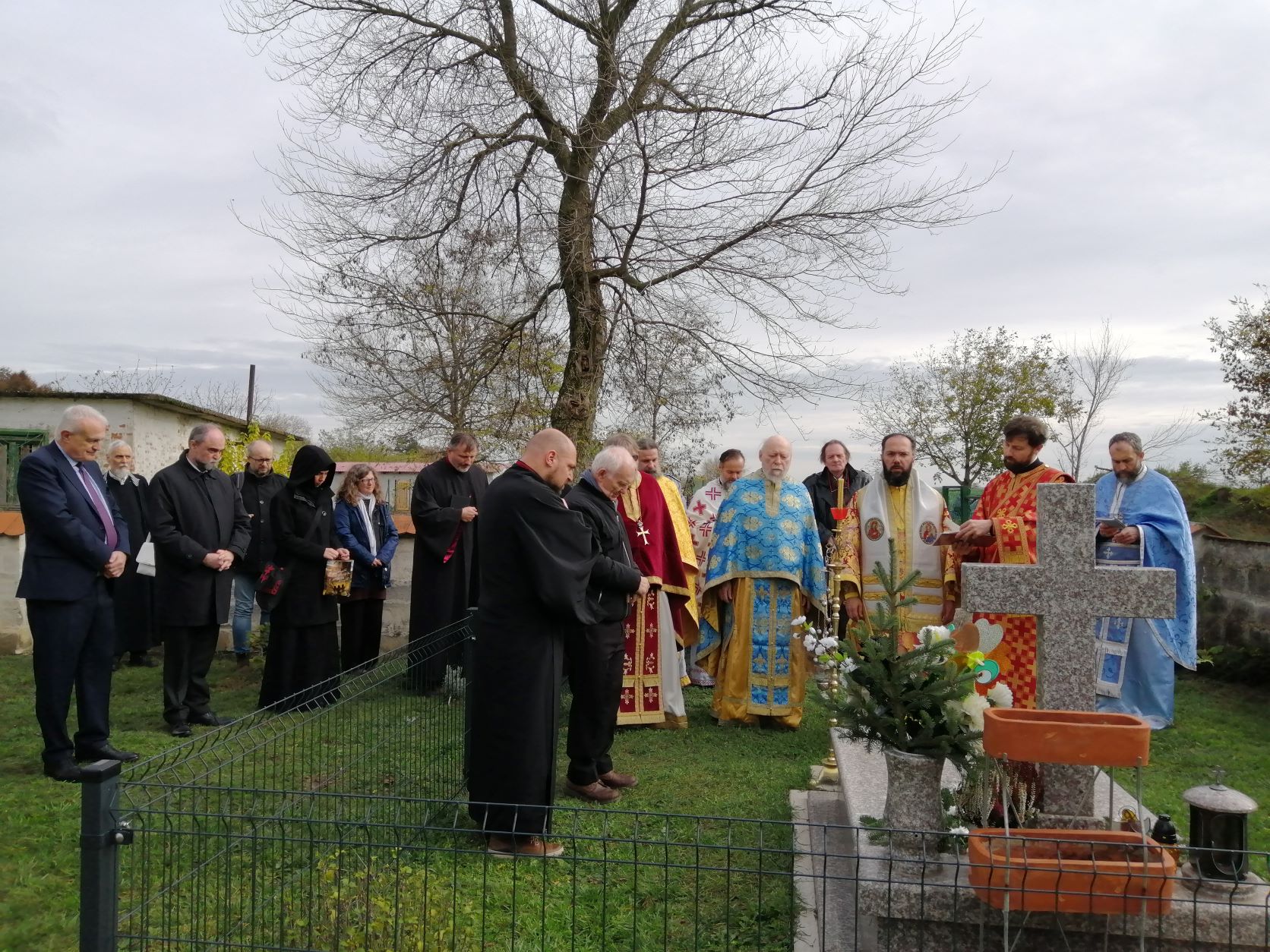 Anschließend wurde im Innenhof der Kirche am Grab des Erzpriester Vater Joseph Kalota das Trisagion für seine Seele und die seiner verstorbenen Gemeindemitglieder gefeiert. Seine Eminenz und alle Anwesenden nahmen sodann an einem festlichen Essen teil und hatten in freundschaftlicher Atmosphäre die Gelegenheit zum Meinungs- und Gedankenaustausch. Besonders konstruktiv und nützlich war die Begegnung des Metropoliten mit den anwesenden Geistlichen des Exarchats, denen er für ihre Vorbildwirkung und Zeugnis dankte, denen er Ratschläge für ihren Dienst gab und die er bei der Ausübung ihrer vielfältigen Arbeiten in den lokalen Kirchengemeinden in Ungarn anleitete.