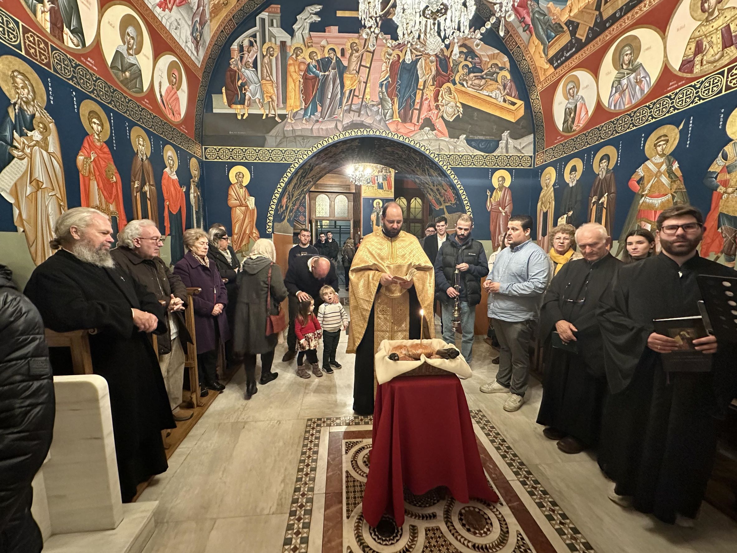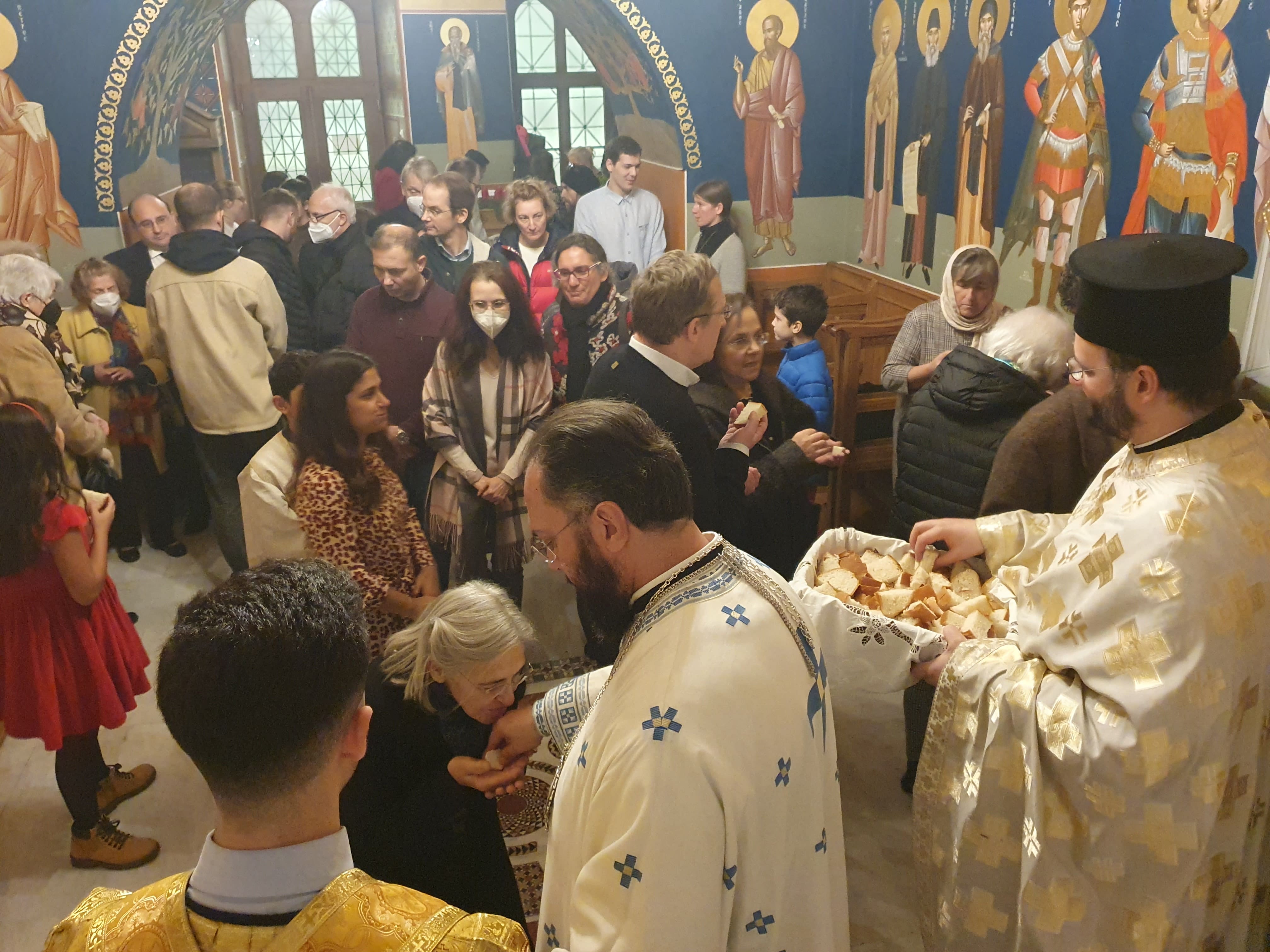 Metropolit Arsenios zeigt sich außerdem sehr erfreut darüber, dass an der Göttlichen Liturgie so viele Gläubige unterschiedlicher Herkunft und verschiedenen Alters teilnehmen, um das Gedächtnis ihres Gemeindepatrons zu feiern. Den verantwortlichen Priestern der Gemeinde, Erzpriester Nikolaus Rappert, der aufgrund dienstlicher Verpflichtungen nicht teilnehmen konnte, und Priestermönch Athanasius Buk gratulierte er für ihr pastorales Wirken. Metropolit Arsenios segnete die neuen Mitglieder der Gemeinde und wünschte allen, dass sie wahrhaft das Leben in Christus vertiefen und so des Erbes des Himmelreiches gewürdigt werden. Die Gläubigen der Gemeinde lud er außerdem dazu ein, an den zahlreichen geistlichen Angeboten der Metropolis von Austria teilzunehmen, besonders etwa an der regelmäßigen Sonntagskatechese im Anschluss an die sonntägliche Göttlichen Liturgie. P. Athanasius Buk dankte Metropolit Arsenios für seine vielfältige Unterstützung, die er der Gemeinde entgegenbringt und bat ihn, sie auch weiterhin zu führen und an ihrer Seite zu stehen.