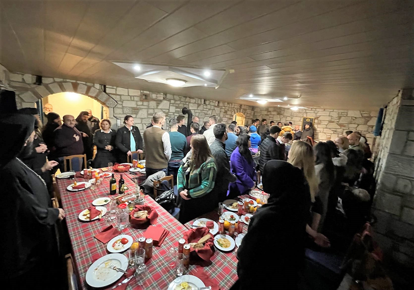 Es folgte ein gemeinsames Mitagessen, zu dem alle anwesenden Besucher herzlich eingeladen waren. Während des Essens wurden entsprechend der klösterlichen Tradition geistliche Texte der Kirchenväter vorgelesen. Am Nachmittag gab es weitere Möglichkeiten zum Austausch, eine Führung durch das Klostergelände und schließlich die Feier der Vesper, des Apodeipnon und des Akathistos in der Klosterkirche. Viele Pilger nahmen auch am gemeinsamen Abendessen teil. Alle Besucher empfingen den Segen des Metropoliten und beteten zu Gott, dass er das Werk der klösterlichen Bruderschaft in diesem einzigen orthodoxen Kloster in Österreich segne.
