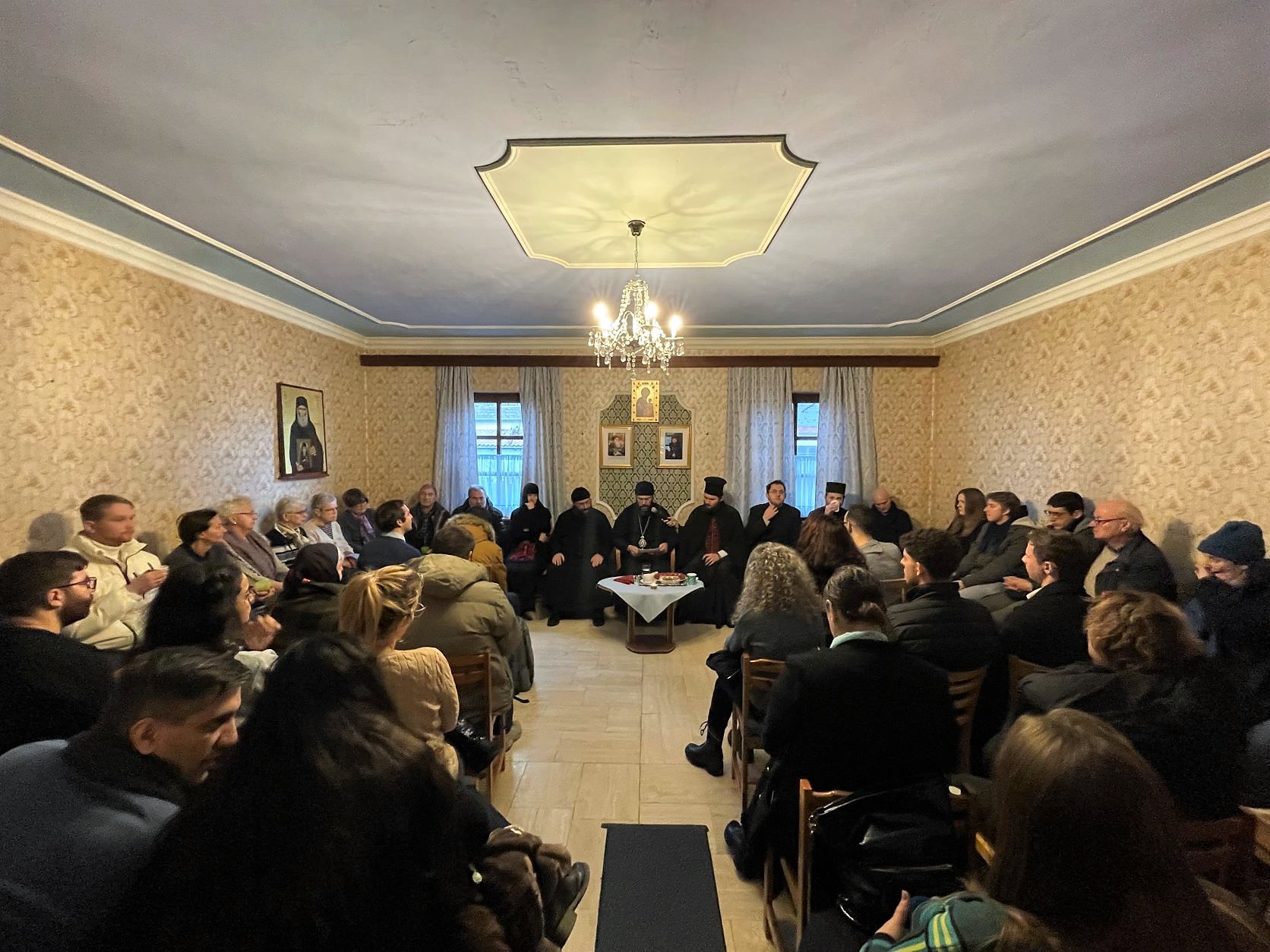 Im Anschluss an die Göttliche Liturgie versammelten sich alle Anwesenden im Gästehaus des Klosters, wo sie eine Einführung des Metropoliten in das Thema „Die Geburt Christi im Verständnis der heutigen Jugend“ hören durften. An die Ausführungen schloss sich eine lebhafte Diskussion an, in welcher der Metropolit den Gläubigen die wichtigsten Eckpunkte des Mysteriums des göttlichen Heilsplans darlegte, so dass in diesem Wissen in wenigen Tagen ein „wirkliches“ Weihnachtsfest gefeiert werden kann.