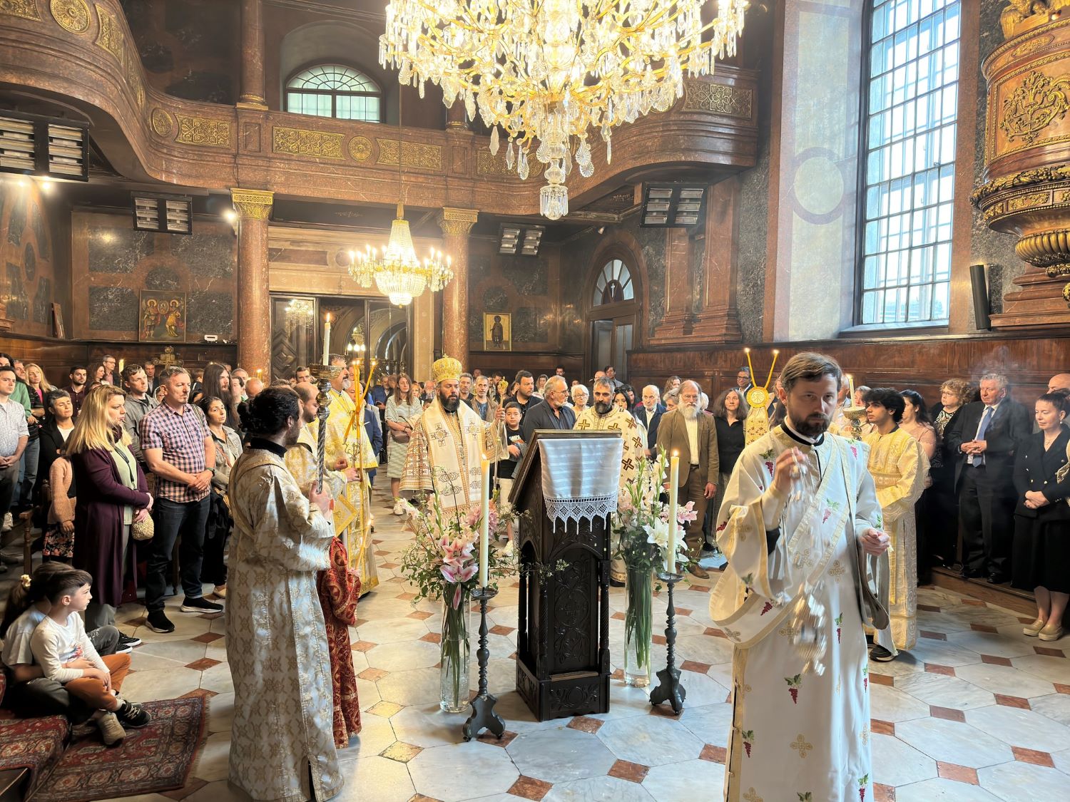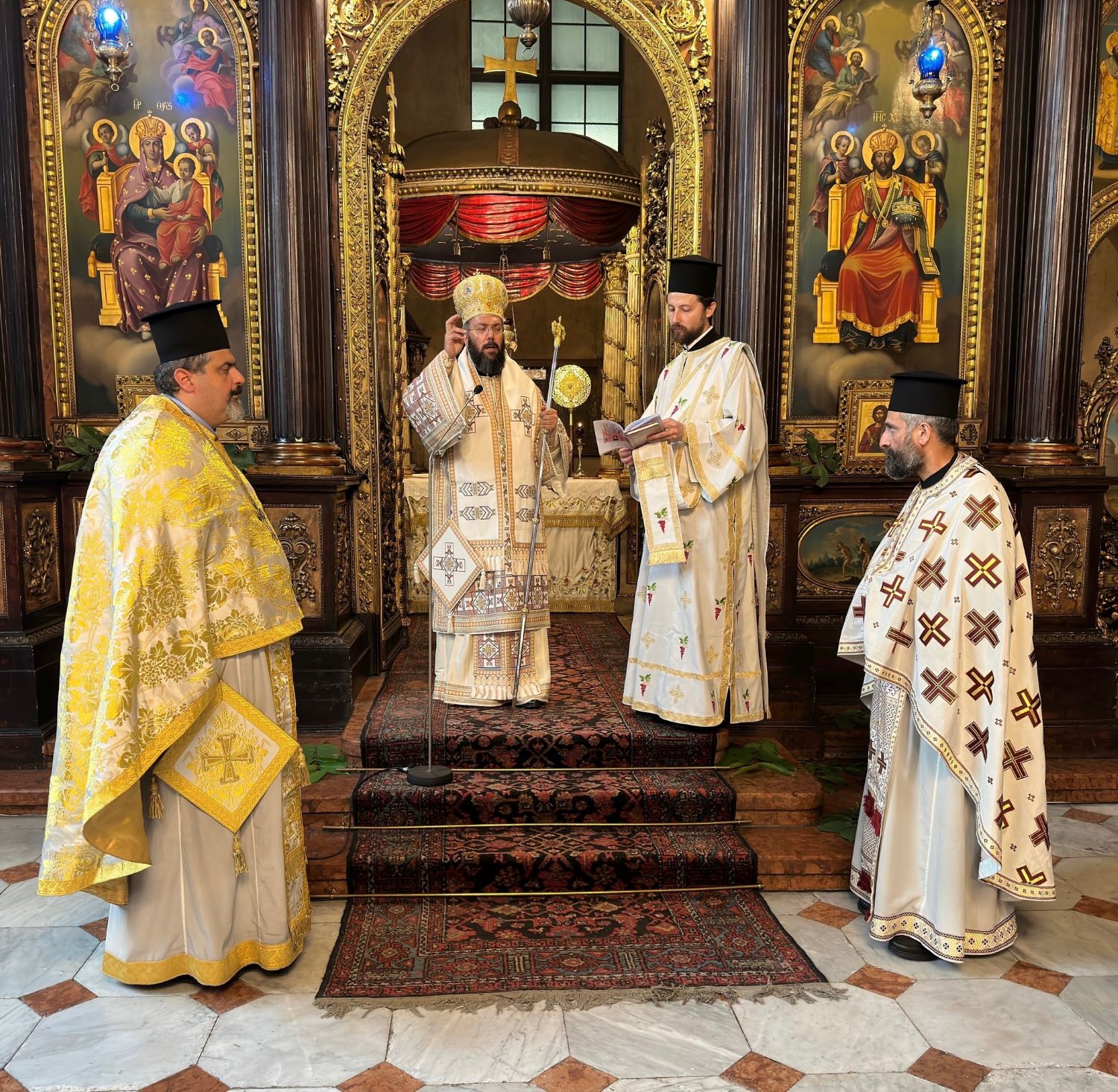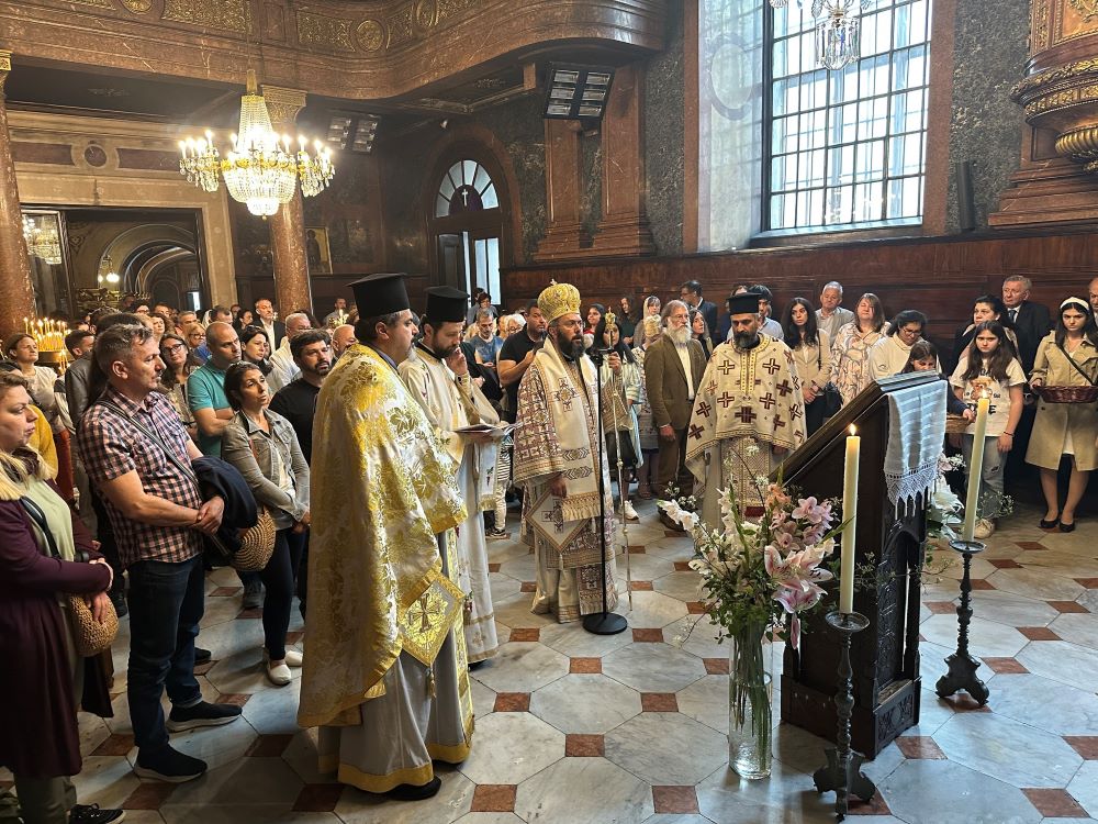 en dargebrachten Kollyva und betete für die ewige Ruhe der Seelen der Verstorbenen. Am Samstagabend feierte der Metropolit gemeinsam mit zahlreichen Gläubigen die feierliche Vesper zum Pfingstfest und segnete die Brote der Artoklasie. Mit ihm feierten Ioannis Nikolitsis, Erzpriester des Ökumenischen Thrones, Priestermönch Athanasius Buk, Priester Aristeidis Ganosis sowie Erzdiakon Maximos Rugyko.