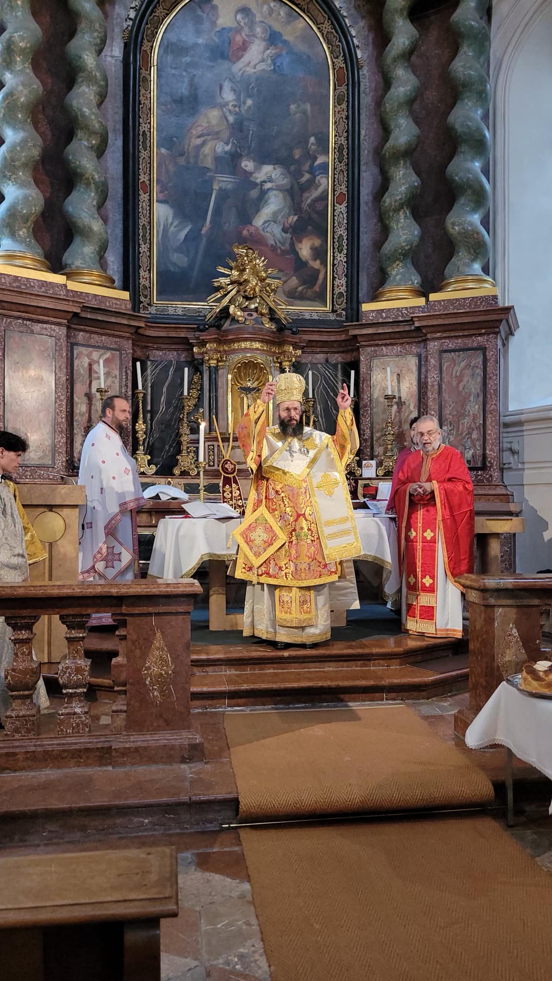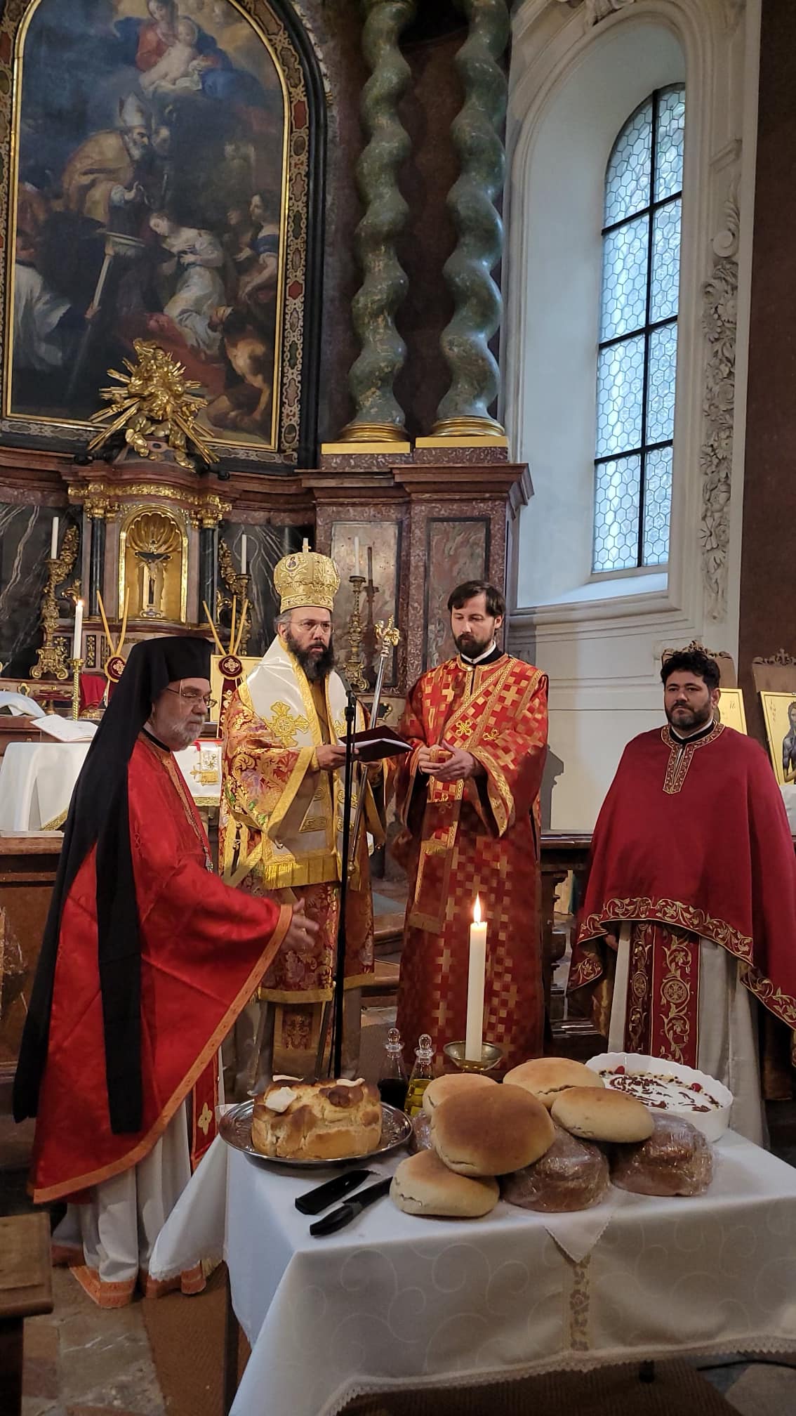 Schließlich würdigte Metropolit Arsenios das Engagement von Archimandrit Elias und seine fruchtbare pastorale Arbeit in der Gemeinde, die er parallel zu seiner Lehrtätigkeit im orthodoxen Religionsunterricht ausübt. Er versprach die Unterstützung der Metropolis bei allen Anliegen der Gemeinde. Am Ende der Göttlichen Liturgie wurde ein Gebet für den österreichischen Nationalfeiertag gesprochen.