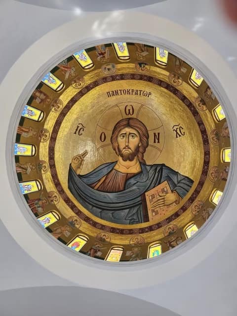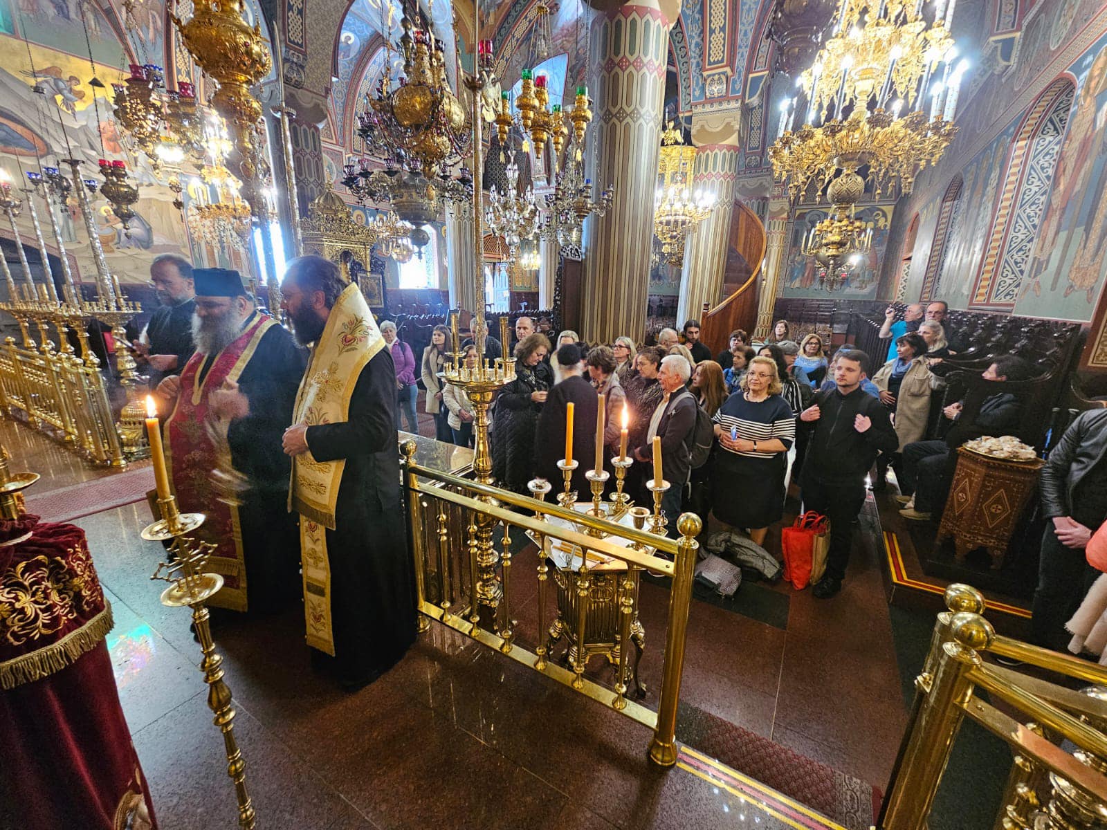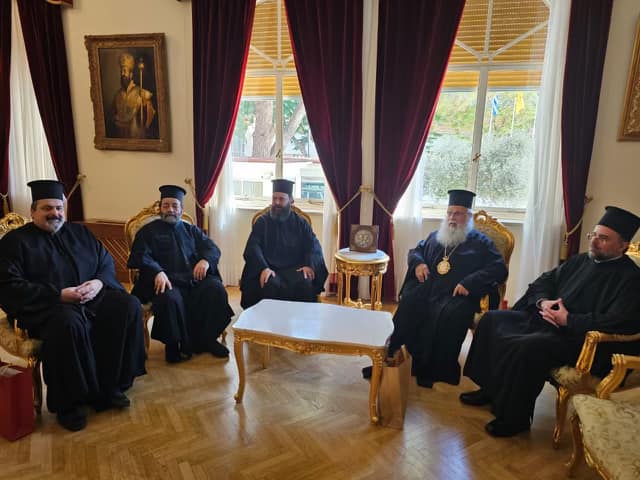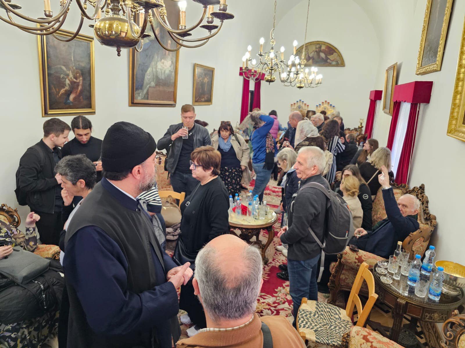 Anschließend begab sich die Pilgergruppe nach Paralimni, dem provisorischen Sitz der Metropolis von Konstantinopel und Famagusta, wo Seine Eminenz der Metropolit von Österreich und sein Gefolge in der Heiligen Kirche des Heiligen Georg von Seiner Eminenz dem Metropoliten Vasilios empfangen wurden. Alle verehrten den Heiligen Gürtel der Allerseligsten Jungfrau Maria, der durch eine Heilige Eskorte von Mönchen aus dem Heiligen Kloster Vatopaidi auf dem Berg Athos nach Megalonissos gebracht wurde, um geheiligt und von Leiden befreit zu werden. Anschließend stand ein Besuch der Ausstellung von Erinnerungsstücken aus der besetzten Kirche des Heiligen Gürtels in der Altstadt von Famagusta in der alten Kirche des Heiligen Georg in Paralimni auf dem Programm. Die Pilger wurden vom Metropoliten Basileios in den Räumlichkeiten der Metropolis empfangen, wo Seine Eminenz über seine Tätigkeit als Präsident der Orthodoxen Kirche im Ökumenischen Rat der Kirchen und als Präsident der geteilten Metropolis berichtete.