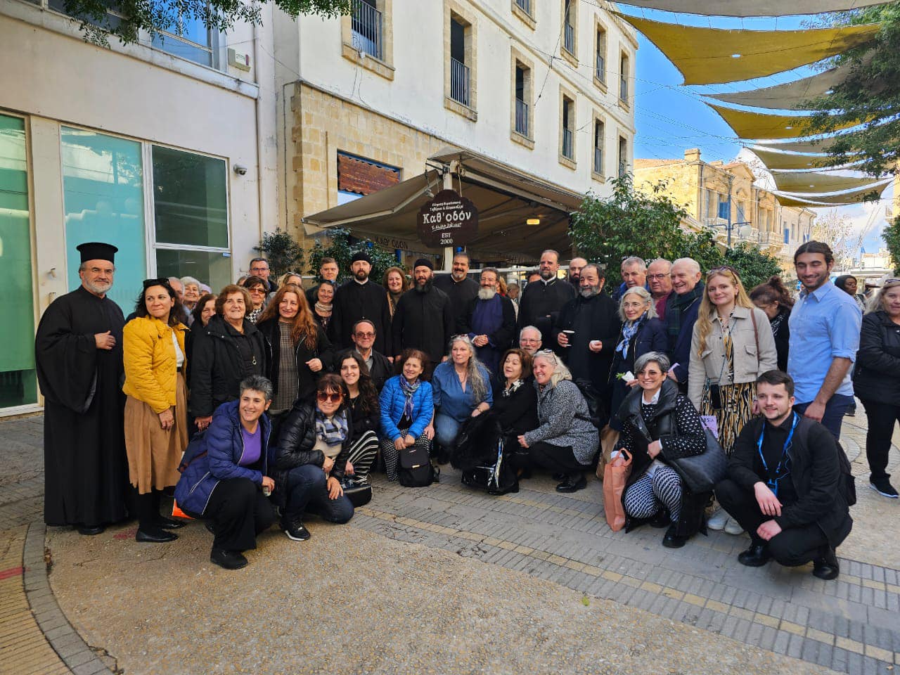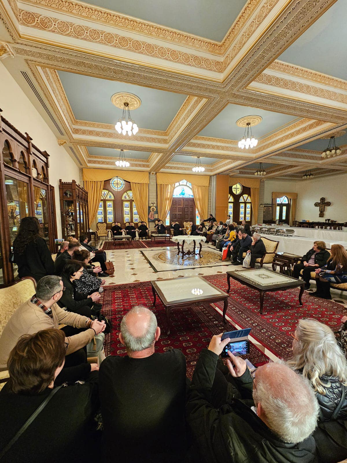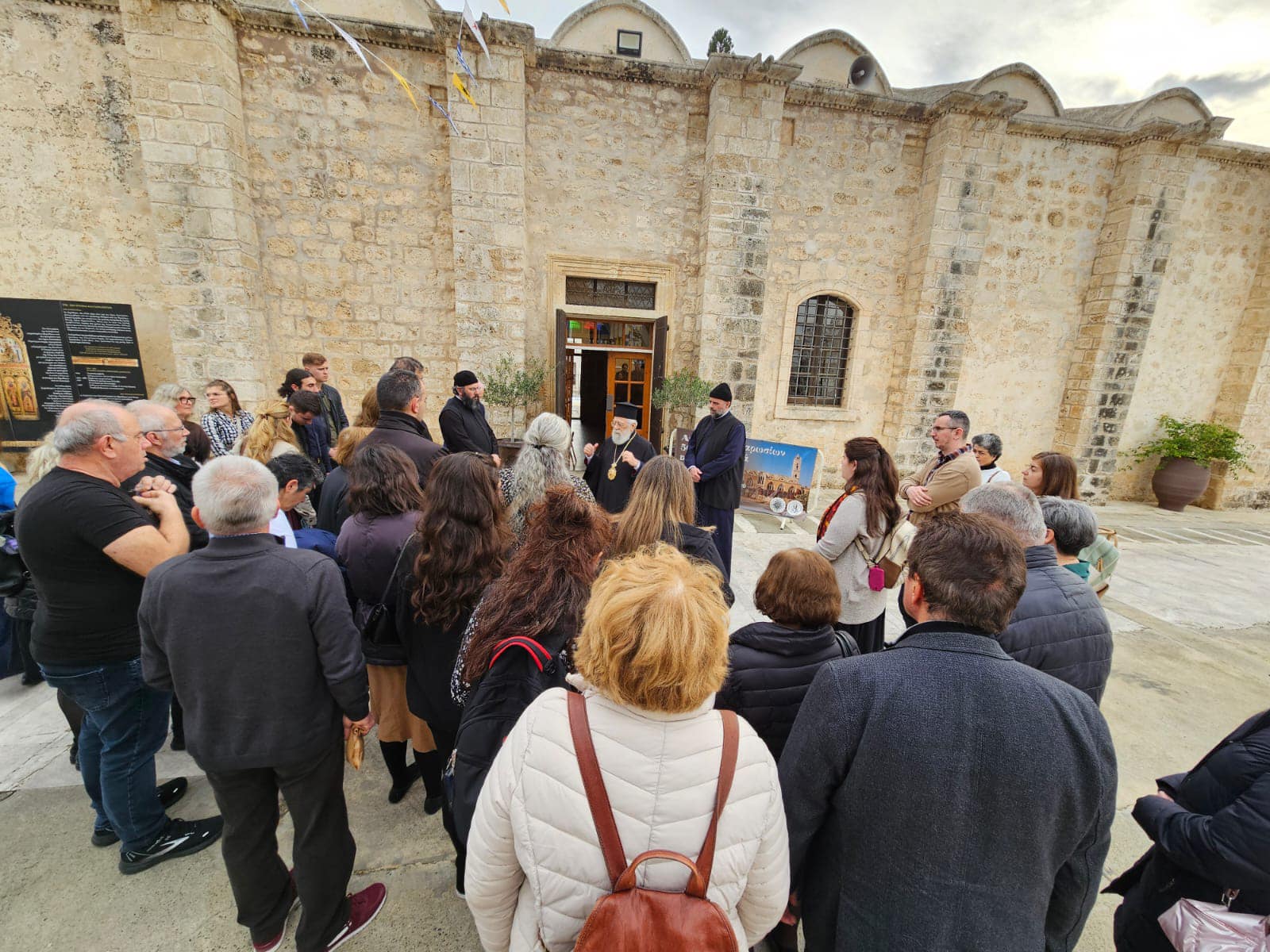 Am Montagmorgen, dem 5. Februar, begann die Gruppe ihre Pilgerreise in Nikosia, der Hauptstadt der Republik Zypern, dem Sitz des Erzbischofs Georgios von Zypern, den die Pilger im Erzbischöflichen Palast besuchten. Seine Seligkeit begrüßte herzlich Seine Eminenz Metropolit Arsenios von Austria, Bischof Paisios von Apameia und alle Pilger. Er informierte auch ausführlich über die aktuelle Situation der geteilten Insel Zypern, nachdem er die Meilensteine ihrer politischen und religiösen Geschichte vorgestellt hatte. Seine Exzellenz Bischof Gregor von Mesaoria, führte die Gruppe durch die Alte und die Neue Erzbischöfliche Kirche, die Kammern des Gedenkens an die Gefallenen des Befreiungskampfes der E.O.K.A. und das Byzantinische Museum von Erzbischof Makarios III. Erfüllt von heiliger Ergriffenheit beendete die Gruppe die Besichtigung der Altstadt von Nikosia und machte sich auf den Weg zum Heiligen Kloster von Stavrovouni, das einen großen Teil des Heiligen Waldes bewahrt, und dann zum Heiligen Frauenkloster von Heiliger Thekla in der Nähe des Dorfes Mosfiloti.