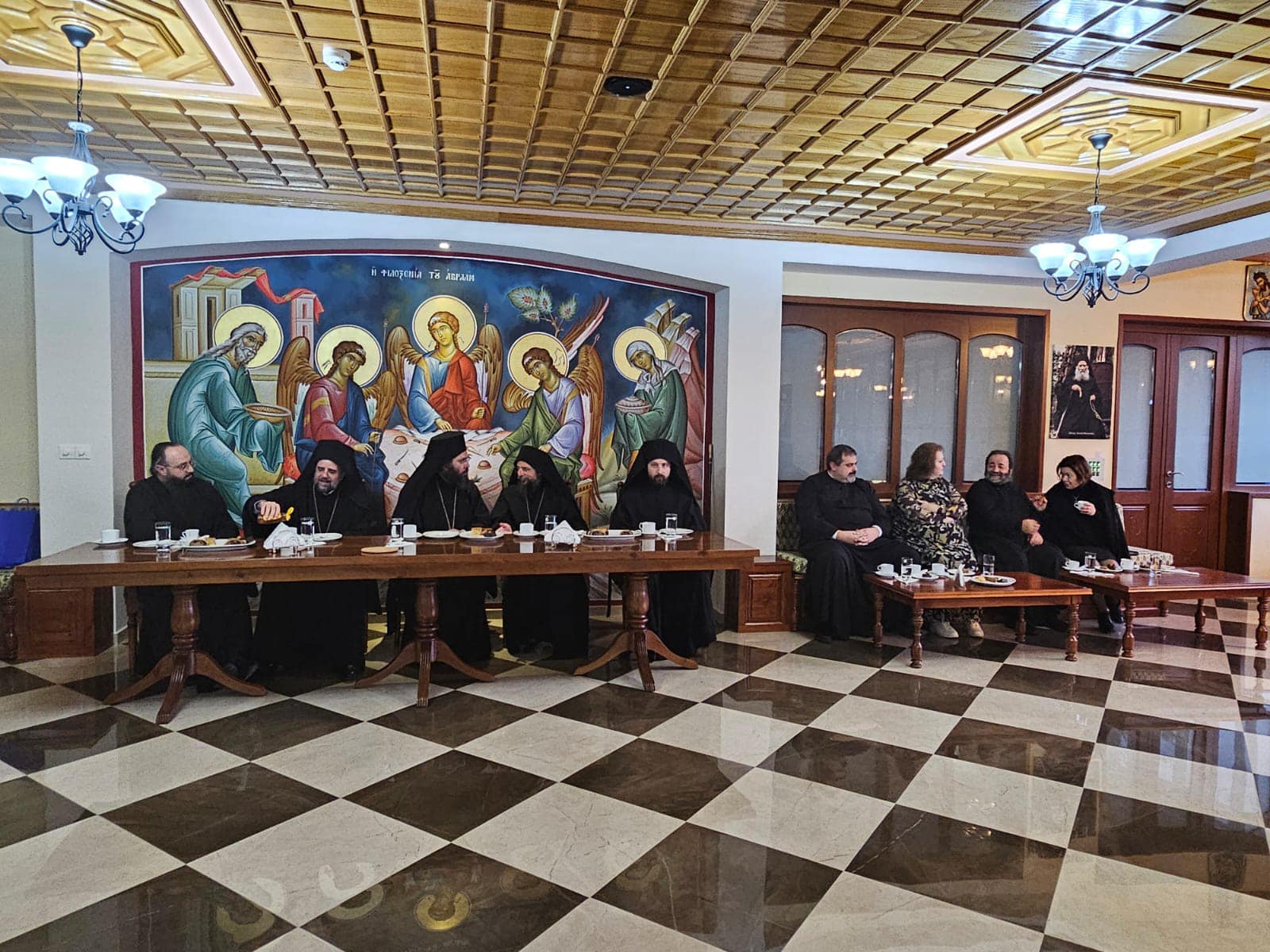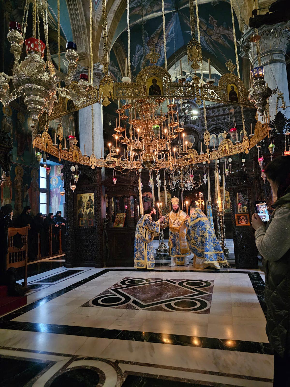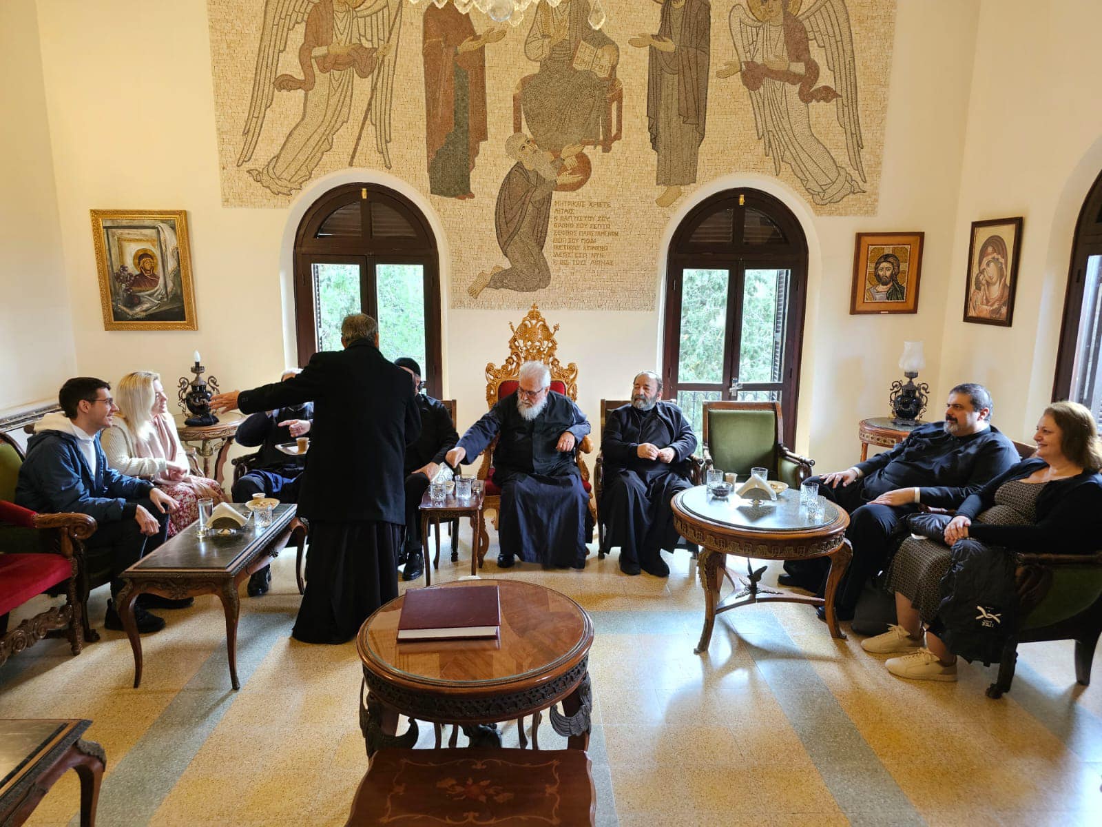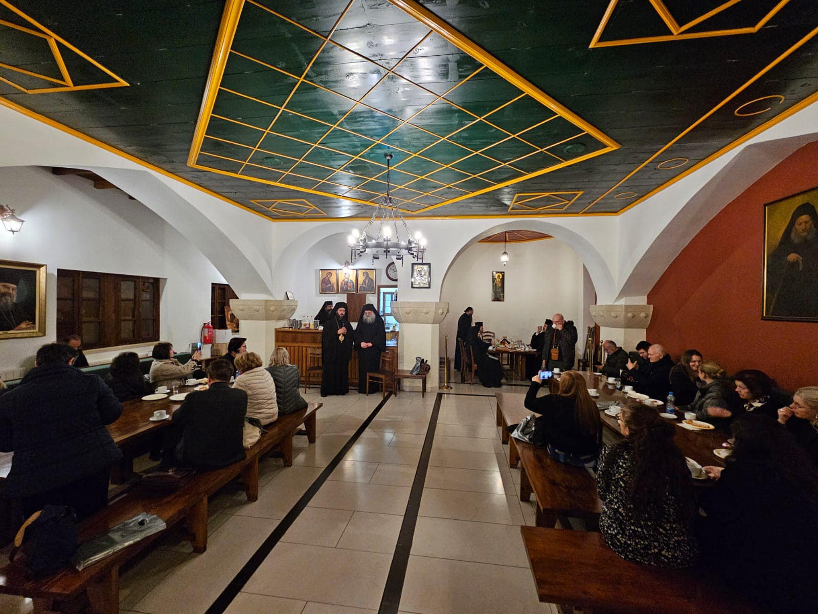 Am Montagmorgen, dem 5. Februar, begann die Gruppe ihre Pilgerreise in Nikosia, der Hauptstadt der Republik Zypern, dem Sitz des Erzbischofs Georgios von Zypern, den die Pilger im Erzbischöflichen Palast besuchten. Seine Seligkeit begrüßte herzlich Seine Eminenz Metropolit Arsenios von Austria, Bischof Paisios von Apameia und alle Pilger. Er informierte auch ausführlich über die aktuelle Situation der geteilten Insel Zypern, nachdem er die Meilensteine ihrer politischen und religiösen Geschichte vorgestellt hatte. Seine Exzellenz Bischof Gregor von Mesaoria, führte die Gruppe durch die Alte und die Neue Erzbischöfliche Kirche, die Kammern des Gedenkens an die Gefallenen des Befreiungskampfes der E.O.K.A. und das Byzantinische Museum von Erzbischof Makarios III. Erfüllt von heiliger Ergriffenheit beendete die Gruppe die Besichtigung der Altstadt von Nikosia und machte sich auf den Weg zum Heiligen Kloster von Stavrovouni, das einen großen Teil des Heiligen Waldes bewahrt, und dann zum Heiligen Frauenkloster von Heiliger Thekla in der Nähe des Dorfes Mosfiloti.