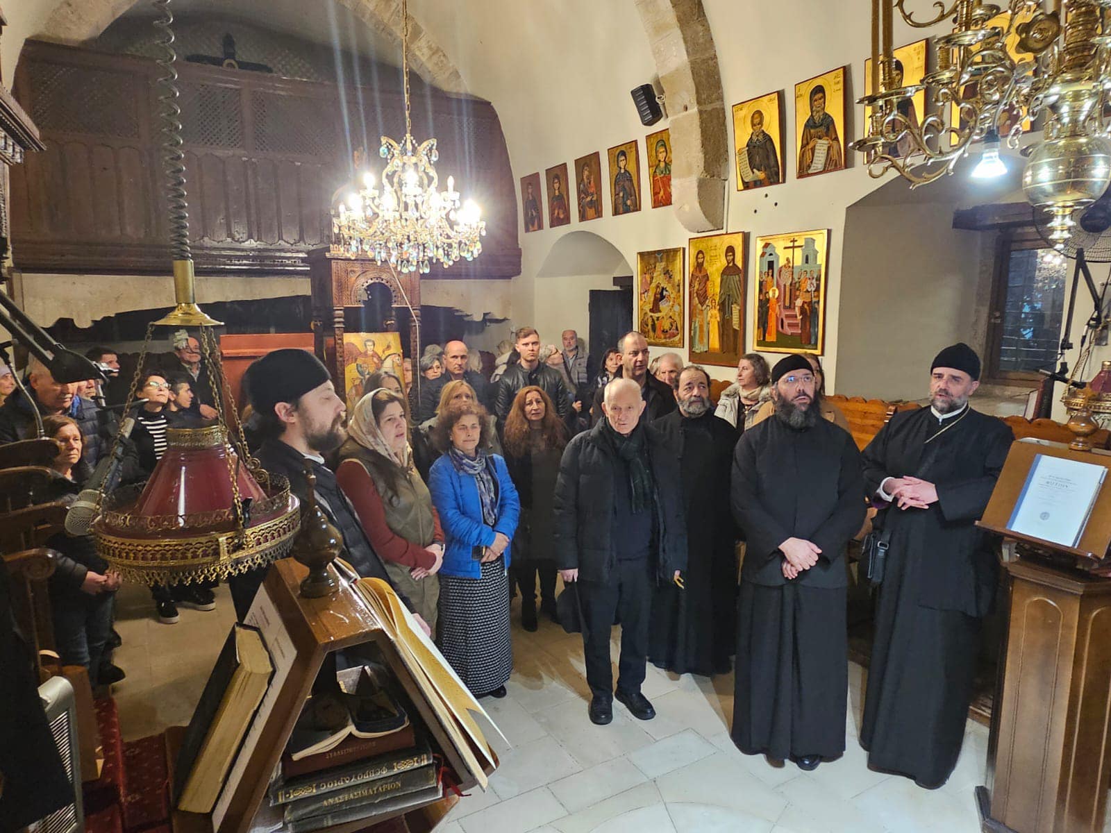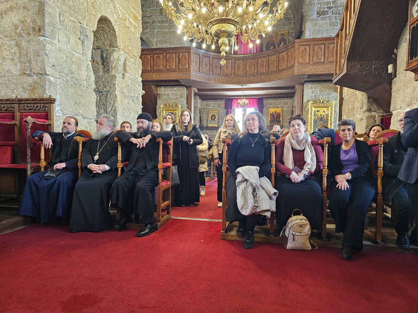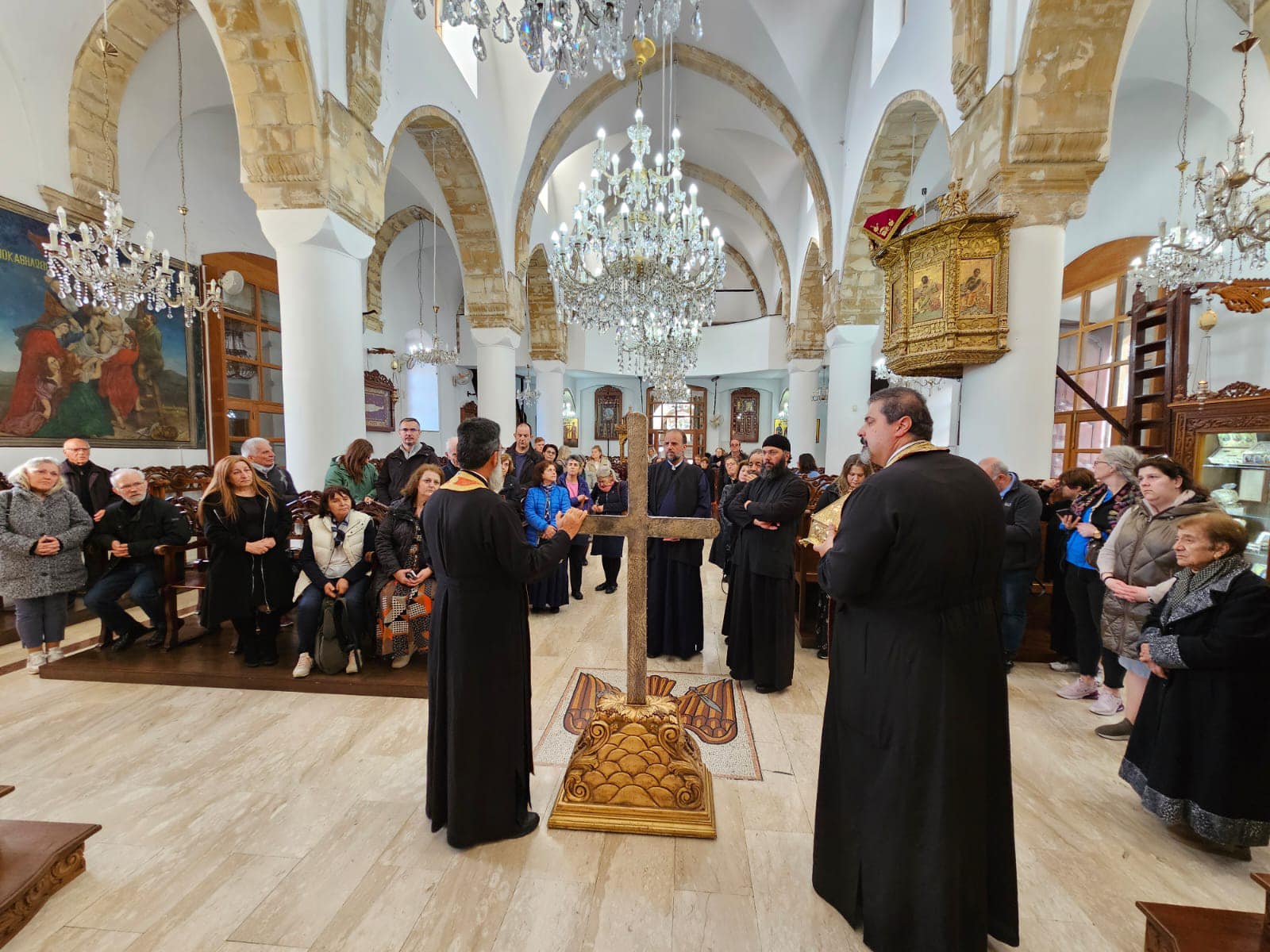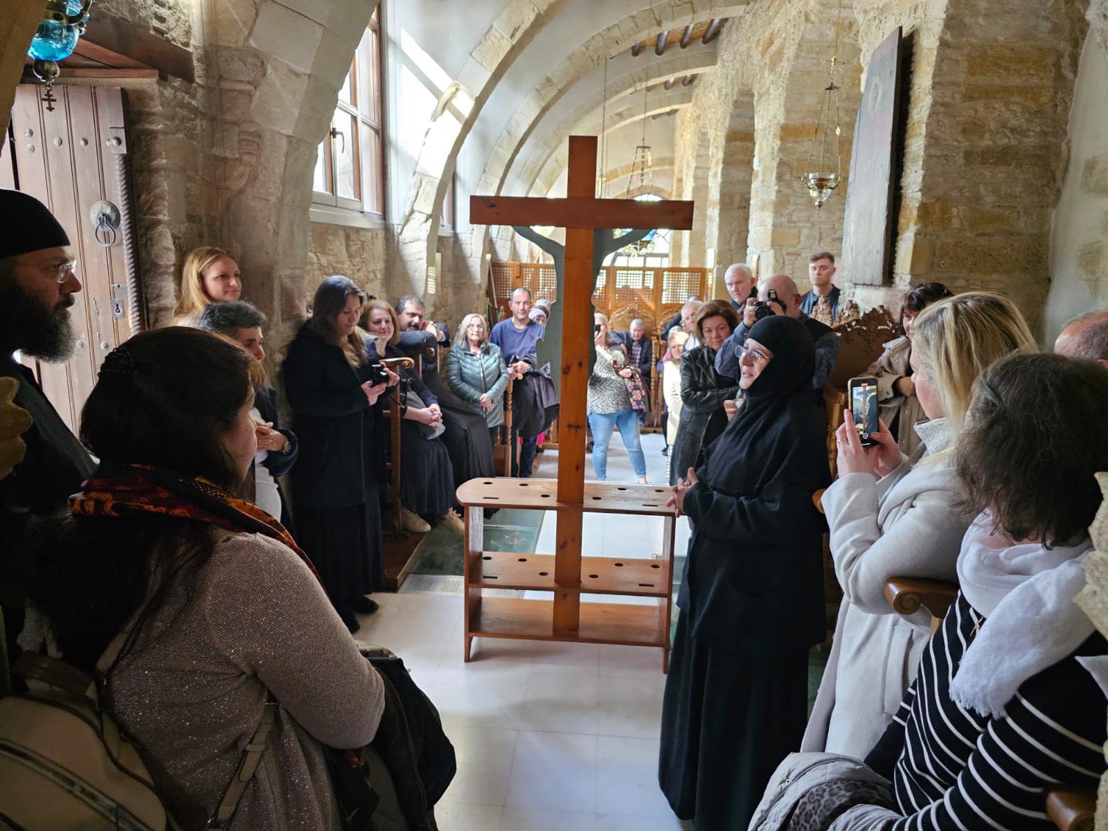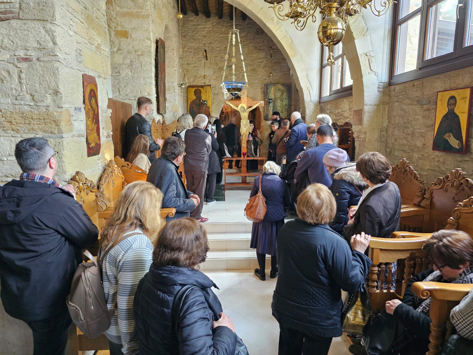 Am Samstag, dem 9. Februar, dem letzten Tag der Pilgerreise, befand sich die Pilgergruppe in der Umgebung der Heiligen Metropolis von Trimythous, der ehemaligen Diözese des Heiligen Spyridon. Die prächtige historische Kirche (14. Jh.) mit ihrer geschnitzten Holzikonostase (1740) und dem imposanten Glockenturm schmückt das traditionelle Dorf Ano Lefkara, das für seine Lefkari-Stickereien bekannt ist. In einer nicht sichtbaren Nische der Ikonostase befindet sich ein großes Holzkreuz mit einem Stück des Heiligen Kreuzes des Herrn, das vom Bischof von Lefkara, Olivier (1307), geweiht wurde.