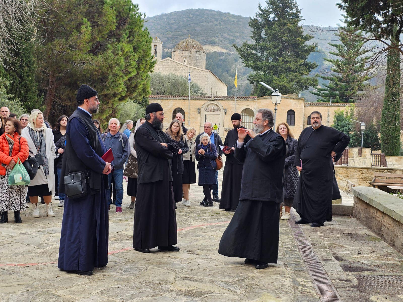 Die erste Station der Pilger am Mittwoch, dem 7. Februar, war die Heilige Basilika und das Kloster der Allerheiligsten Gottesgebärerin von Kykkos, das mit dem persönlichen finanziellen Beitrag von Kaiser Alexios Komnenos (1081-1118) gegründet wurde und die Ikone der Allerheiligsten Gottesgebärerin, der Quelle der Barmherzigkeit, die Kykkotissa, bewahrt, ein Werk nach der Tradition des Apostels Lukas, das der Gottesmutter selbst nachempfunden ist. In Abwesenheit des Abtes des Klosters, Metropolit Nikephoros von Kykkos und Tilliria, wurden die Besucher von Archimandrit Agathonikos, Generalvikar der Heiligen Metropolis von Kykkos und Tilliria, und den Brüdern des Klosters empfangen. Es wurde eine Paraklese an die Allerheiligsten Gottesgebärerin gesungen und nach der Verehrung der Heiligen Ikone und der Führung in den Räumlichkeiten des Klosters, die sich für ihre byzantinische Pracht auszeichneten, folgten die Pilger einem mit Mosaiken geschmückten Fußweg zum schroffen Gipfel des Marienthrons (1450 M), wo sich die Statue des ersten Präsidenten der Republik Zypern, Erzbischof Makarios III (1950-1977), und sein Grab im Inneren der Kirche befinden.