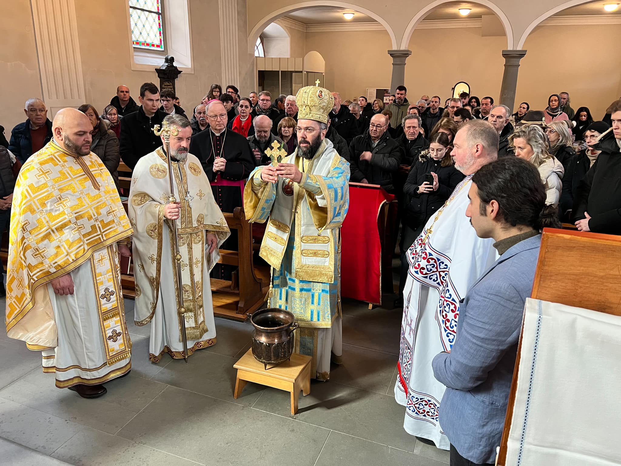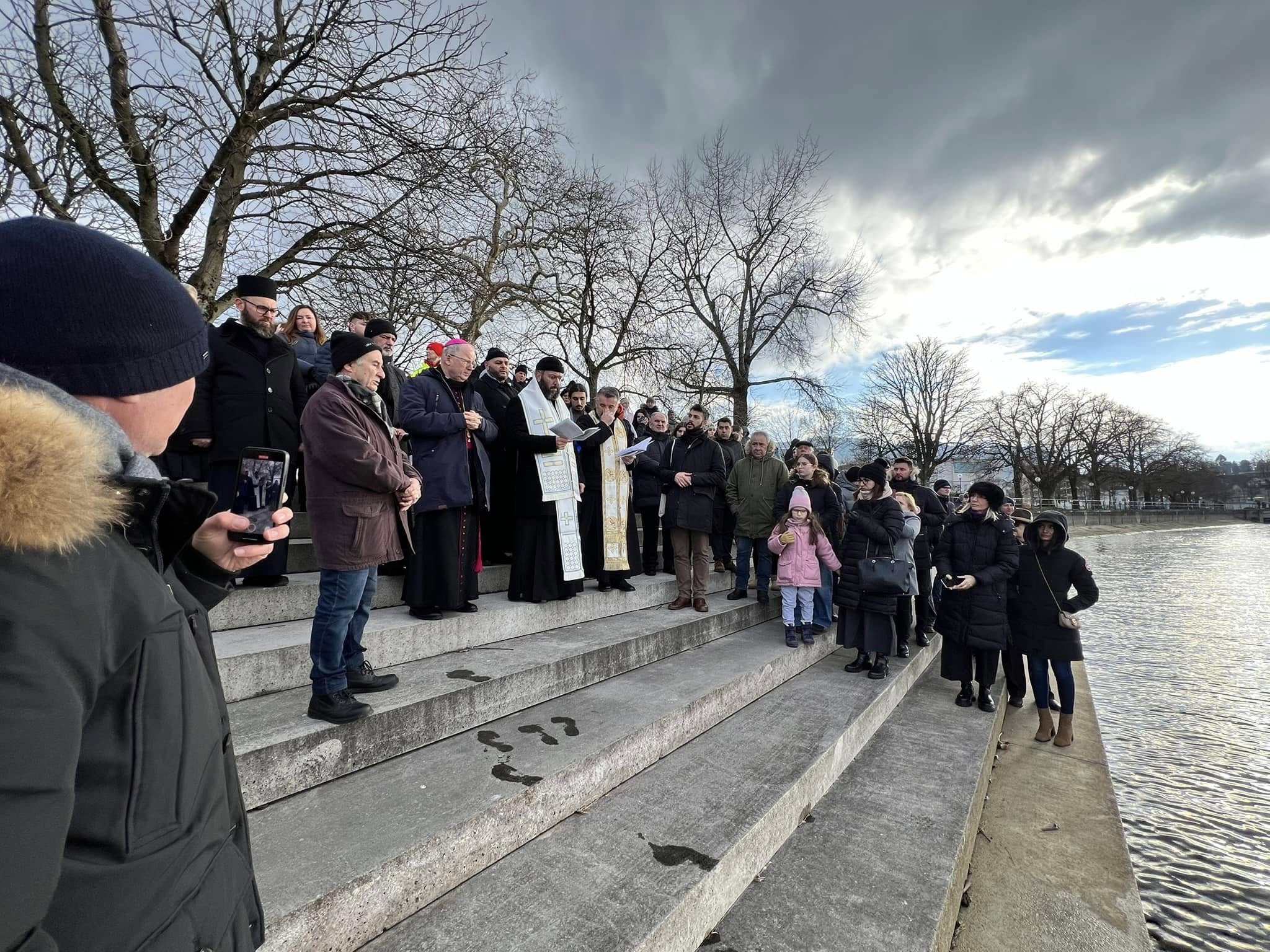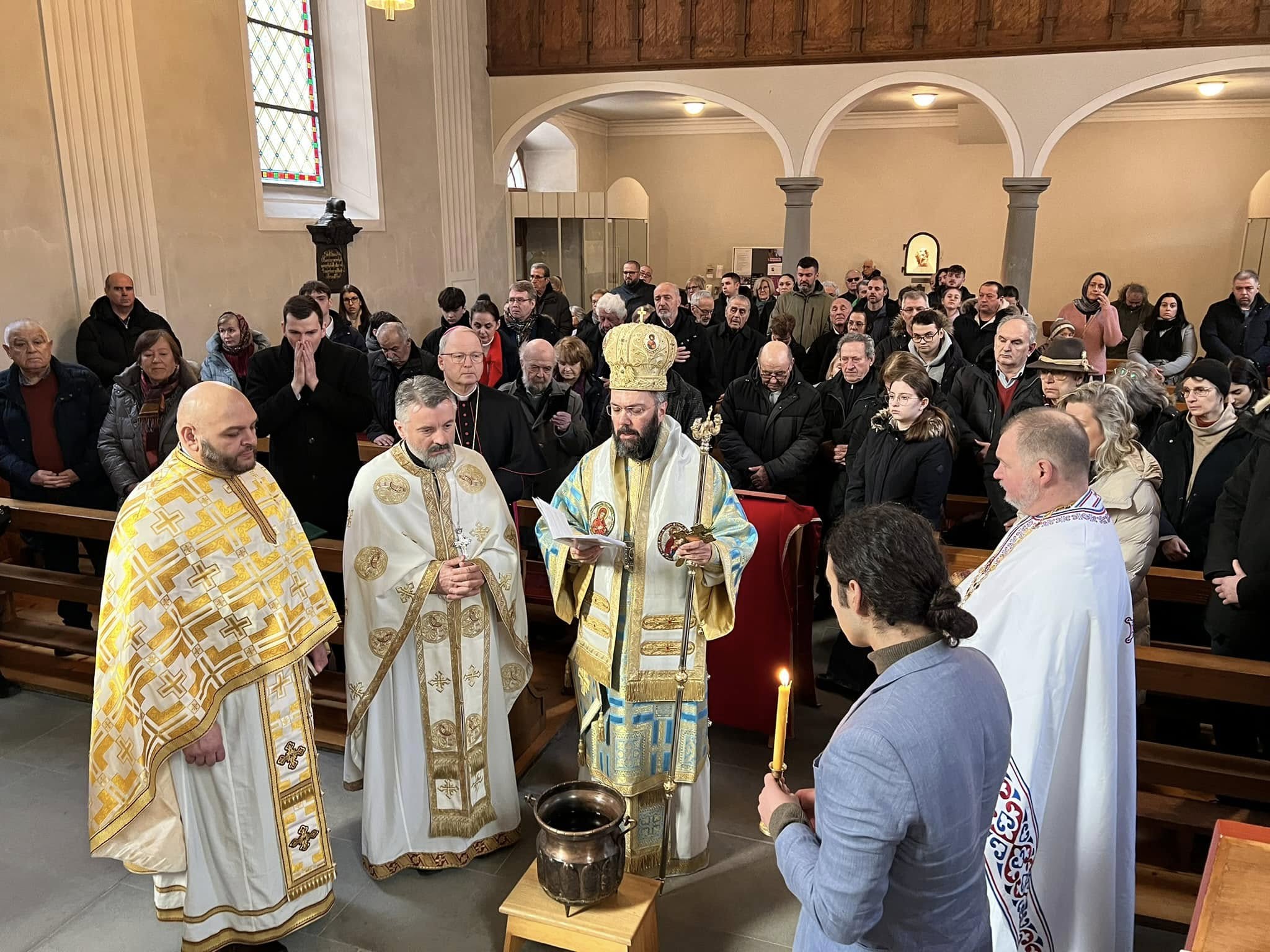 Am Sonntag, dem 12. Januar 2025, besuchte Seine Eminenz Metropolit Arsenios von Austria im Rahmen seiner Pastoralreise durch Westösterreich die Stadt Bregenz, wo er der Erzbischöflichen Liturgie in der Gemeinde der Heiligen Drei Hierarchen vorstand. Ökonom Stavrofor Nebojsa Grdinic, Gemeindevorsteher aus Innsbruck, Presbyter Vadim Karpenko aus Lindau und Ovidiu Cozma aus Feldkirch begleiteten den Metropoliten liturgisch. Bei der Göttlichen Liturgie war auch der Römisch-katholische Bischof von Feldkirch Benno Elbs anwesend und zu der Wasserweihe kamen auch Erzpriester Goran Eric aus Bregenz und Priester Nikola Balovic aus Feldkirch. Anschließend begaben sich alle an den Strand des Bodensees, wo Metropolit Arsenios das Wasser mit einem Kreuz segnete. Schließlich gab es ein gemeinsames Essen, bei dem der Metropolit die Wasilopitta der Gemeinde segnete.