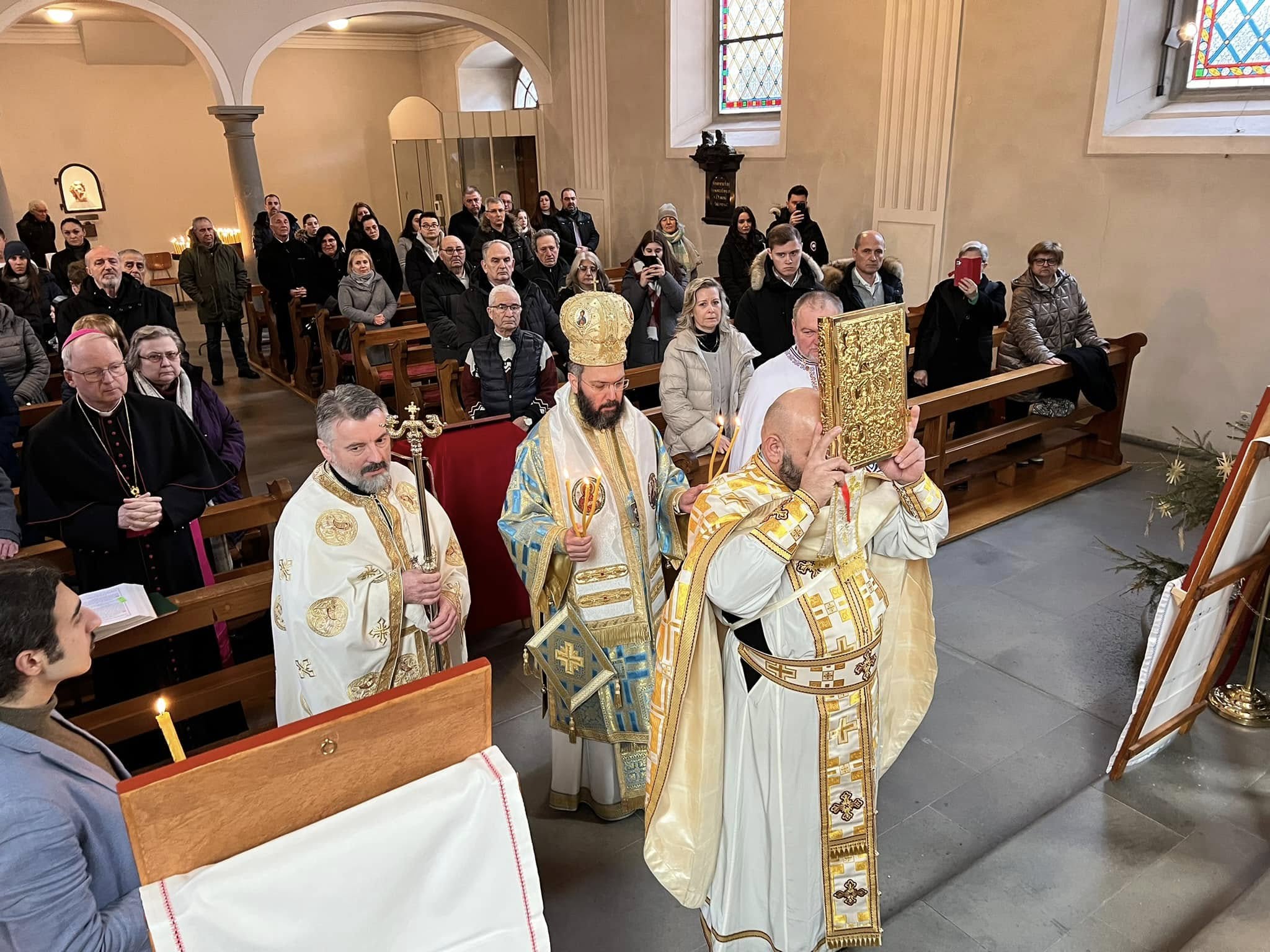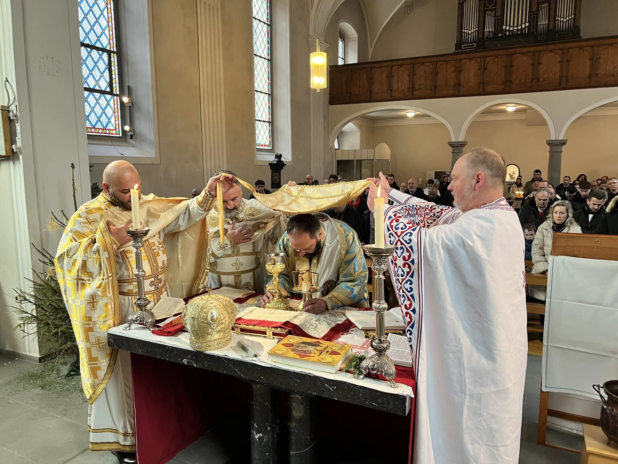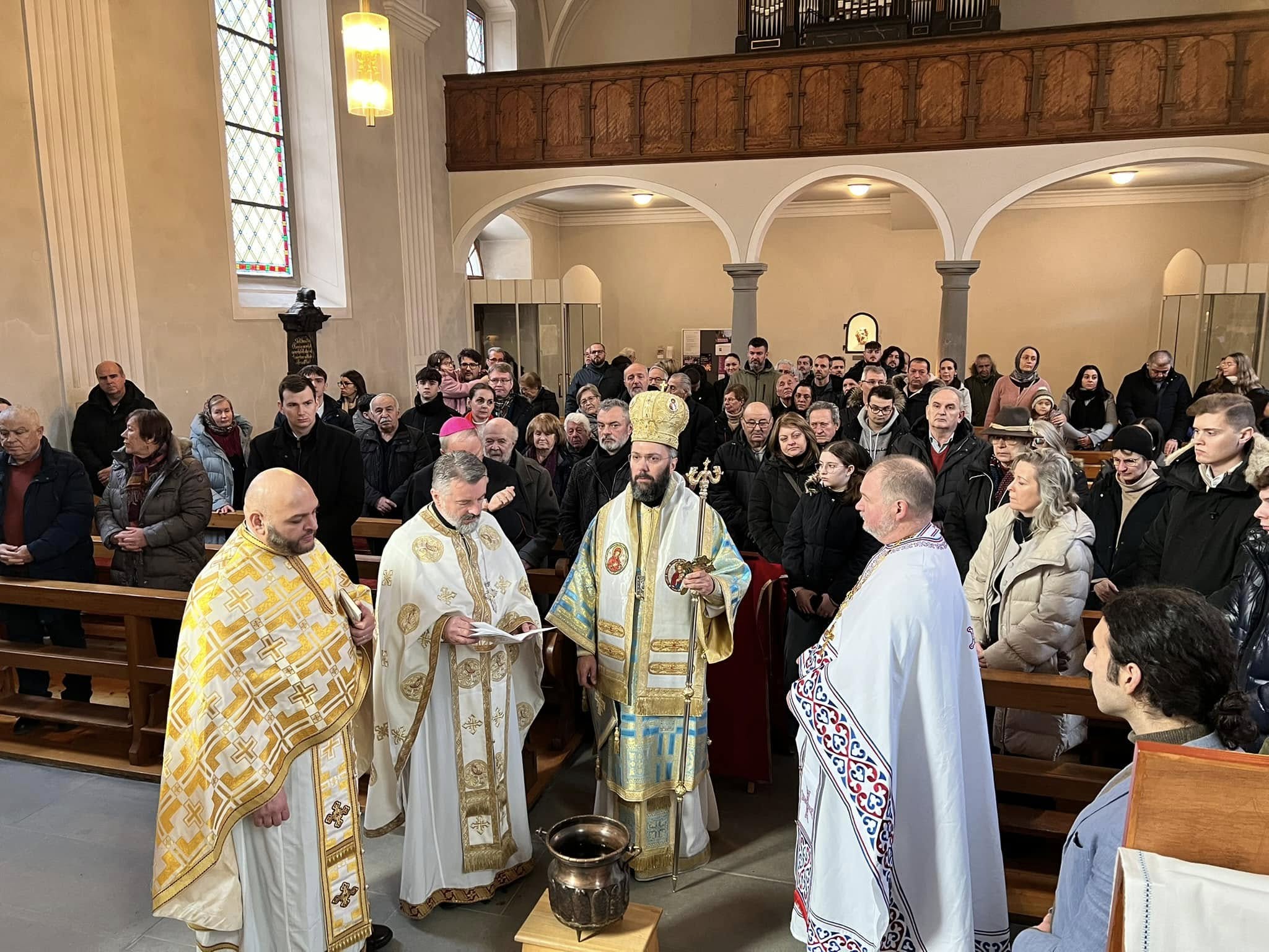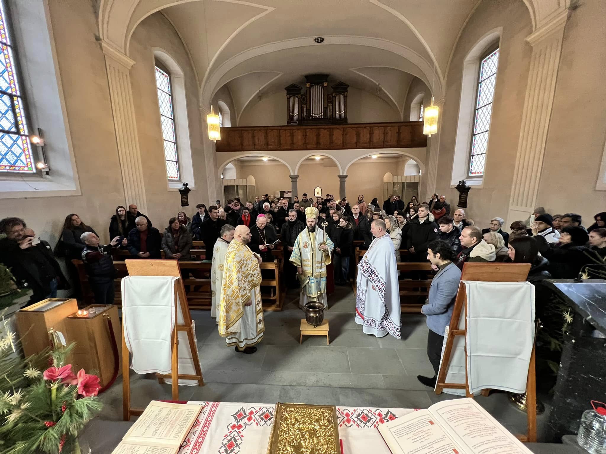 Am Sonntag, dem 12. Januar 2025, besuchte Seine Eminenz Metropolit Arsenios von Austria im Rahmen seiner Pastoralreise durch Westösterreich die Stadt Bregenz, wo er der Erzbischöflichen Liturgie in der Gemeinde der Heiligen Drei Hierarchen vorstand. Ökonom Stavrofor Nebojsa Grdinic, Gemeindevorsteher aus Innsbruck, Presbyter Vadim Karpenko aus Lindau und Ovidiu Cozma aus Feldkirch begleiteten den Metropoliten liturgisch. Bei der Göttlichen Liturgie war auch der Römisch-katholische Bischof von Feldkirch Benno Elbs anwesend und zu der Wasserweihe kamen auch Erzpriester Goran Eric aus Bregenz und Priester Nikola Balovic aus Feldkirch. Anschließend begaben sich alle an den Strand des Bodensees, wo Metropolit Arsenios das Wasser mit einem Kreuz segnete. Schließlich gab es ein gemeinsames Essen, bei dem der Metropolit die Wasilopitta der Gemeinde segnete.