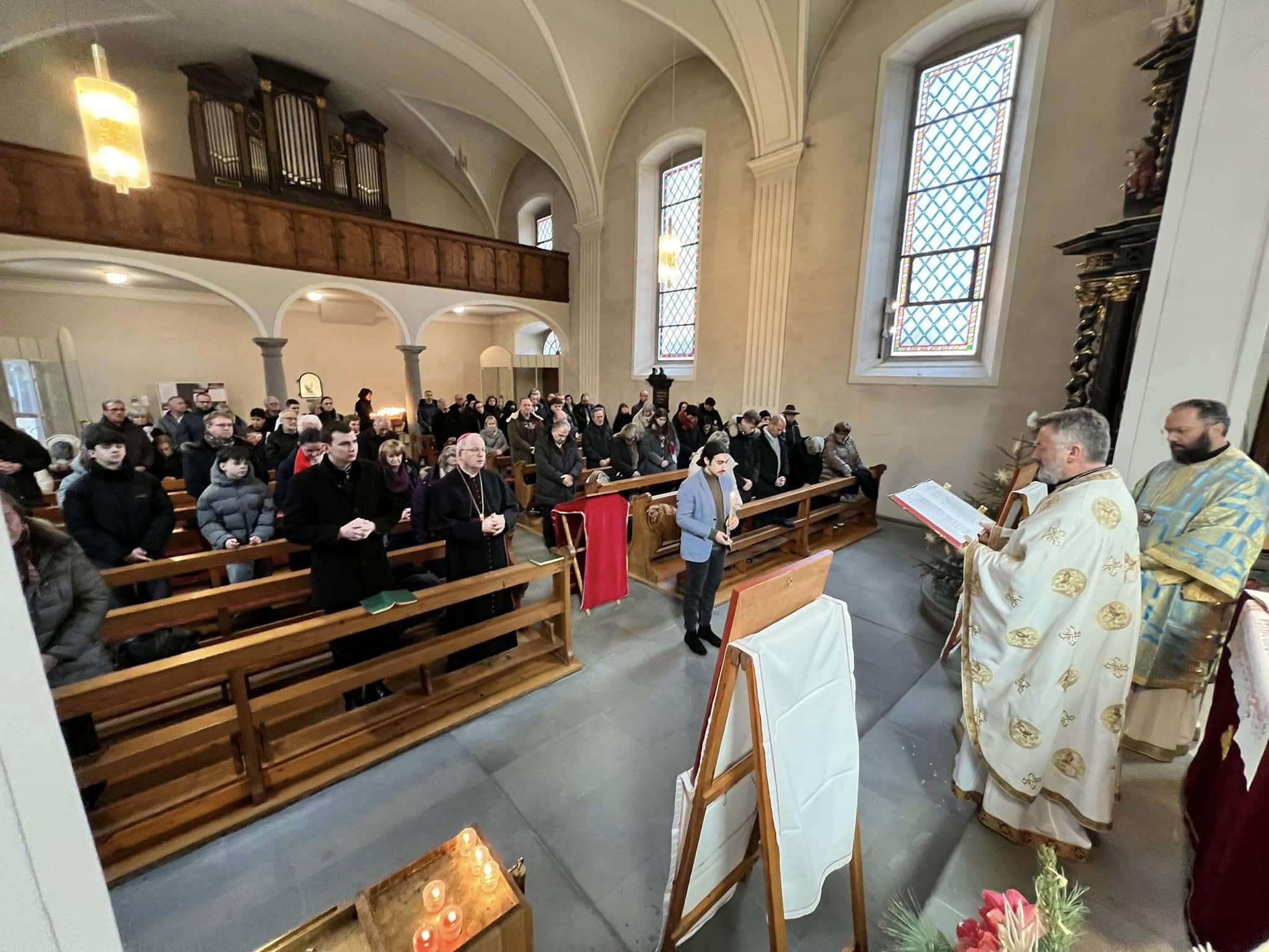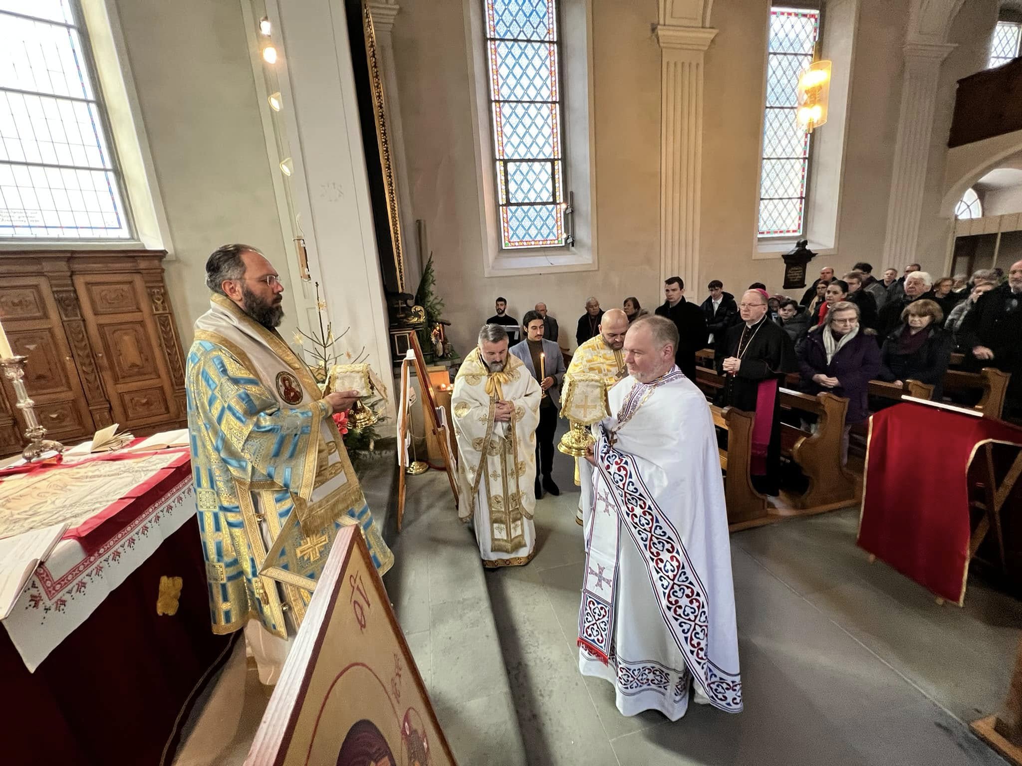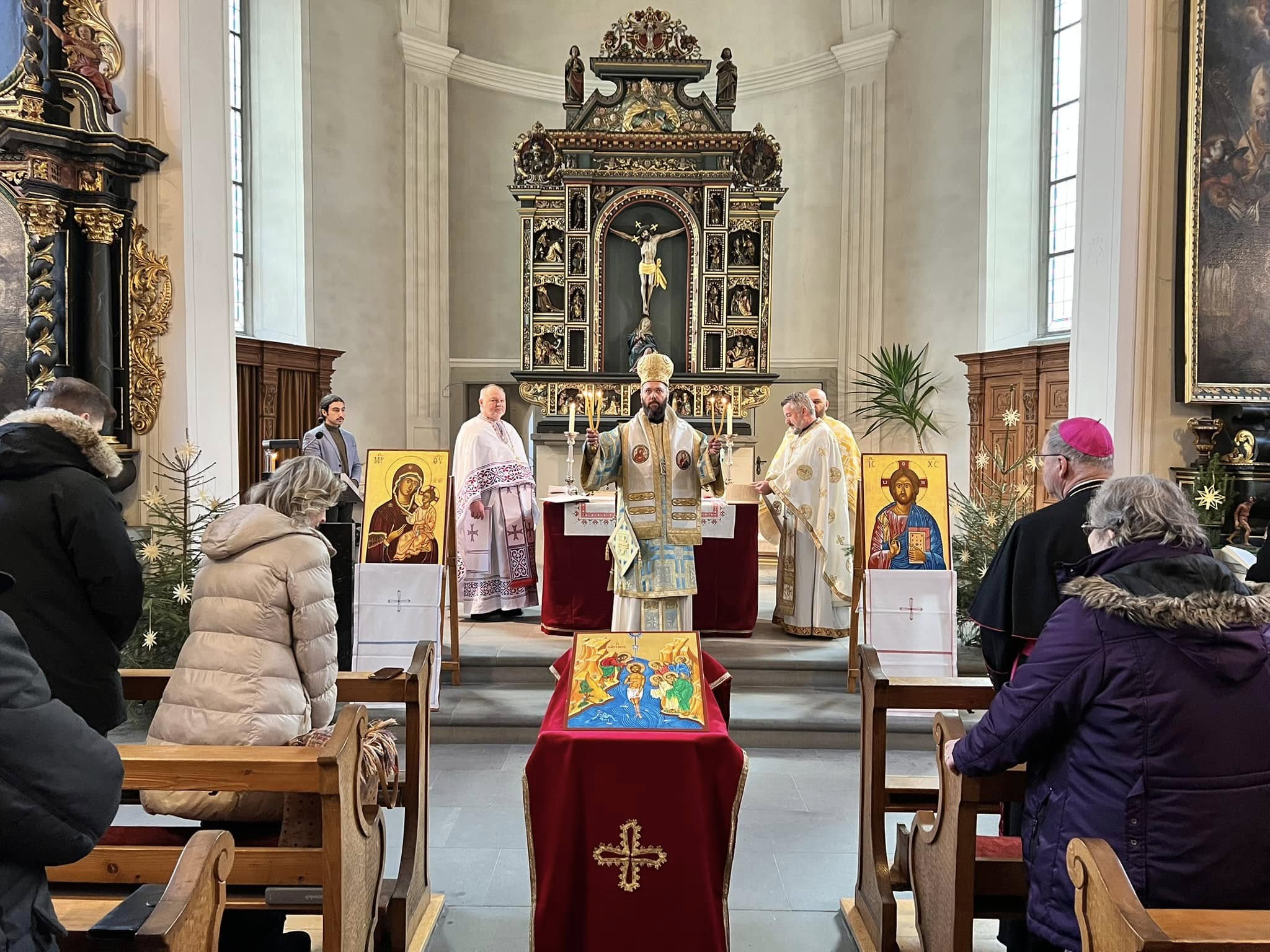 Nach der Göttlichen Liturgie bedankte sich Metropolit Arsenios beim römisch-katholischen Bischof Benno Elbs für die gastfreundliche Bereitstellung der Seekapelle und übergab ihm das Wort. In seinem Grußwort sprach Bischof Elbs über die Bedeutung der Epiphanie, bei der wir die Erscheinung der Heiligen Dreifaltigkeit feiern. Er betonte auch die Wichtigkeit der Taufe für die Erlösung des Menschen.