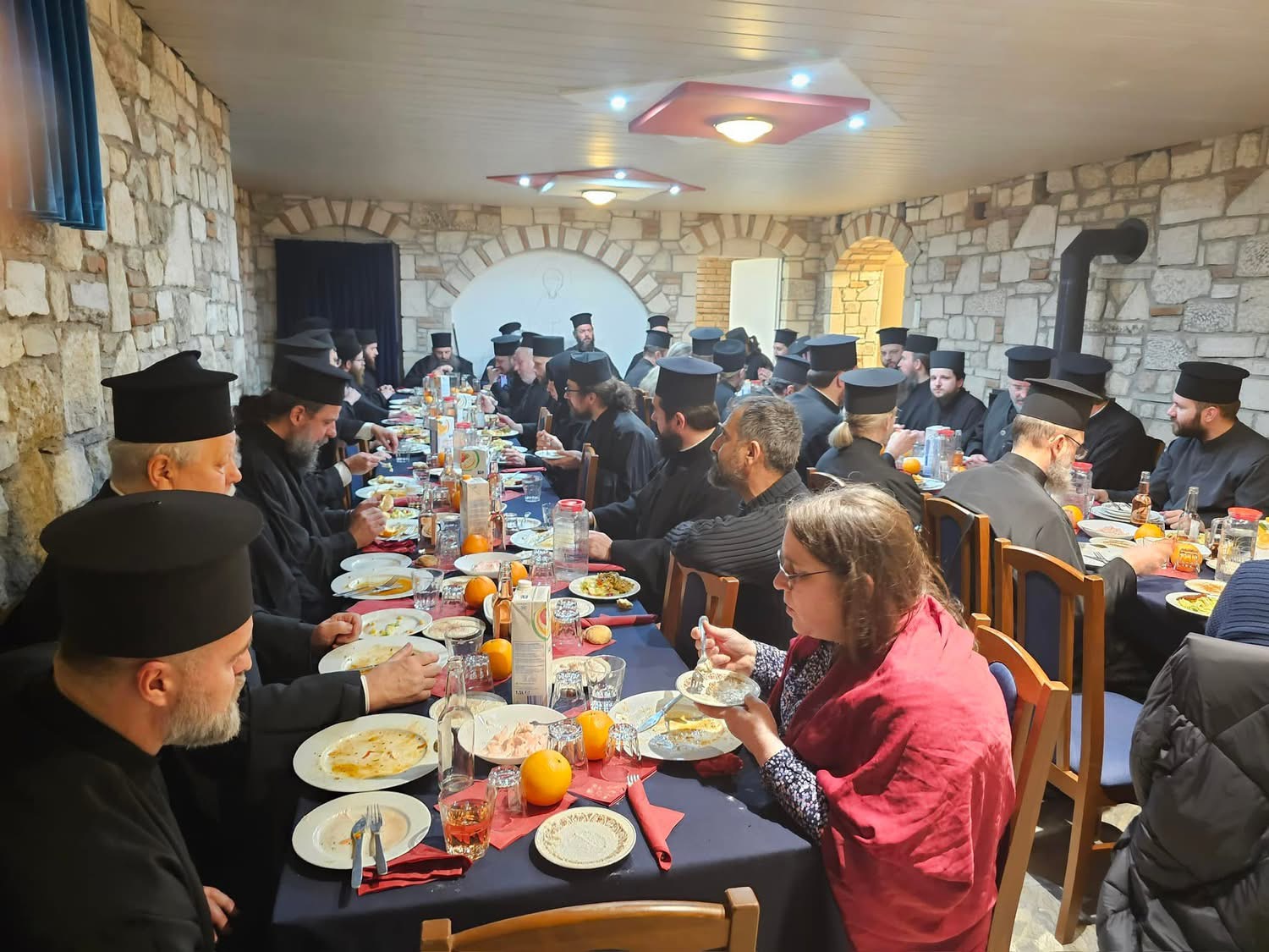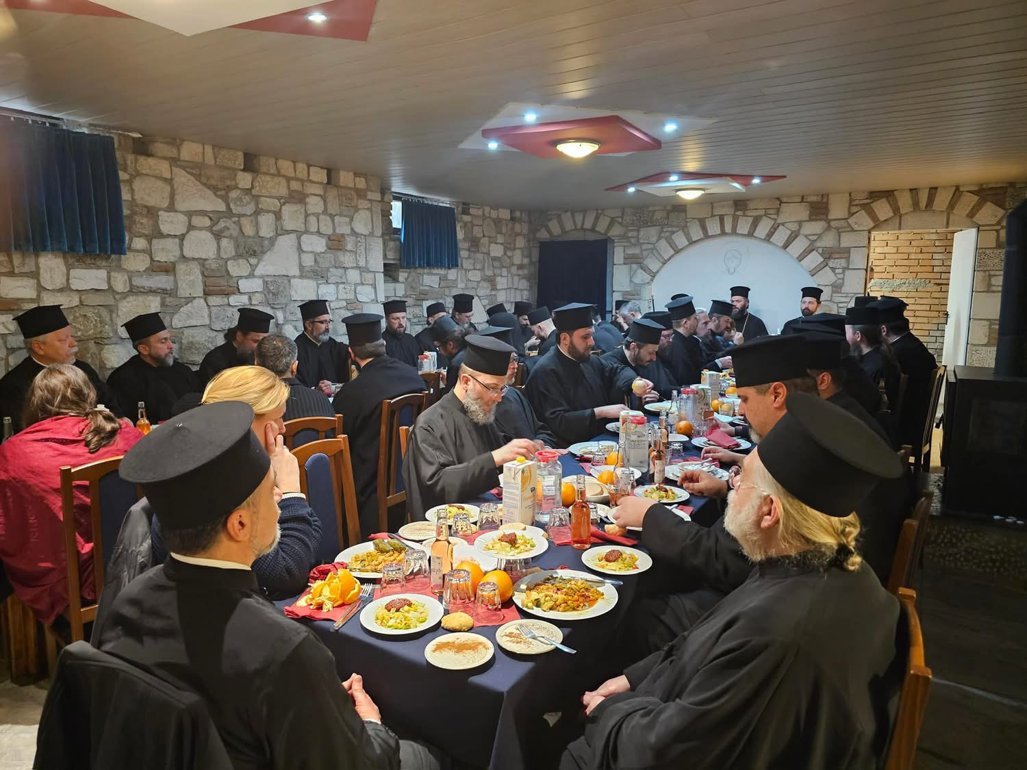 Am Morgen begann die Synaxis mit dem Orthros und der Erzbischöflichen Göttlichen Liturgie, bei der Seine Eminenz begleitet von Abt Nifon liturgischer Vorsteher war. Danach begaben sie sich in den Klostersaal, wo Metropolit Arsenios die Synode eröffnete und dem Referenten das Wort erteilte. Die 40 Priester und Mönche der Metropolis zeigten sich vom Thema bewegt und die Ausführungen des Abtes deckten ein breites Themenspektrum ab, wobei die Priester heute vor großen Herausforderungen stehen. Es wurden konstruktive Fragen gestellt und eine lebhafte Diskussion geführt.