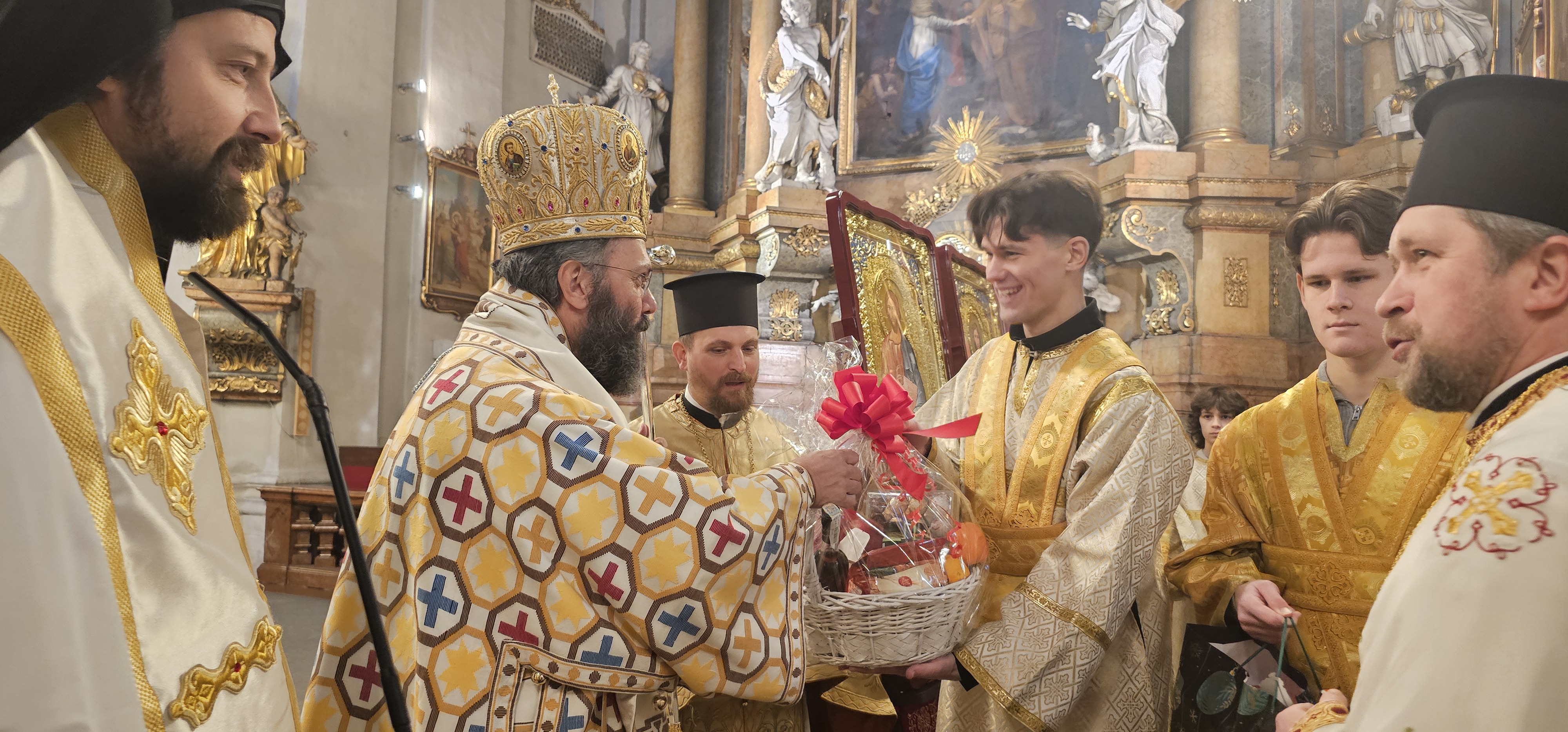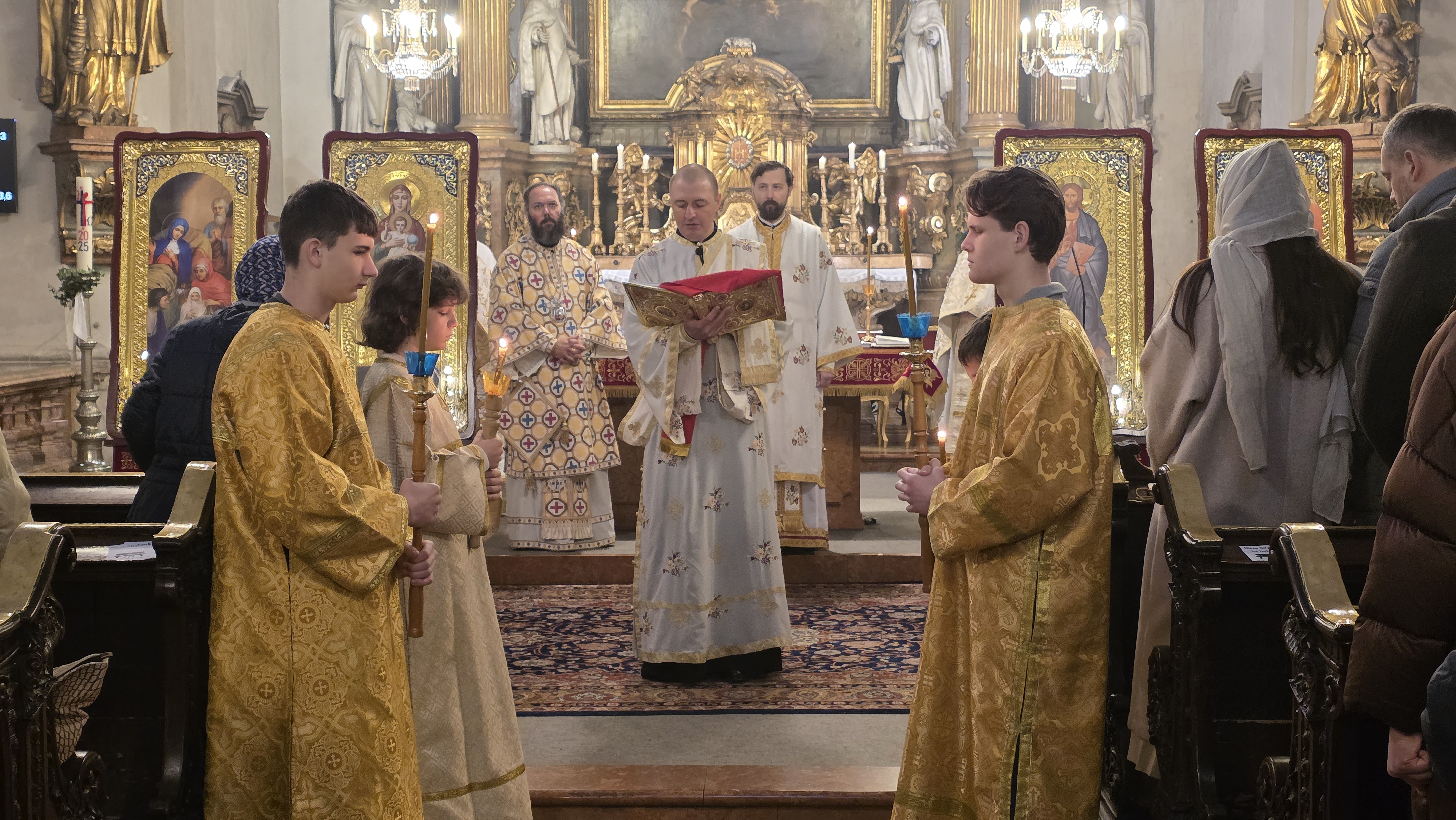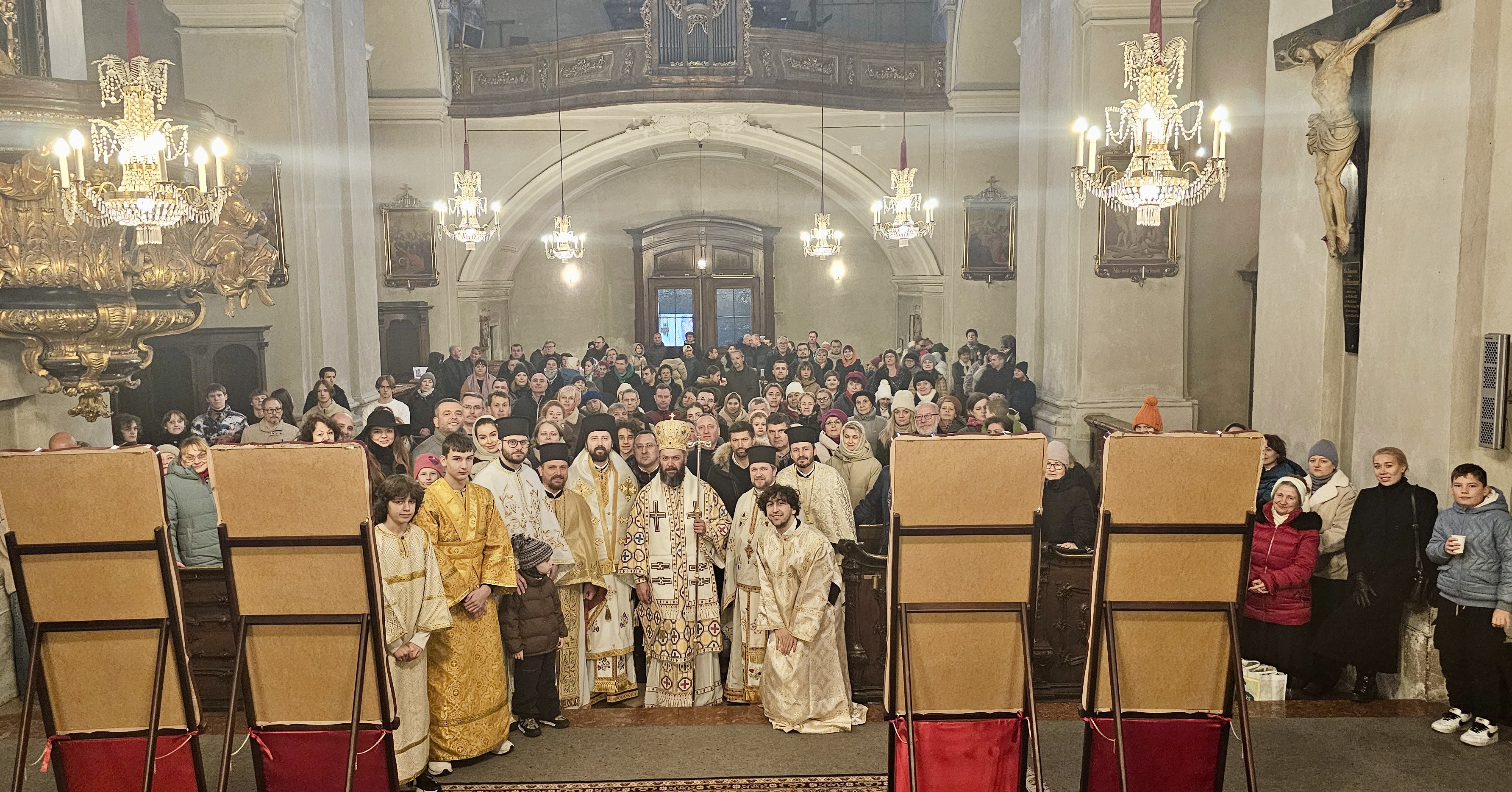 Vor der Entlassung betete Seine Eminenz für die Einstellung der Kampfhandlungen und das Herrschen des Friedens in der Ukraine und drückte seine Unterstützung für die Familien und Angehörigen der Opfer des ungerechten Krieges aus. Im Anschluss nahm er die Erhebung von Vater Yuri Strugov, der vor zehn Jahren mit seinem Segen den Aufbau der ersten ukrainischsprachigen Gemeinde in Wien begann, zum Erzpriester vor und ernannte ihn zum Bischofsvikar der ukrainischsprachigen Gemeinden der Metropolis, um Bischof Maximos bei seinem Werk zu unterstützen. Am Ende der Göttlichen Liturgie weihte Seine Eminenz Hypodiakone für den Dienst im Altar. Es folgten ein festlicher Empfang und ein Weihnachtskonzert mit aktuellen Hymnen in den Räumlichkeiten der Gemeinde.