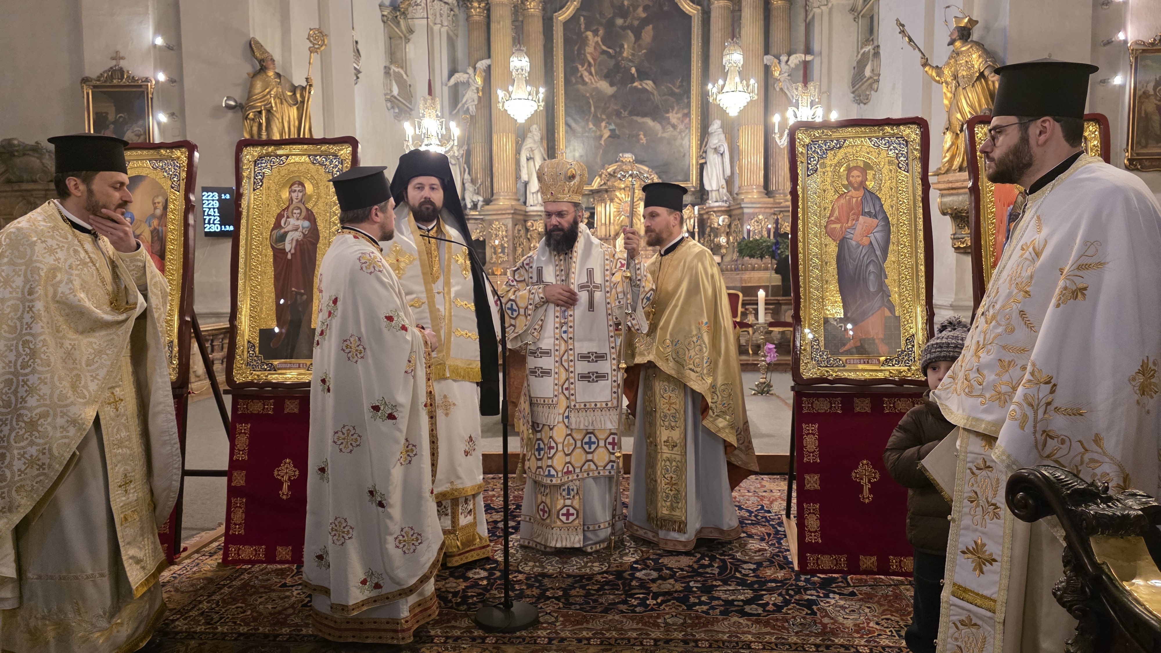Am Sonntag, den 14. Dezember, stand Seine Eminenz Metropolit Arsenios von Austria, Exarch von Ungarn und Mitteleuropa, der Erzbischöflichen Göttlichen Liturgie in der ukrainischsprachigen Kirchengemeinde des Heiligen Wladimir und der Heiligen Olga in Wien vor. Mit Seiner Eminenz konzelebrierten Seine Exzellenz Bischof Maximos von Aristi, der Gemeindevorsteher Oikonomos Nikolaj Lesjuk, die Priester Jurij Strugov, Kornilij Khrushsch, Nikita Magalas und Diakon Johannes Chornoknysch, in Anwesenheit zahlreicher Gläubiger. Vor seiner Entlassung ernannte Seine Eminenz P. Yuri zum Protopresbyter und bestellte ihn zum Bischofsvikar für die ukrainischsprachigen Gemeinden. Am Ende der Göttlichen Liturgie segnete Seine Eminenz die Diakone des Heiligen für den kirchlichen Dienst. Anschließend fand ein festliches Weihnachtskonzert statt.