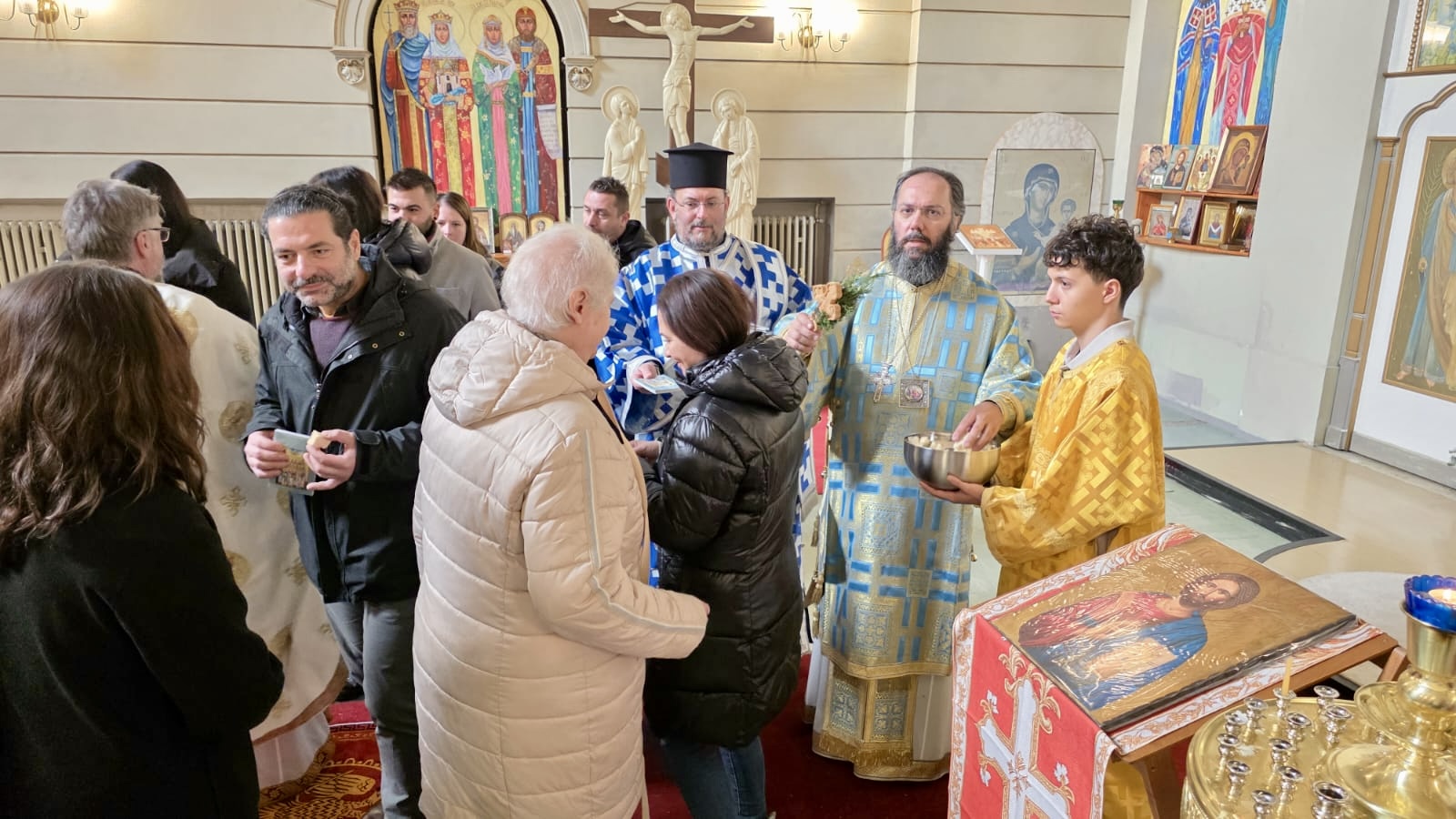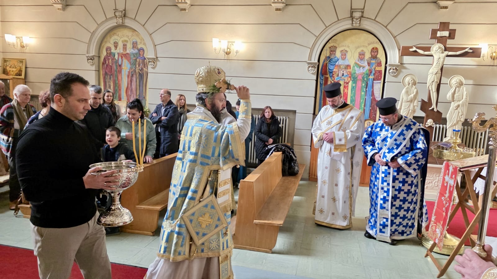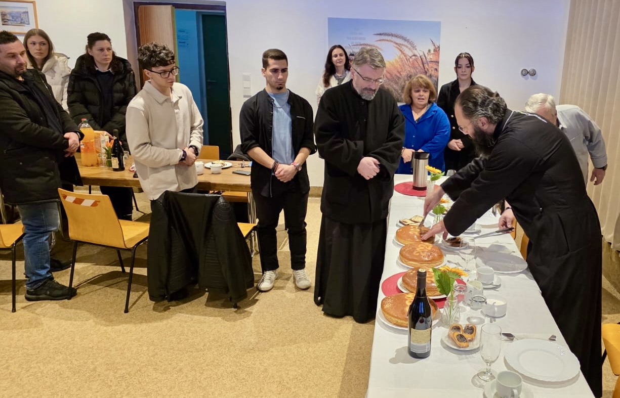 Nach dem Ende der Göttlichen Liturgie wurde die Große Wasserweihe zelebriert, gefolgt von einem Treffen im Gemeindezentrum, wo Seine Eminenz die Vasilopita segnete und Wünsche mit den Gläubigen austauschte. Das Fest klang mit einem festlichen Mahl aus, an dem Seine Eminenz und alle Gläubigen in einer Atmosphäre der Freude und Einheit teilnahmen.
