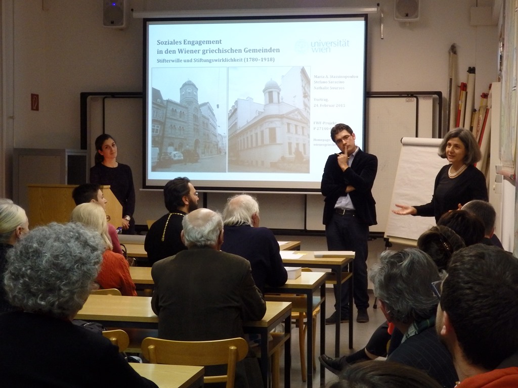 Am Dienstag, 25. Februar, lud Frau Professor Dr. Maria Stassinopoulou namens des Instituts für Byzantinistik und Neogräzistik der Universität Wien zu einem Vortragsabend mit dem Titel „Soziales Engagement in den Wiener Griechischen Gemeinden: Stifterwillen und Stiftungs-wirklichkeiten (1780-1918)“ im Rahmen der Österreichischen Gesellschaft für Neugriechische Studien ein. Präsentiert wurden erste wissenschaftliche Resultate des dreijährigen FWF-Projektes „ Soziales Engagement in den Wiener griechischen Gemeinden (18.-20. Jh.), das seit November 2014 unter der Leitung von Frau Professor Stassinopoulou an der Universität Wien betrieben wird und maßgeblich auf dem bedeutenden Archivmaterial der griechischen Kirchengemeinden zum Heiligen Georg und zur Heiligen Dreifaltigkeit basiert.