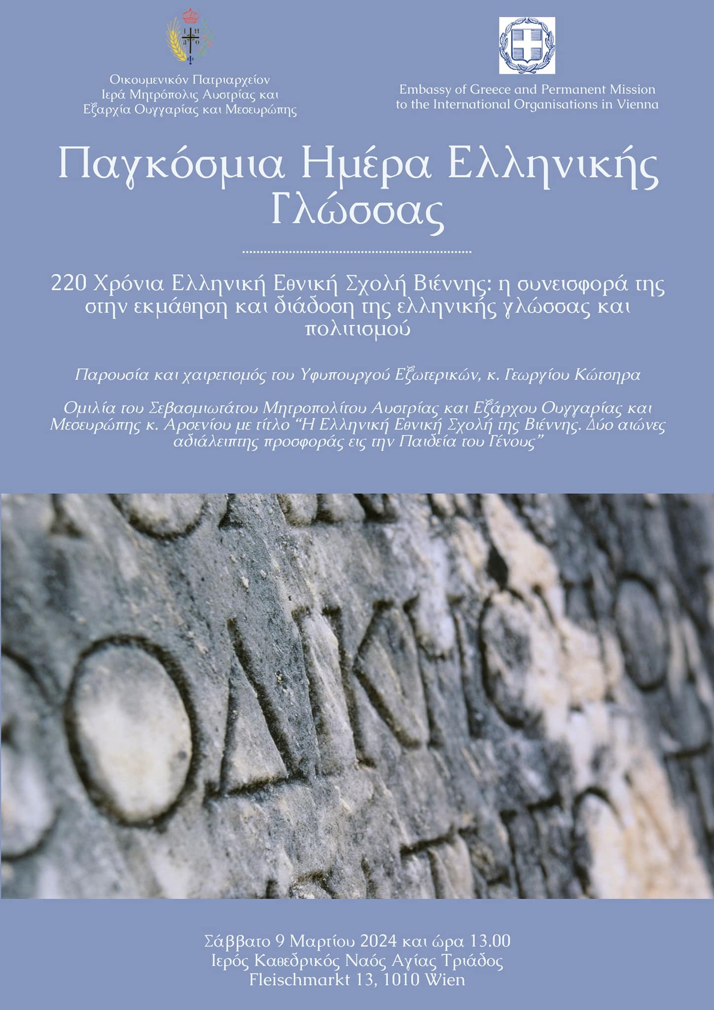 Seine Eminenz Metropolit Arsenios von Austria, Exarch von Ungarn und Mitteleuropa, lädt in seiner Funktion als Schulleiter der Griechischen Nationalschule in Wien zu einer Veranstaltung anlässlich des Welttages griechischer Sprache mit dem Thema „220 Jahre Griechische Nationalschule in Wien: Ihr Beitrag zum Erlernen und zur Verbreitung der griechischen Sprache und Kultur“ am Samstag, den 9. März 2024 um 13.00 Uhr in die Kathedrale zur Heiligen Dreifaltigkeit in Wien ein.