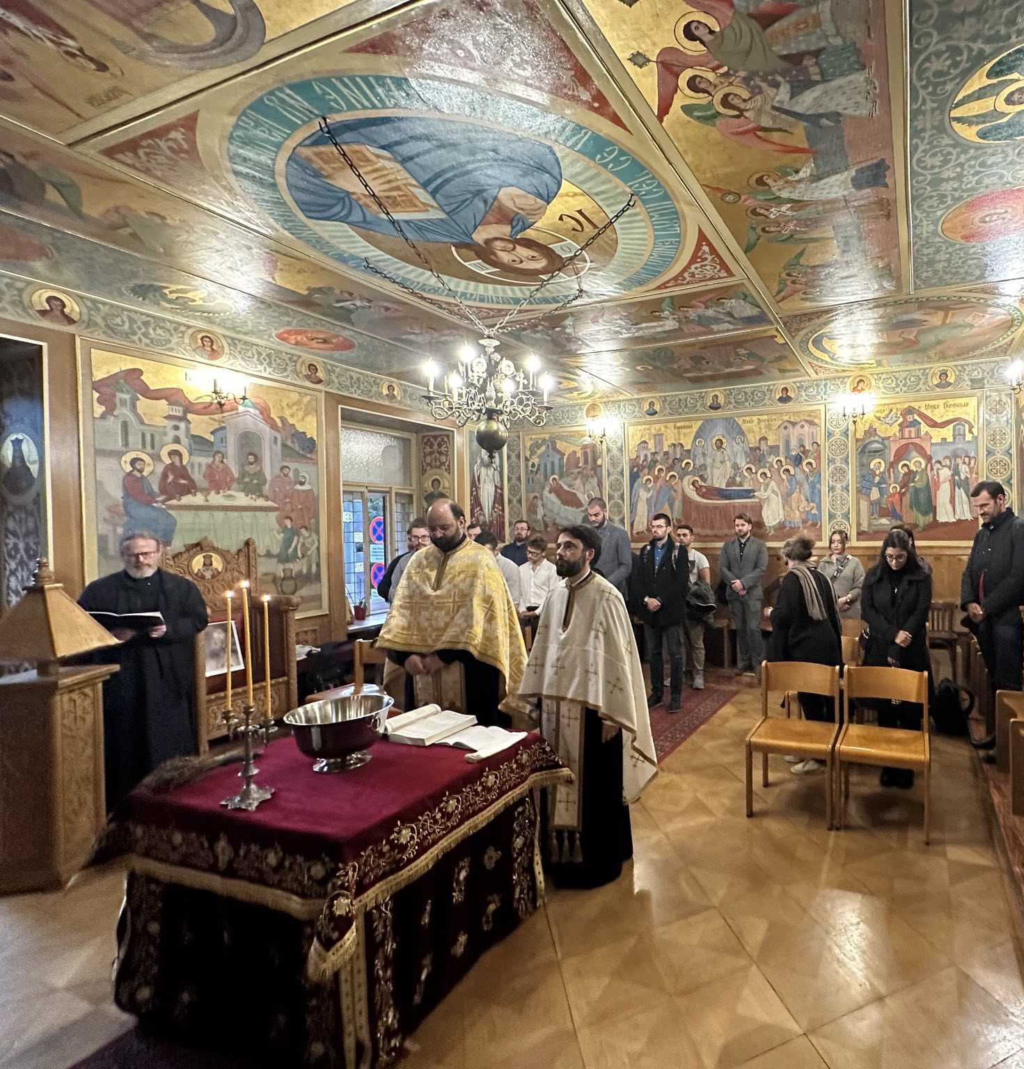 Studierende verschiedener Studiengänge und auch einige Professoren fanden sich am 10. Oktober 2023 um 18.00 Uhr in der rumänisch-orthodoxen Kapelle in der Löwelstraße 8 ein, um miteinander Gott zu Beginn des Semesters zu ehren und um Seinen Beistand für das neue Semester zu bitten. Priester Ioan Moga, Professor für Orthodoxe Dogmatik an der Universität Wien und Verantwortlicher für die neuen Bachelor- und Masterstudiengänge Orthodoxe Religionspädagogik, hatte den Gottesdienst organisiert und zelebrierte ihn gemeinsam mit Priester Athanasius Buk, der in Vertretung des Metropoliten Arsenios gekommen war.
