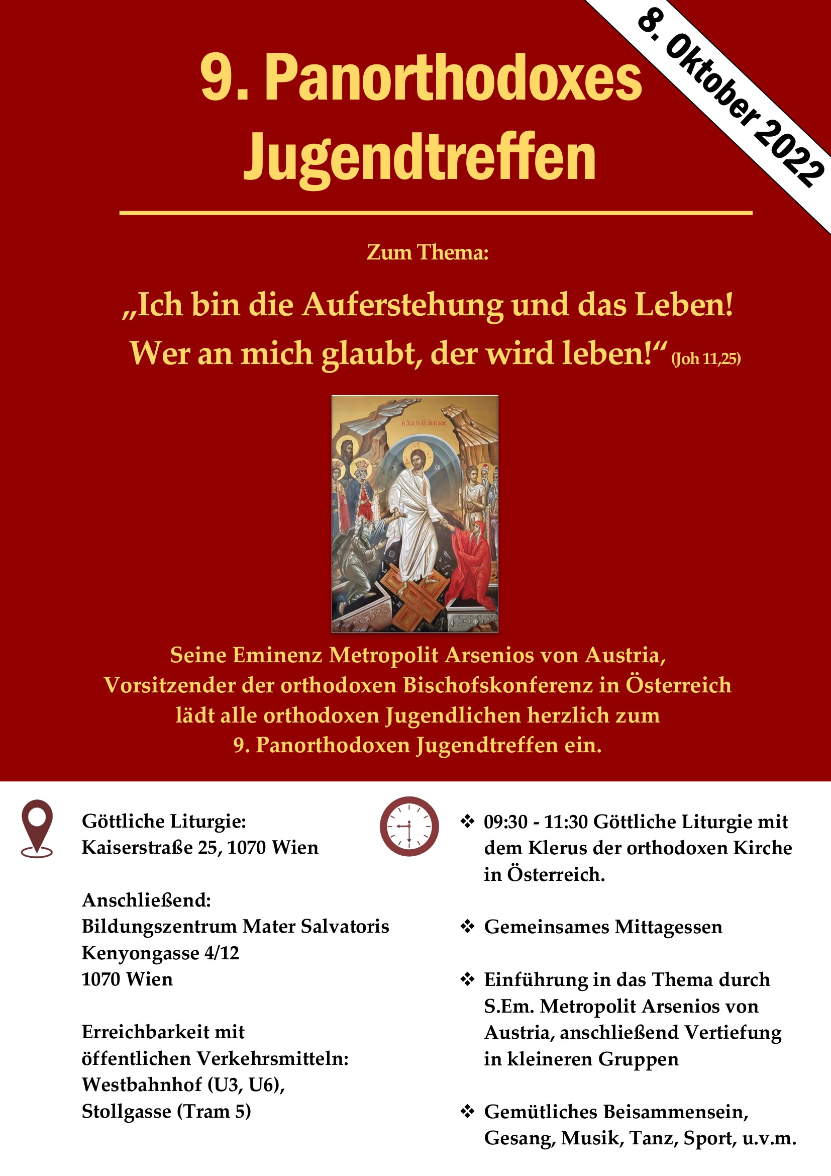Die Metropolis von Austria freut sich, nach zwei jahren pandemiebedingter Pause, zur insgesamt neuten Ausgabe des Panorthodoxen Jugendtreffens einzuladen. Am 8. Oktober 2022 sind alle Kinder und Jugendlichen eingeladen, sich mit dem Thema der Auferstehung und des ewigen Lebens auseinanderzusetzen sowie den Geist der orthodoxen Gemeinschaft beim gemütlichen Zusammensein, bei Sport, Tanz und Spiel zu erleben.