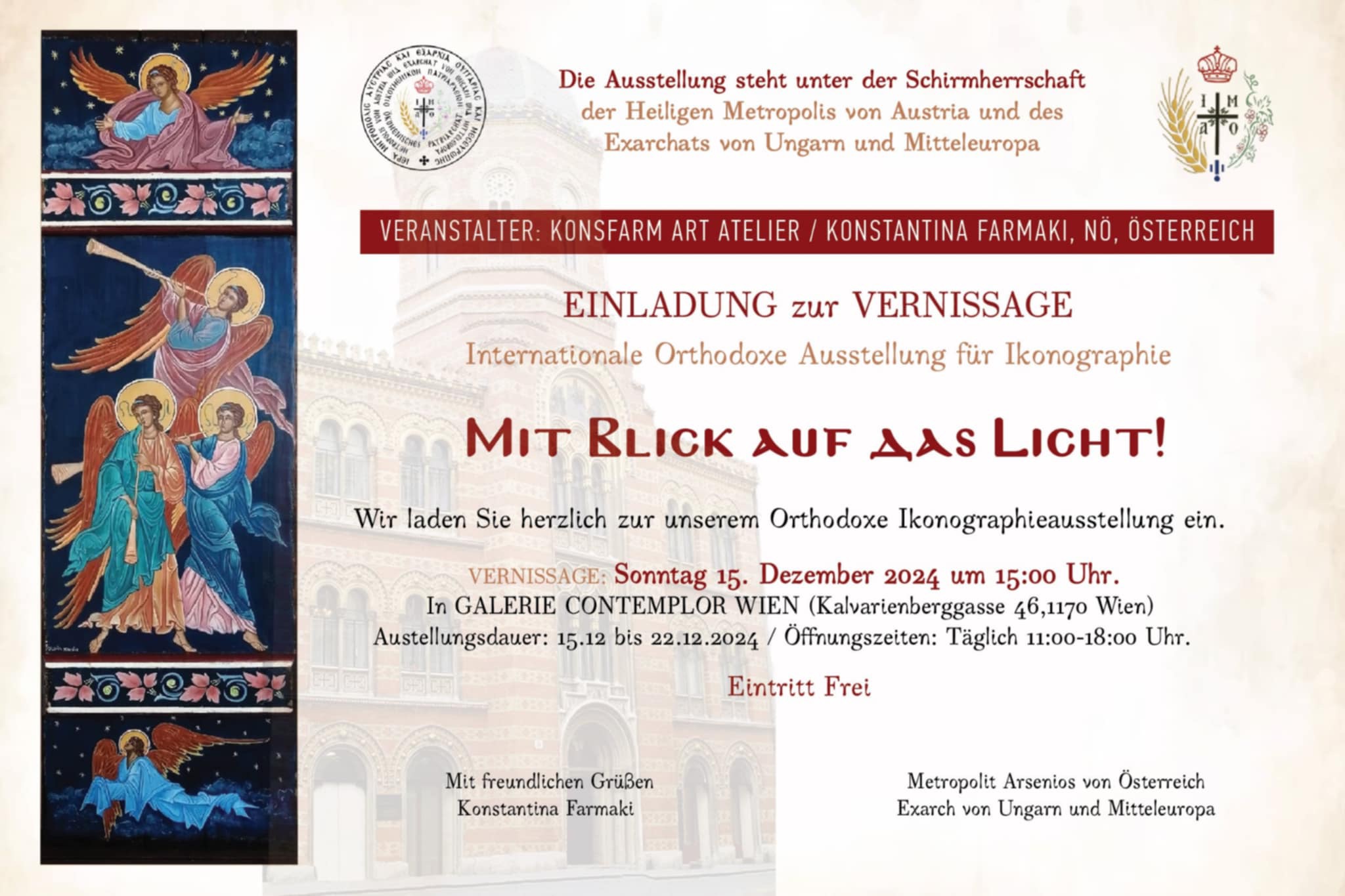 Am Sonntag, den 15. Dezember um 15 Uhr wird die Internationale Hagiographie Ausstellung feierlich eröffnet, die vom Konsfarm Art Atelier unter der Leitung von Frau Konstantina Farmaki organisiert wurde. Die Ausstellung steht unter der Schirmherrschaft der Metropolis of Austria und ist bis 22. Dezember täglich von 11 bis 18 Uhr in der Galerie Contemplor Wien (Kalvarienberggasse 46, 1170 Wien) zu sehen.