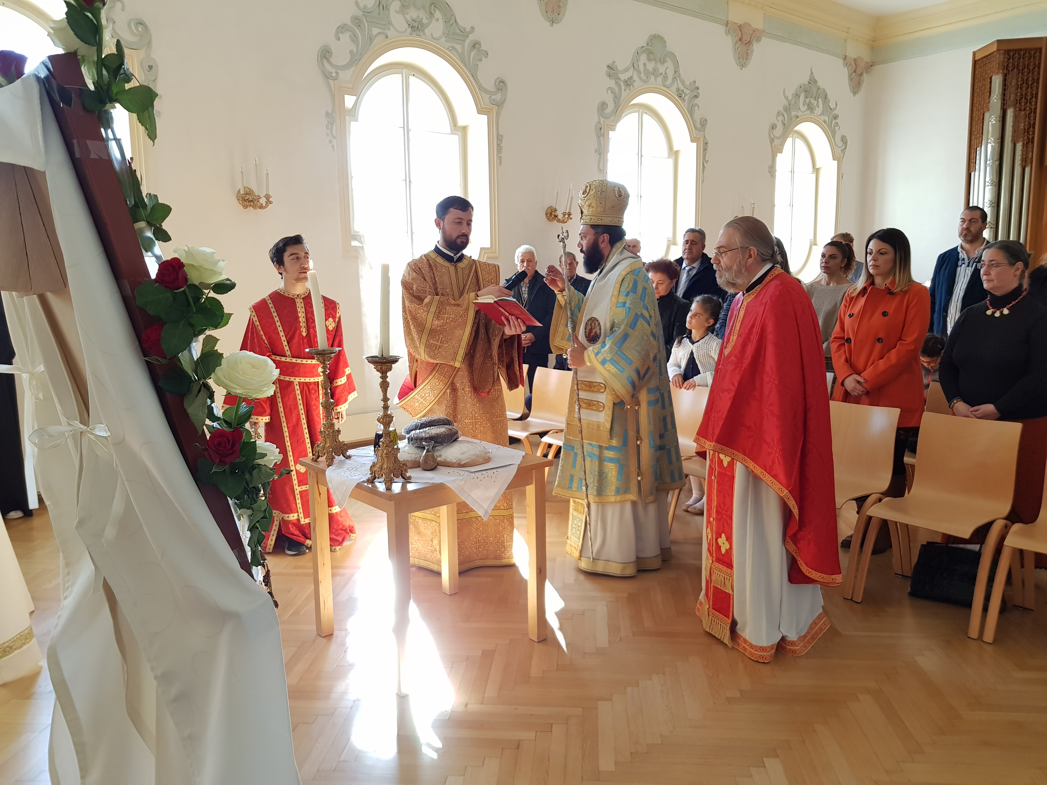 Μετά τό πέρας τῆς Θείας Λειτουργίας τελέστηκε ἡ Ἀκολουθία τῆς Ἀρτοκλασίας, ὅπου ὁ Σεπτός Ποιμενάρχης μας καί ἡ καθόλου Ἐνορία, πού προσέφερε τούς ἄρτους, προσευχήθηκαν γιά νά εὐλογηθοῦν ὄχι μόνον τά μέλη της, ἀλλά καί σύμπας ὁ λαός τοῦ κρατιδίου τοῦ Salzburg. Ἀκολούθησε ἑόρτια τράπεζα, ὅπου οἱ πιστοί εἶχαν τήν εὐκαρία νά συνομιλήσουν μέ τόν Σεβασμιώτατο Μητροπολίτη μας καί νά λάβουν τήν εὐλογία του. Ὁ Σεπτός Ποιμενάρχης μας μοίρασε, μέ τήν εὐκαιρία αὐτή, δῶρα στά παιδιά τοῦ Κατηχητικοῦ Σχολείου εὐχόμενος νά ἔχουν καλή πρόοδο, ἐνῶ πρίν τήν ἀναχώρησή του ἐξέφρασε τήν βεβαιότητά του, ὅτι συντόμως θά ἔλθει ἡ εὐλογημένη ὥρα νά ἀποκτήσει ἡ Ἐνορία τοῦ Salzburg τόν δικό της χῶρο προσευχῆς.