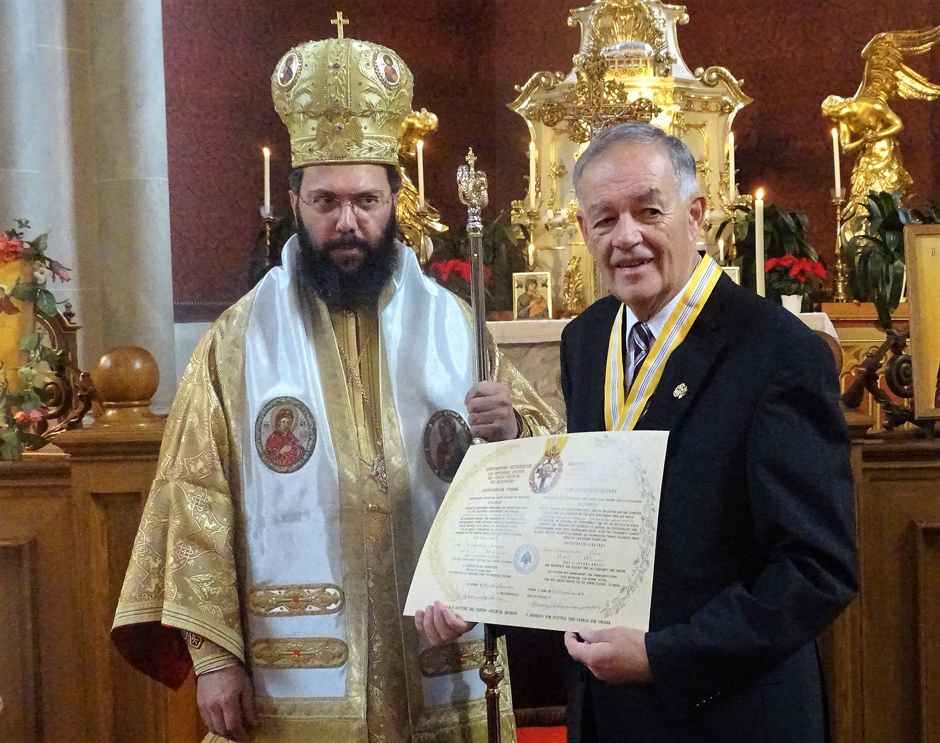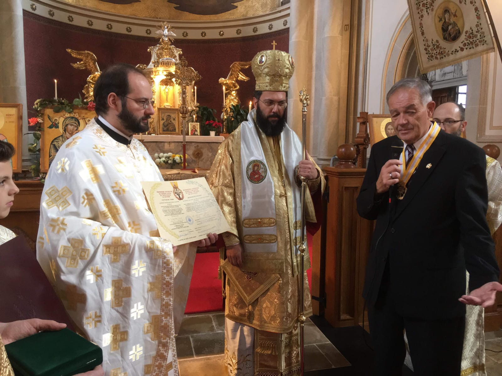 Μετά τό πέρας τῆς Θείας Λειτουργίας ὁ Σεβασμιώτατος Ποιμενάρχης μας ἀπένειμε, ὡς προαναφέραμε, τόν τόν Ἀργυροῦν Σταυρόν Ἀξίας τῆς Ἱερᾶς Μητροπόλεως Αὐστρίας στόν κ. Karl Mlinar, ὁ ὁποῖος διακρίθηκε γιά τήν πολυετή προσφορά καί σημαντική διακονία του σχετικῶς μέ τήν συντήρηση καί διατήρηση τοῦ καθόλου κτηριακοῦ συγκροτήματος, ὅπου στεγάζεται ἡ Ἐνορία μας στό Leoben τῆς Στυρίας. Εὐχαριστίες ἐξέφρασε ὁ Σεβασμιώτατος Μητροπολίτης μας ἐπίσης πρός τήν σύζυγο τοῦ τιμηθέντος Ἐπιτρόπου καί στούς στενούς συνεργάτες τοῦ ζεύγους, οἱ ὁποῖοι μέ τήν ἀγάπη τους στηρίζουν διαχρονικά τήν λειτουργική ζωή τῆς ὡς ἄνω Ἐνορίας εὐχόμενος ὁ Παλαιός τῶν ἡμερῶν νά τούς εὐλογεῖ καί νά τούς χαριτώνει διαρκῶς, ὥστε καί μελλοντικῶς νά δεικνύουν τόν ἴδιο ζῆλο καί τήν ἴδια ἀγάπη στήν Ἐνορία μας πρός δόξαν Θεοῦ καί τῆς Ἐκκλησίας του.