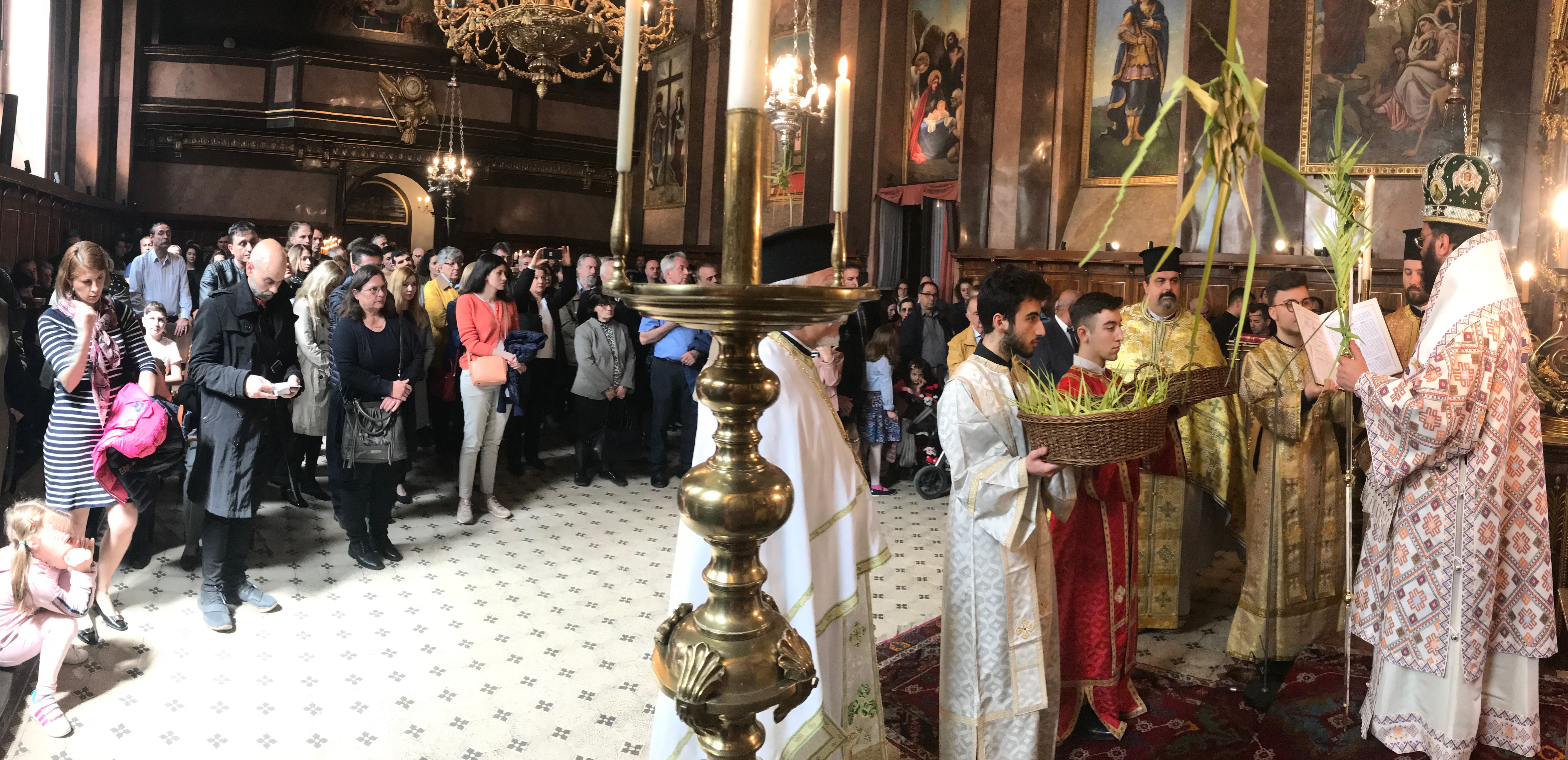 Τήν Κυριακή τῶν Βαΐων, ἤτοι στίς 21 Ἀπριλίου ἐ.ἔ., ὁ Σεβασμιώτατος Μητροπολίτης Αὐστρίας, Ὑπέρτιμος καί Ἔξαρχος Οὑγγαρίας καί Μεσευρώπης κ. Ἀρσένιος προέστη στόν λαμπροστόλιστο μέ βάϊα φοινίκων Ἱ.Ν. Ἁγίου Γεωργίου στή Βιέννη τῆς Θείας Λειτουργίας πλαισιούμενος ὑπό τοῦ Γενικοῦ Ἀρχιερατικοῦ Ἐπιτρόπου καί Πρωτοπρεσβυτέρου τοῦ Οἰκουμενικοῦ Θρόνου Ἰωάννου Νικολίτση, τοῦ Πρωτοπρεσβυτέρου Ἀλεξάνδρου Lapin καί τοῦ Ἀρχιδιακόνου Μαξίμου Rudko.