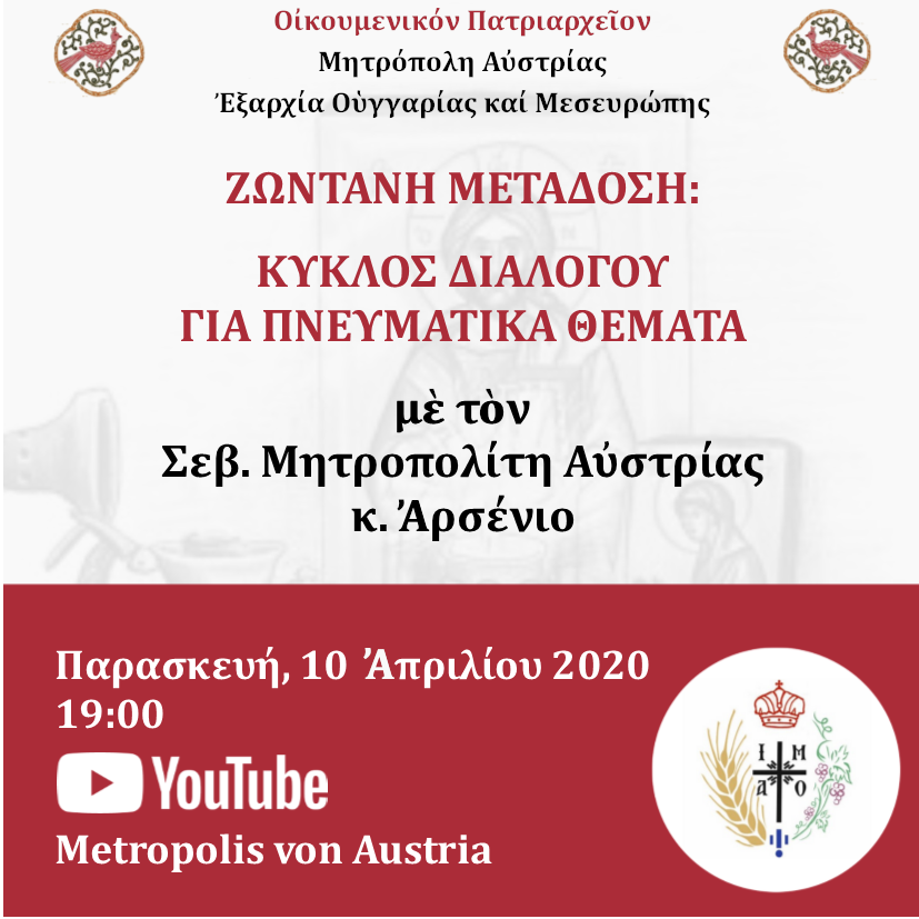Την προσεχή Παρασκευή 10 Απριλίου 2020, στο γνωστό δίαυλο του YouTube στη σελίδα του Facebook της Ι. Μητροπόλεως Αυστρίας, θα λάβει χώρα ένας κύκλος ζωντανού διαλόγου με το Σεβασμιώτατο Μητροπολίτη Αυστρίας κ. Αρσένιο. Στα πλαίσια αυτής της εκδήλωσης δίνεται η ευκαιρία να υποβάλετε μέσω messenger προς τον Σεβασμιώτατο Μητροπολίτη ερωτήσεις σχετικές με τα συζητούμενα πνευματικά θέματα. Σας προσκαλούμε λοιπόν εγκάρδια και χαιρόμαστε που έστω και με αυτόν τον τρόπο θα μπορέσουμε να συναντηθούμε.
