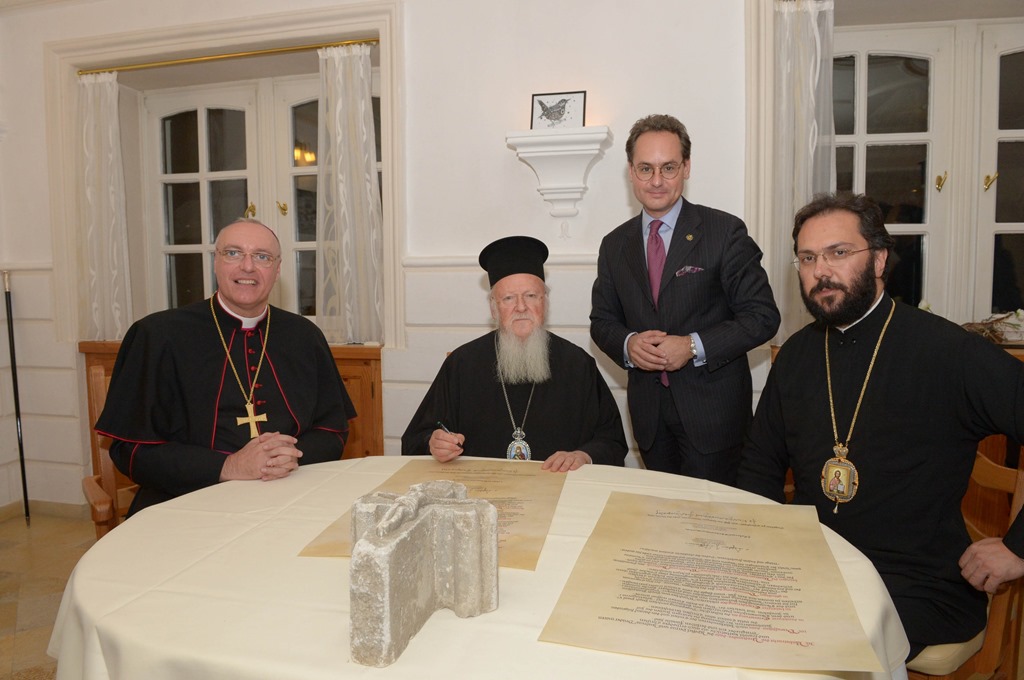 Τό βράδυ παρουσίᾳ τοῦ Παναγιωτάτου ὑπογράφηκε πανηγυρικά ἀπό τόν Ἐπίσκοπο Αἰγίδιο καί τόν Σεβ. Μητροπολίτη Αὐστρίας κ. Ἀρσένιο τό κτιτορικό πιτάκιο, διά τοῦ ὁποίου παραδίδεται ἐπίσημα τό οἰκόπεδο γιά τήν οἰκοδόμηση τῆς πρώτου Ὀρθοδόξου Μονῆς ἐν Αὐστρίᾳ.