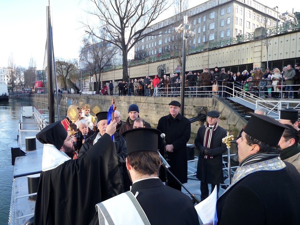 Στό παρακείμενο Donaukanal μετέβησαν στή συνέχεια ὅλοι γιά τήν τελετή τοῦ καθαγιασμοῦ τῶν ὑδάτων σύμφωνα μέ τήν παράδοση σέ εἰδικά διαμορφωμένη ἐξέδρα. Ὁ Σεβασμιώτατος ἀπεύθυνε λόγο μιλώντας γιά τήν ἱερότητητα τῆς δημιουργίας, τήν ὁποία οἱ ἄνθρωποι ξεχνοῦν μέ τίς ἁμαρτίες τους. Ἡ ἑορτή τῶν Θεοφανείων μᾶς θυμίζει τούς δεσμούς τοῦ ἀνθρώπου μέ τήν Δημιουργία, καθώς καί τήν ἀποκάλυψη τοῦ Τριαδικοῦ Θεοῦ, τοῦ Πατρός, τοῦ Υἱοῦ καί τοῦ Ἁγίου Πνεύματος. Ὁ Σεβασμιώτατος προέτρεψε τούς πιστούς νά προσέξουν τά σημεῖα τῶν καιρῶν μέ τίς μεγάλες φυσικές καταστροφές καί νά ἀλλάξουν τή στάση τους ἀπέναντι στή δημιουργία. Σέ μία ἀποστροφή τοῦ λόγου του ἀνέφερε: «Ἡ ἀνθρωπότητα, ἐμεῖς ὅλοι, εἴμαστε ὑπεύθυνοι γιά τή γῆ, στήν ὁποία μᾶς ἐπιτράπηκε νά ζήσουμε».