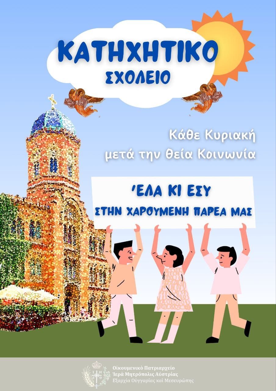 Μὲ πολλὴ χαρὰ γίνεται γνωστὸ στοὺς γονεῖς τῆς παροικίας μας στὴ Βιέννη ὅτι ξεκινᾶ τὸ νέο κατηχητικὸ ἔτος 2024-2025. Μὲ τὴν εὐλογία τοῦ Σεβασμιωτάτου Μητροπολίτου Αὐστρίας κ. Ἀρσενίου ξεκινοῦν οἱ κατηχητικὲς συνάξεις γιὰ τὰ παιδιὰ στὴ Βιέννη μετὰ τὴ θεία Κοινωνία.