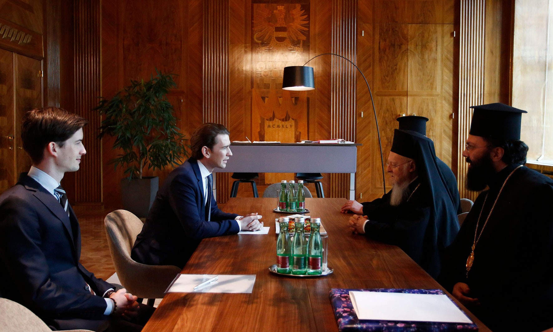 Στό πλαίσιο τῆς ἐπισήμου ἐπισκέψεώς του στήν Αὐστρία ἡ Αὐτοῦ Θειοτάτη Παναγιότητα καί Οἰκουμενικός Πατριάρχης κ.κ. Βαρθολομαῖος συνοδευόμενος ὑπό τοῦ Σεβασμιωτάτου Μητροπολίτου Γαλλίας, Ὑπερτίμου καί Ἐξάρχου Εὐρώπης κ. Ἐμμανουήλ καί τοῦ Σεβασμιωτάτου Μητροπολίτου Αὐστρίας, Ἐξάρχου Οὑγγαρίας καί Μεσευρώπης κ. Ἀρσενίου, συναντήθηκε στή Βιέννη μέ τόν Καγκελάριο τῆς Αὐστρίας κ. Sebastian Kurz.